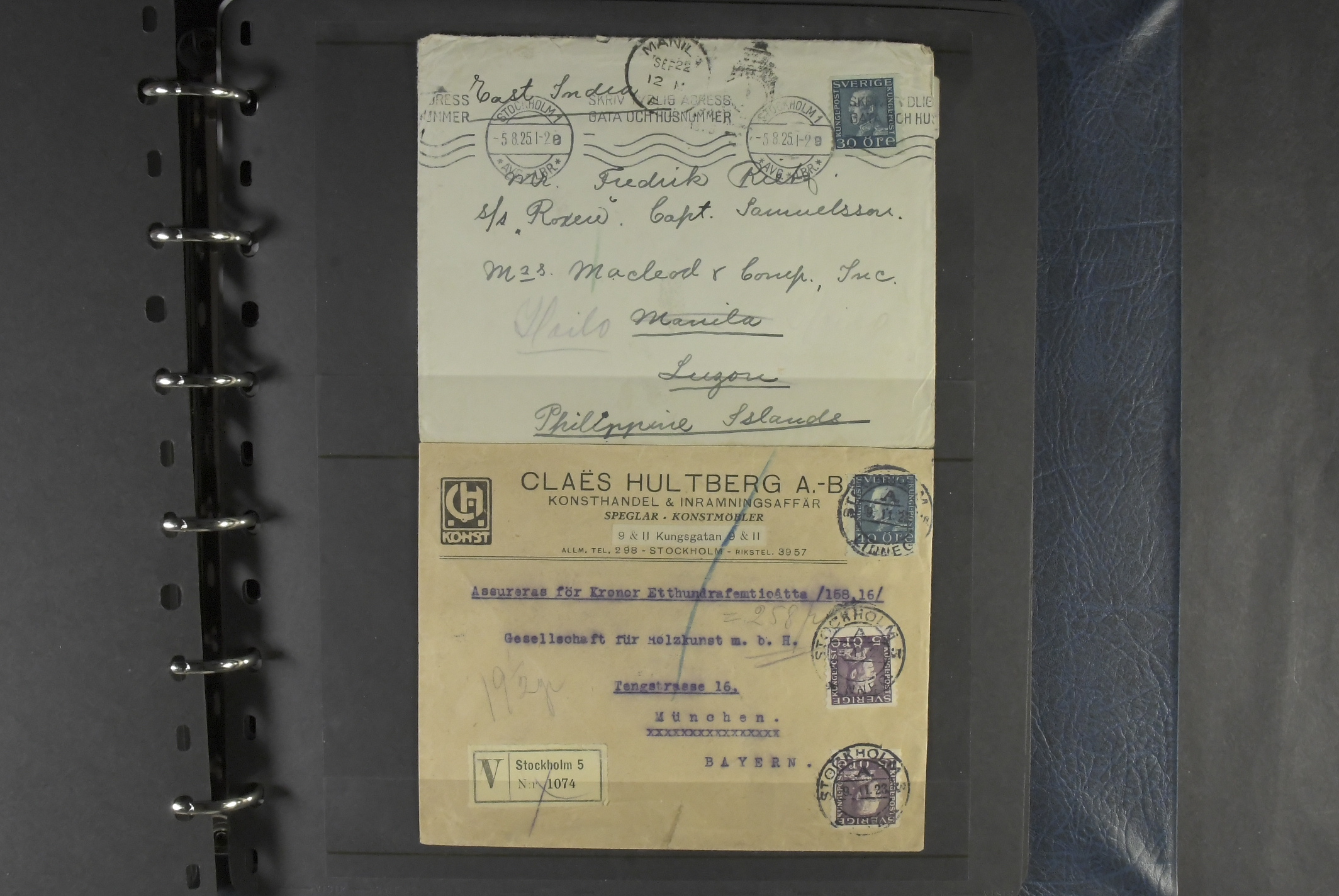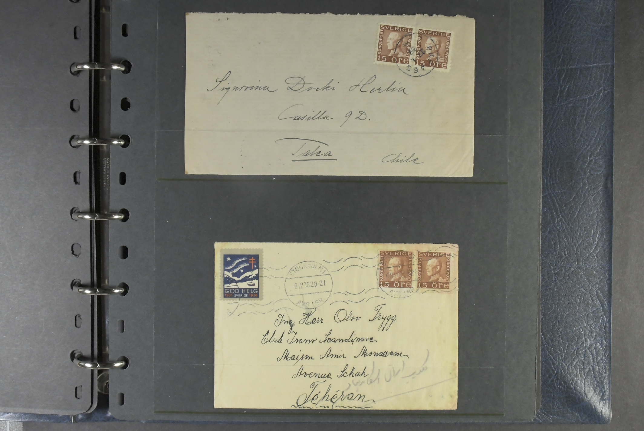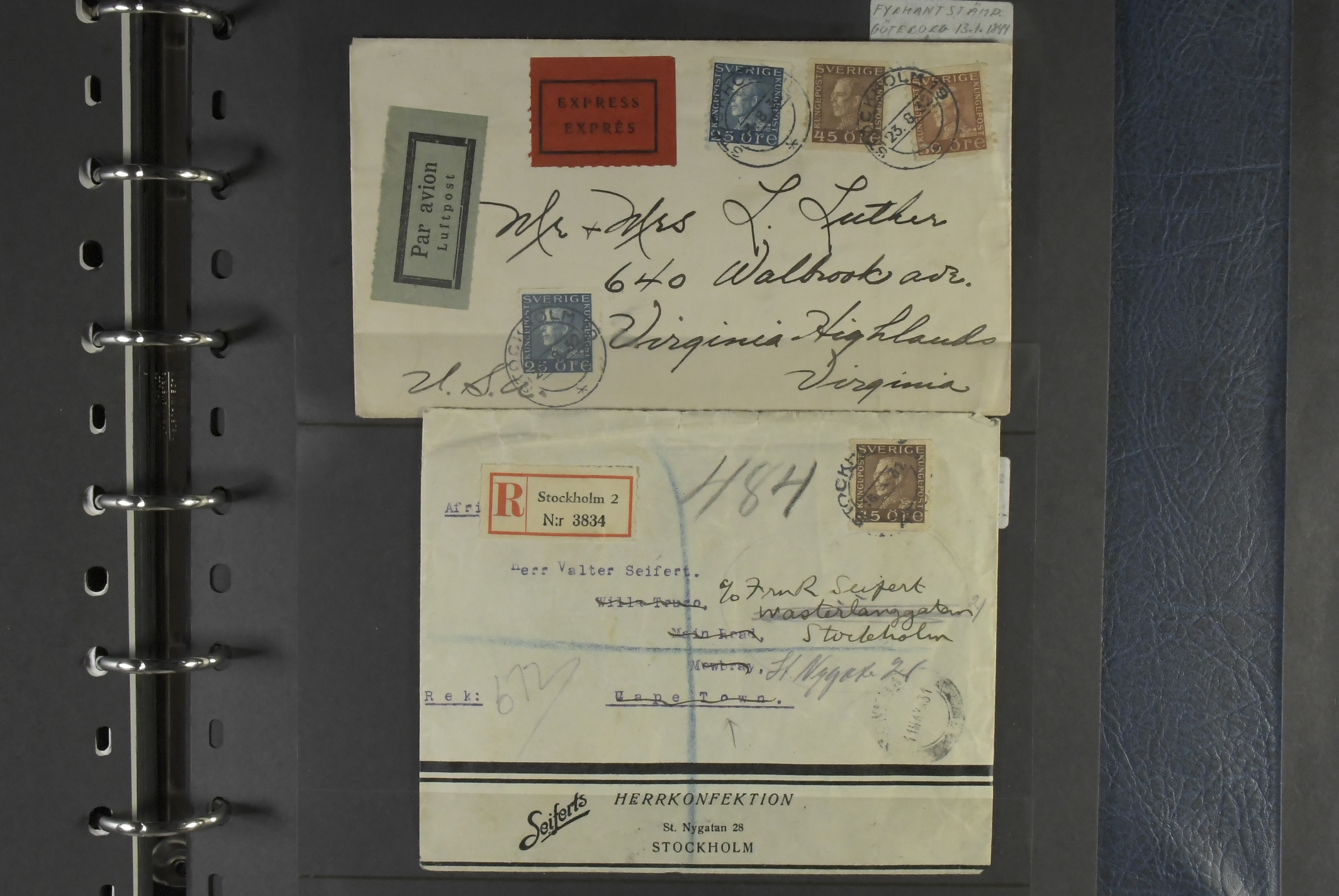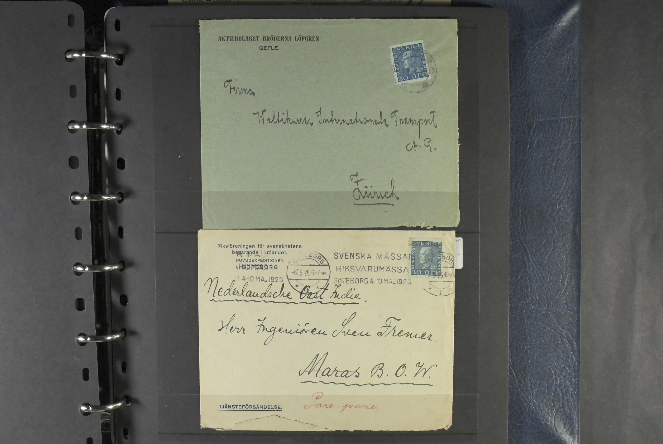 Sweden. Collection covers GUSTAF V LEFT PROFILE in visir album. Selected better items, e.g. postal forms, special delivery and air mail, foreign destinations incl. Bulgaria, Canada, Chile, China, Colombia, India, Iran, Ireland, Java, Philippines, South Africa, Turkey and Venezuela. The entire lot is presented at www.philea.se. Somewhat mixed quality. (38)