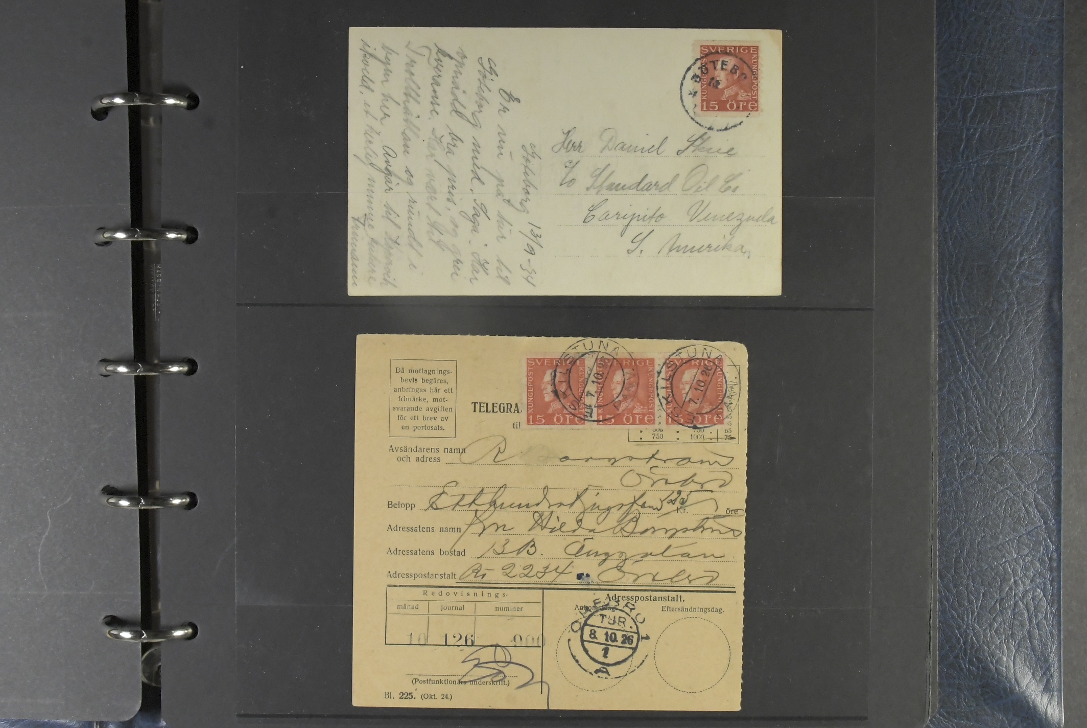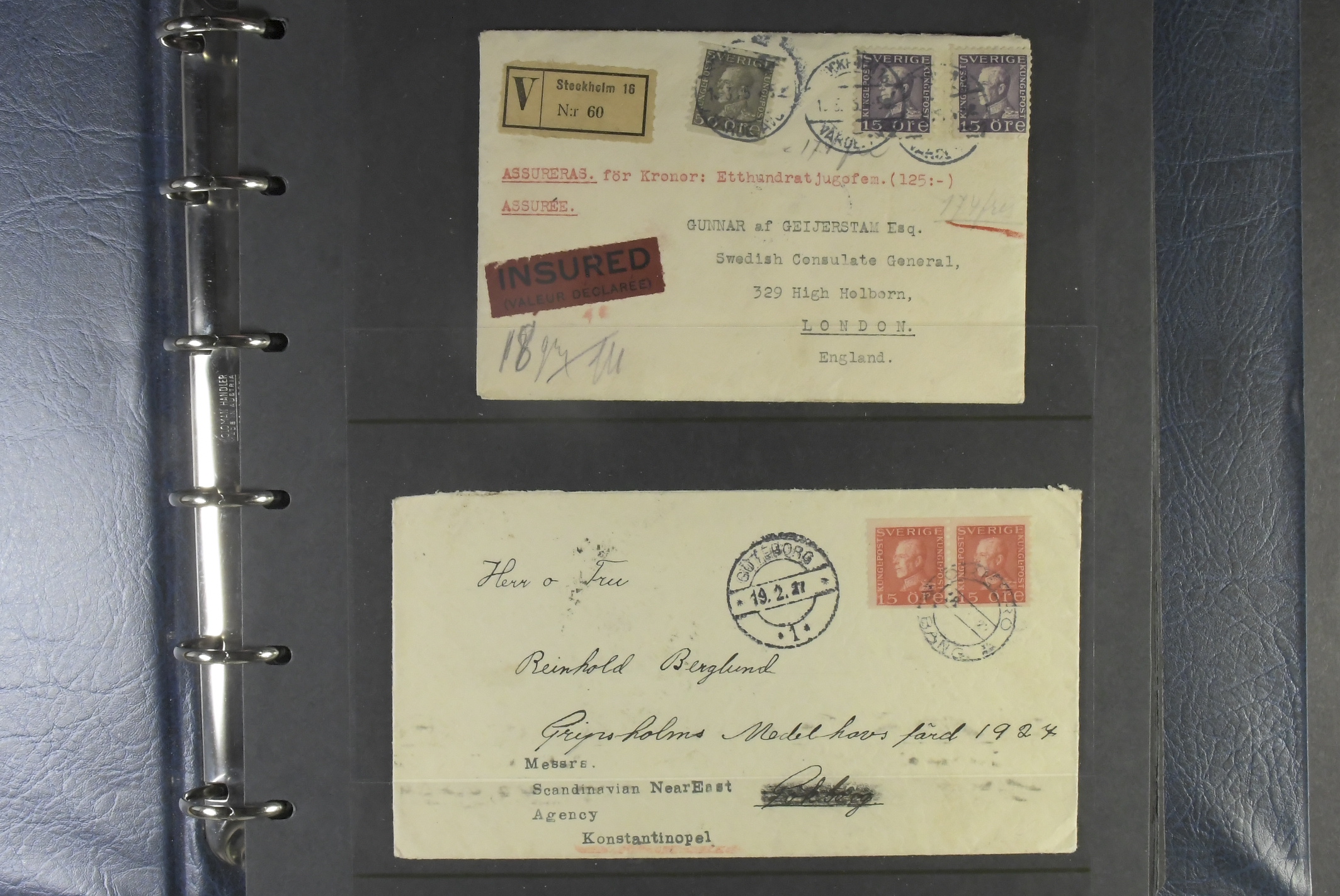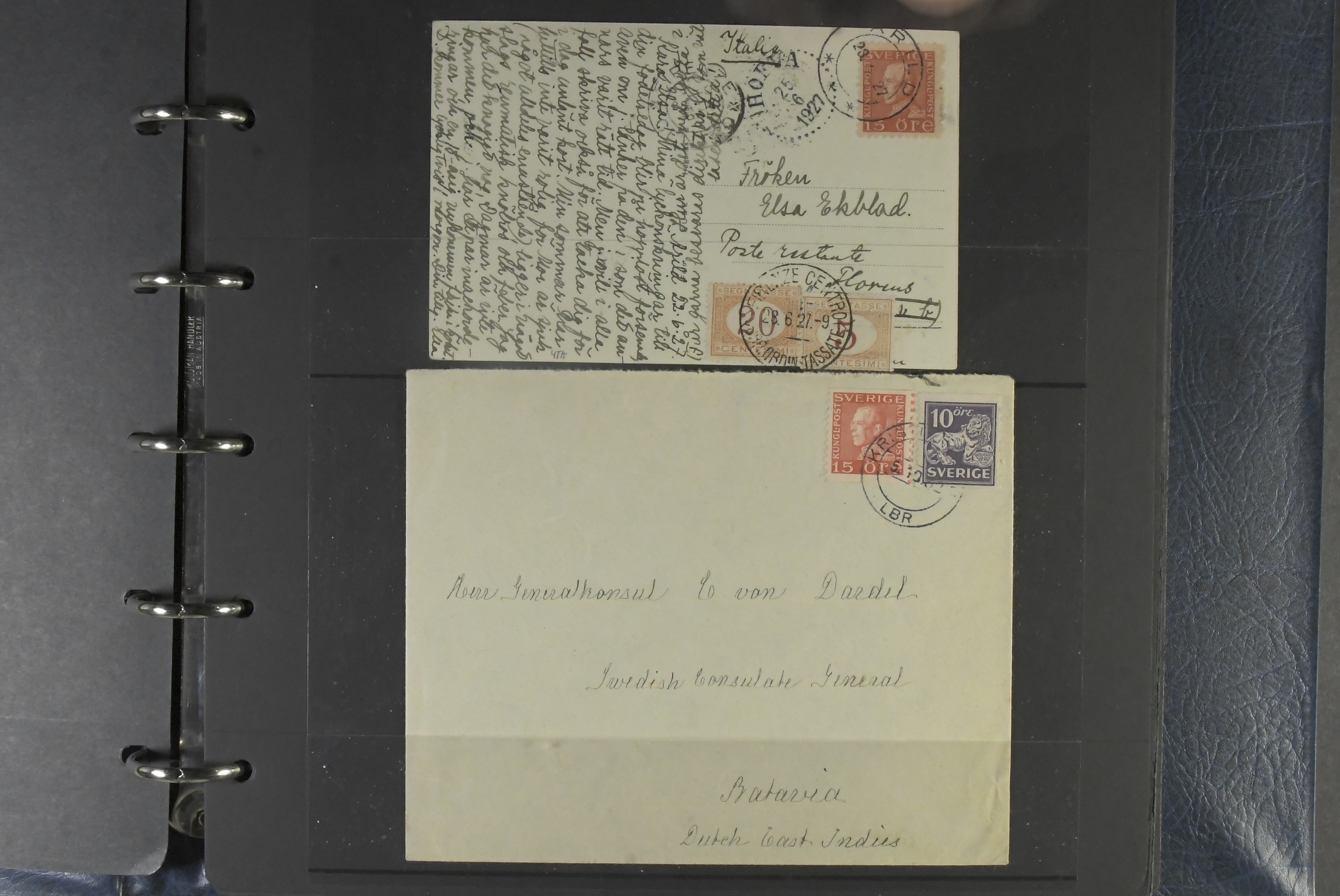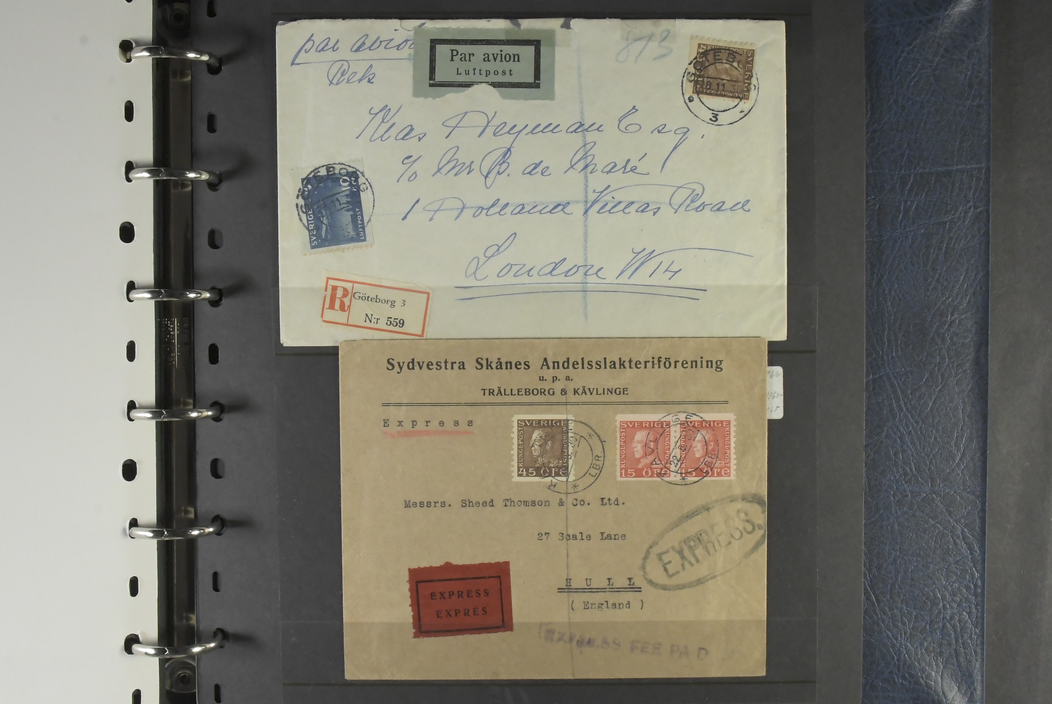 Sweden. Collection covers GUSTAF V LEFT PROFILE in visir album. Selected better items, e.g. postal forms, special delivery and air mail, foreign destinations incl. Bulgaria, Canada, Chile, China, Colombia, India, Iran, Ireland, Java, Philippines, South Africa, Turkey and Venezuela. The entire lot is presented at www.philea.se. Somewhat mixed quality. (38)