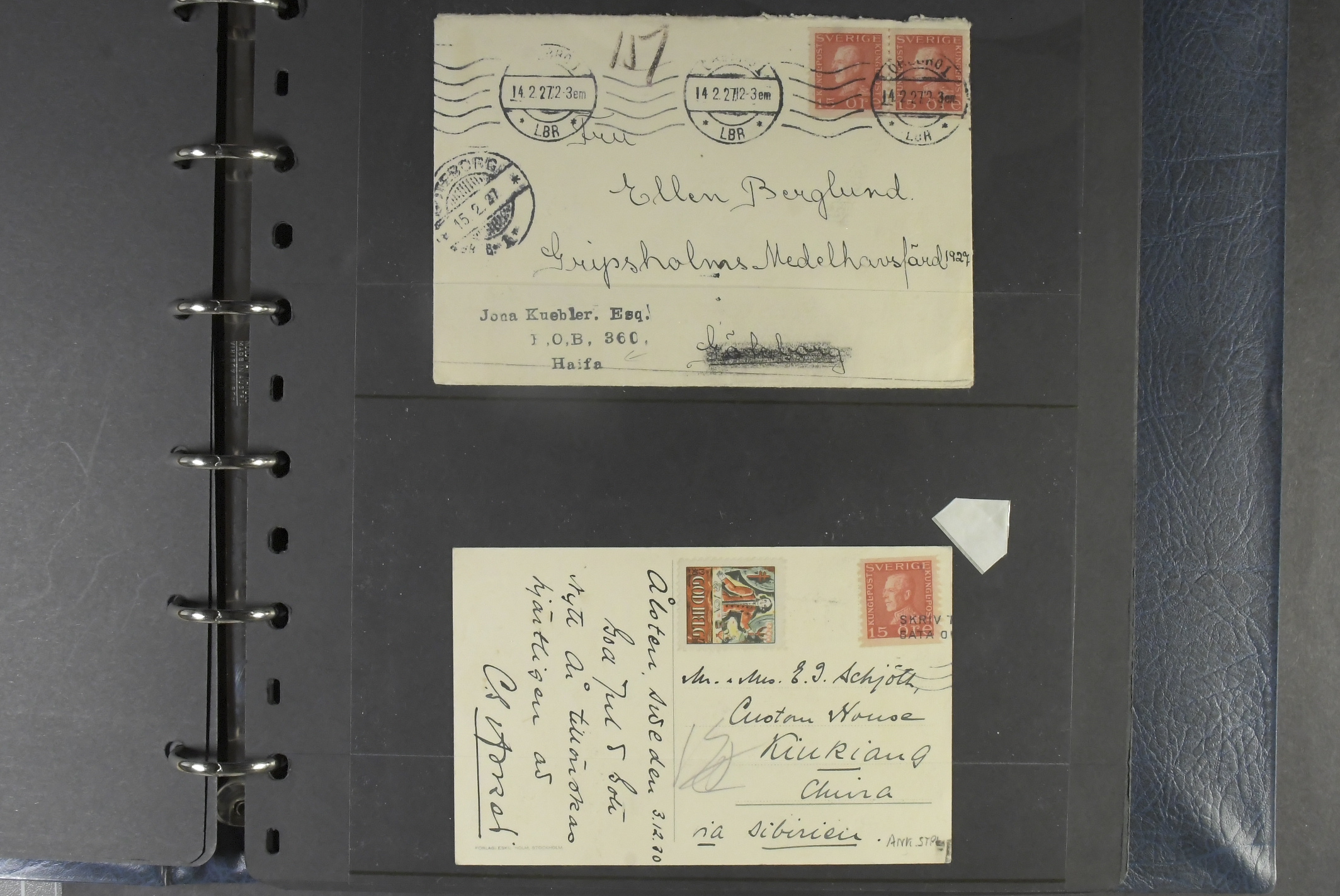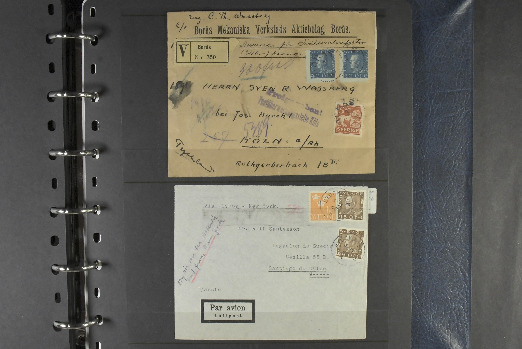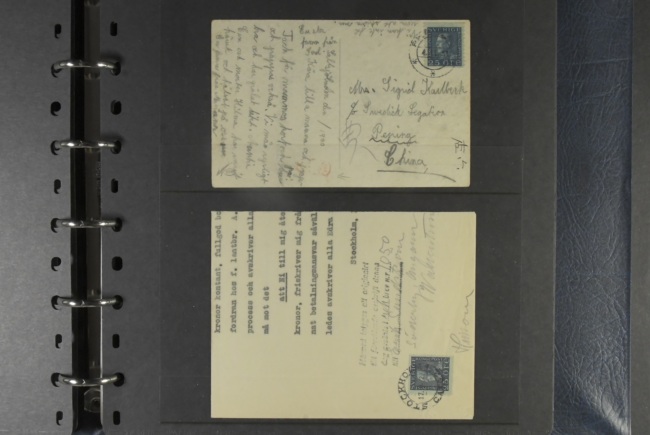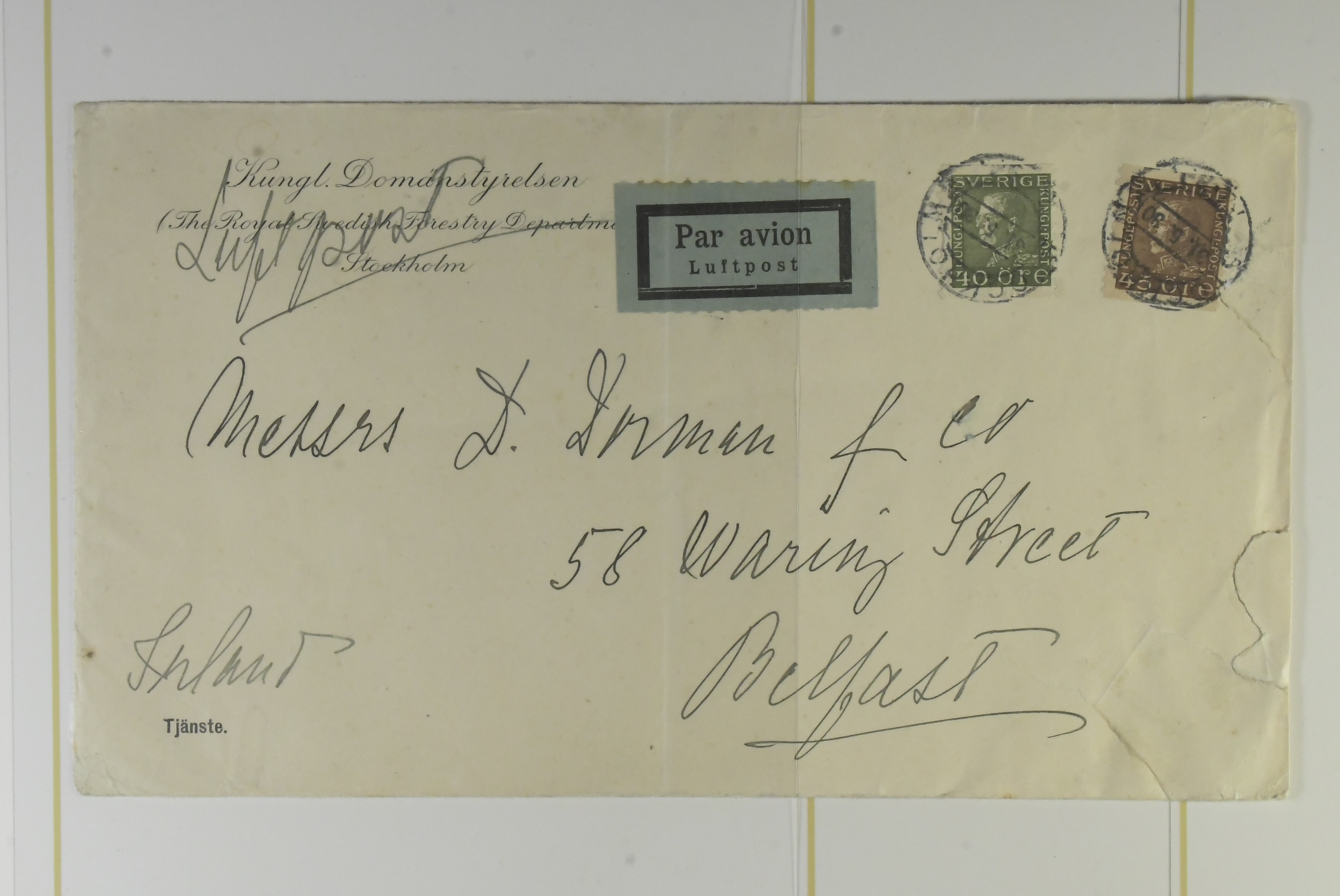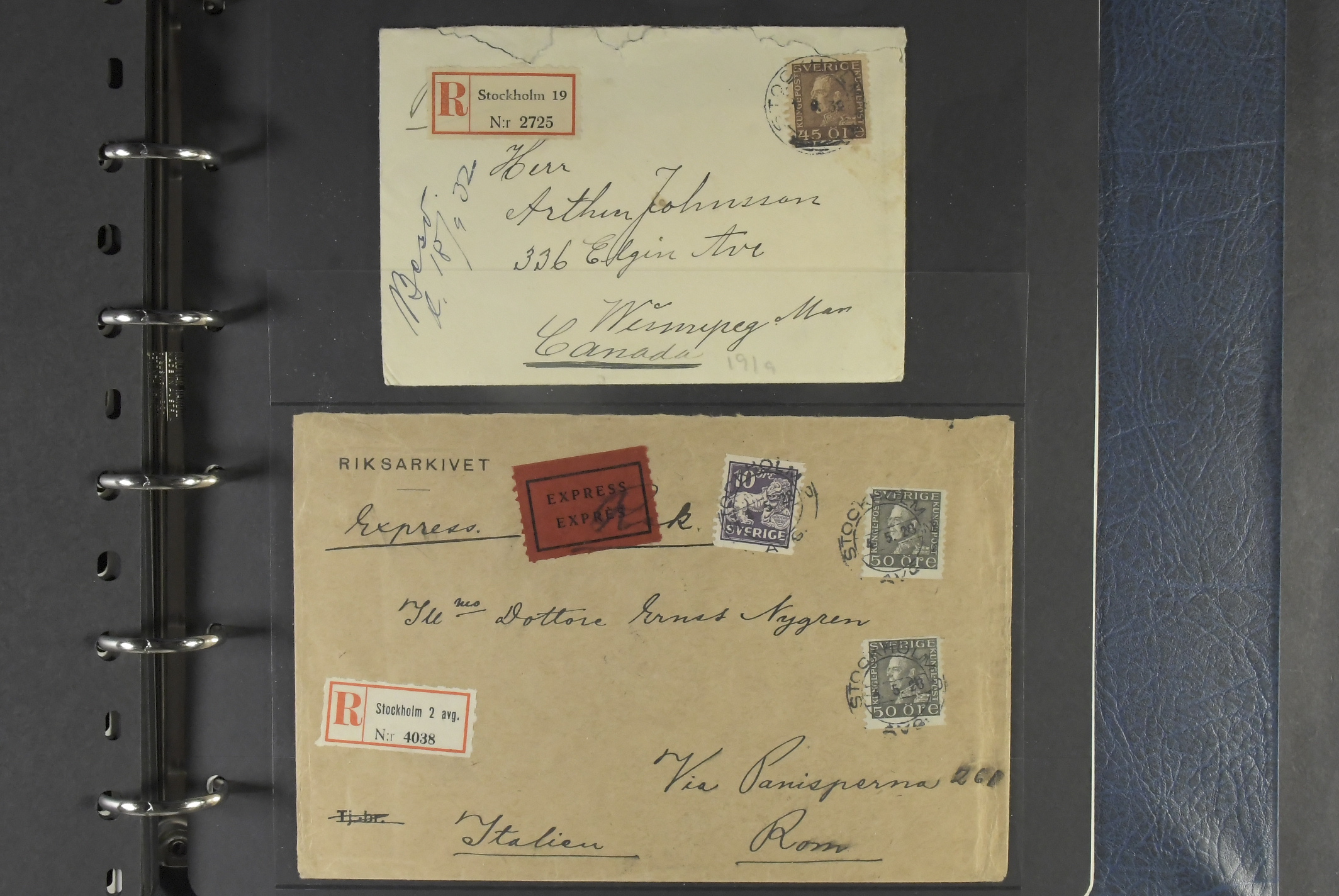 Sweden. Collection covers GUSTAF V LEFT PROFILE in visir album. Selected better items, e.g. postal forms, special delivery and air mail, foreign destinations incl. Bulgaria, Canada, Chile, China, Colombia, India, Iran, Ireland, Java, Philippines, South Africa, Turkey and Venezuela. The entire lot is presented at www.philea.se. Somewhat mixed quality. (38)