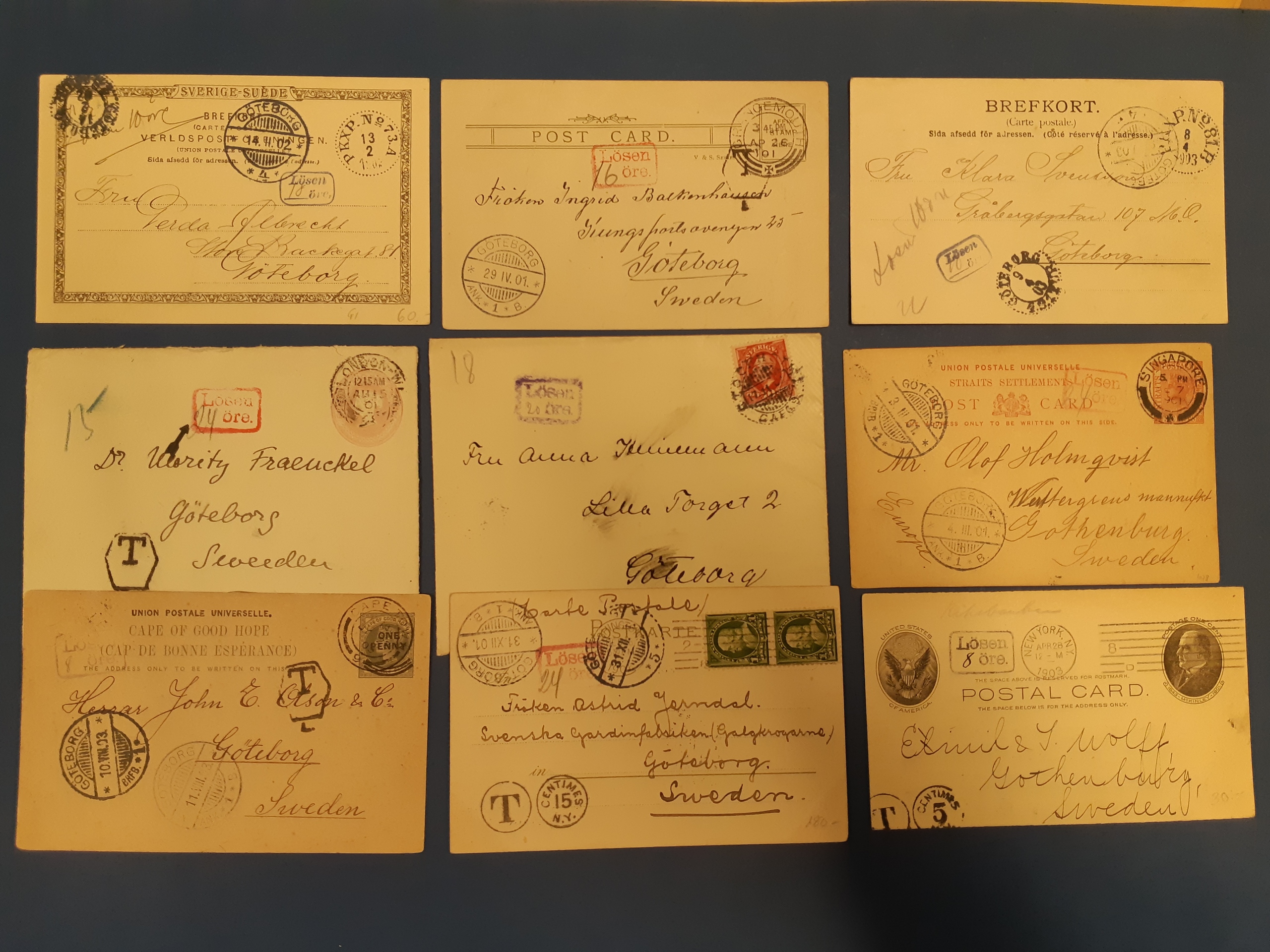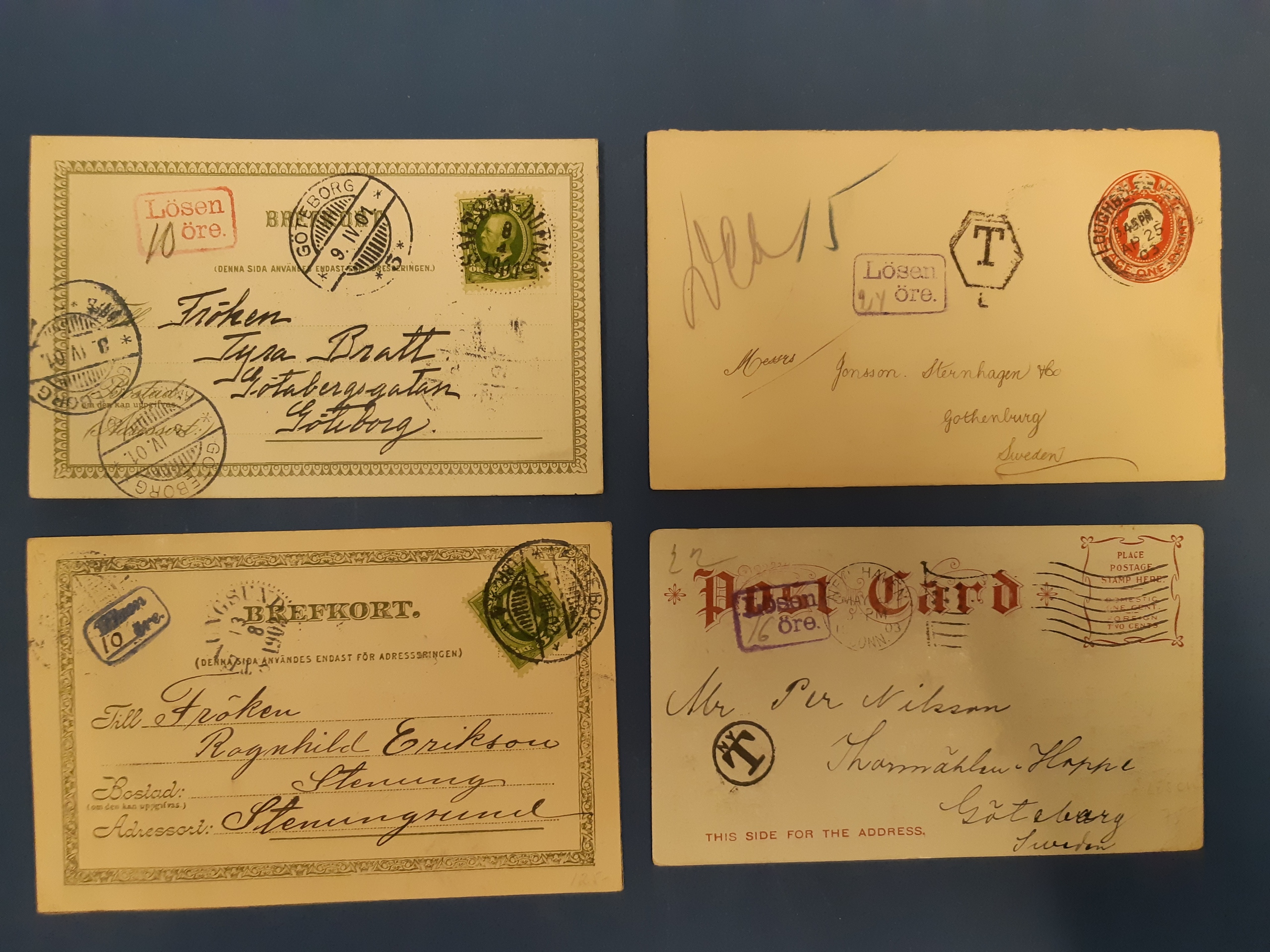Sweden. Lot covers POSTAGE DUE. Square marks with frame 'Lösen öre' in partly different sizes and colours, on 13 covers and cards. The entire lot is presented at www.philea.se. (13)