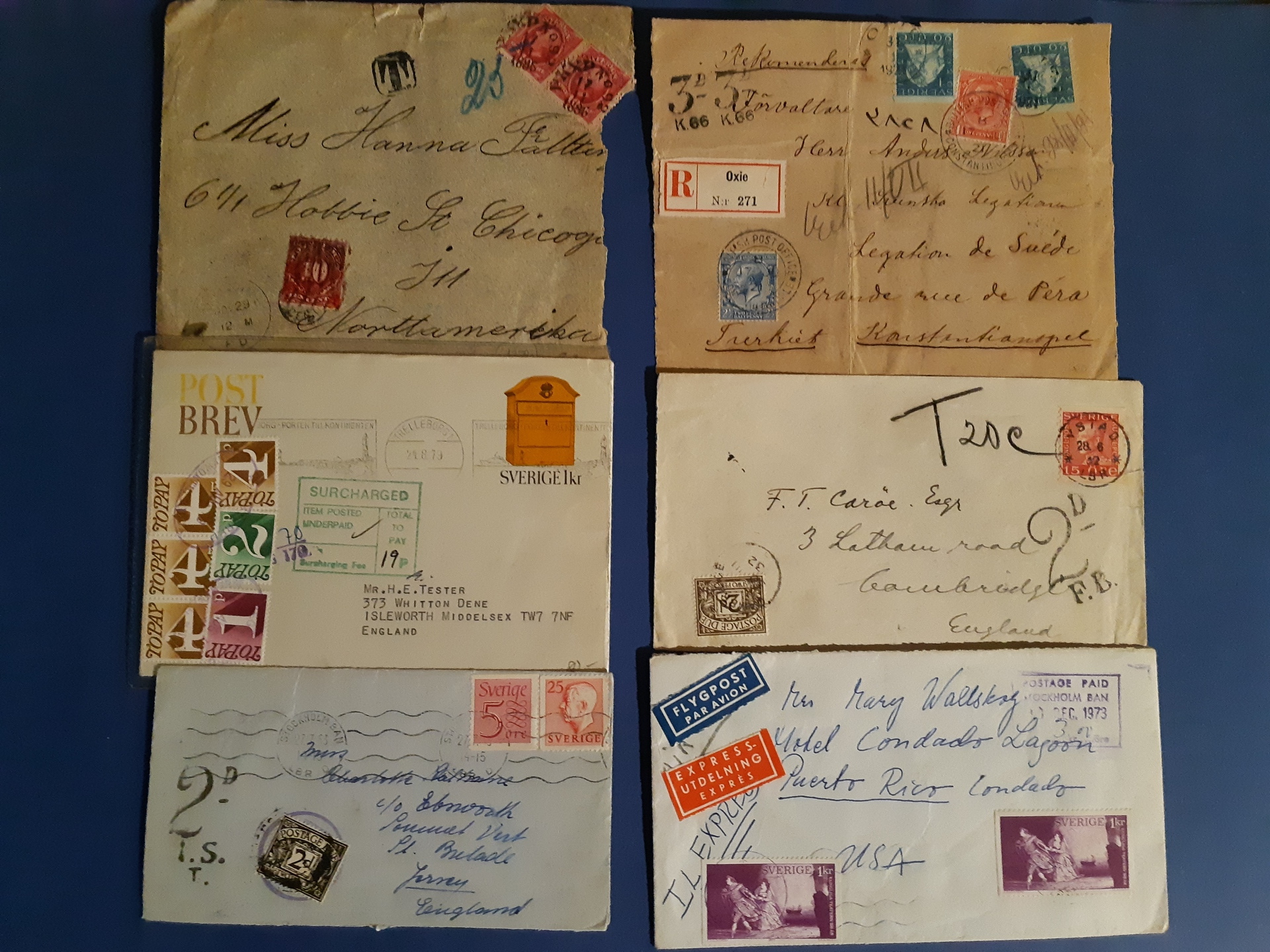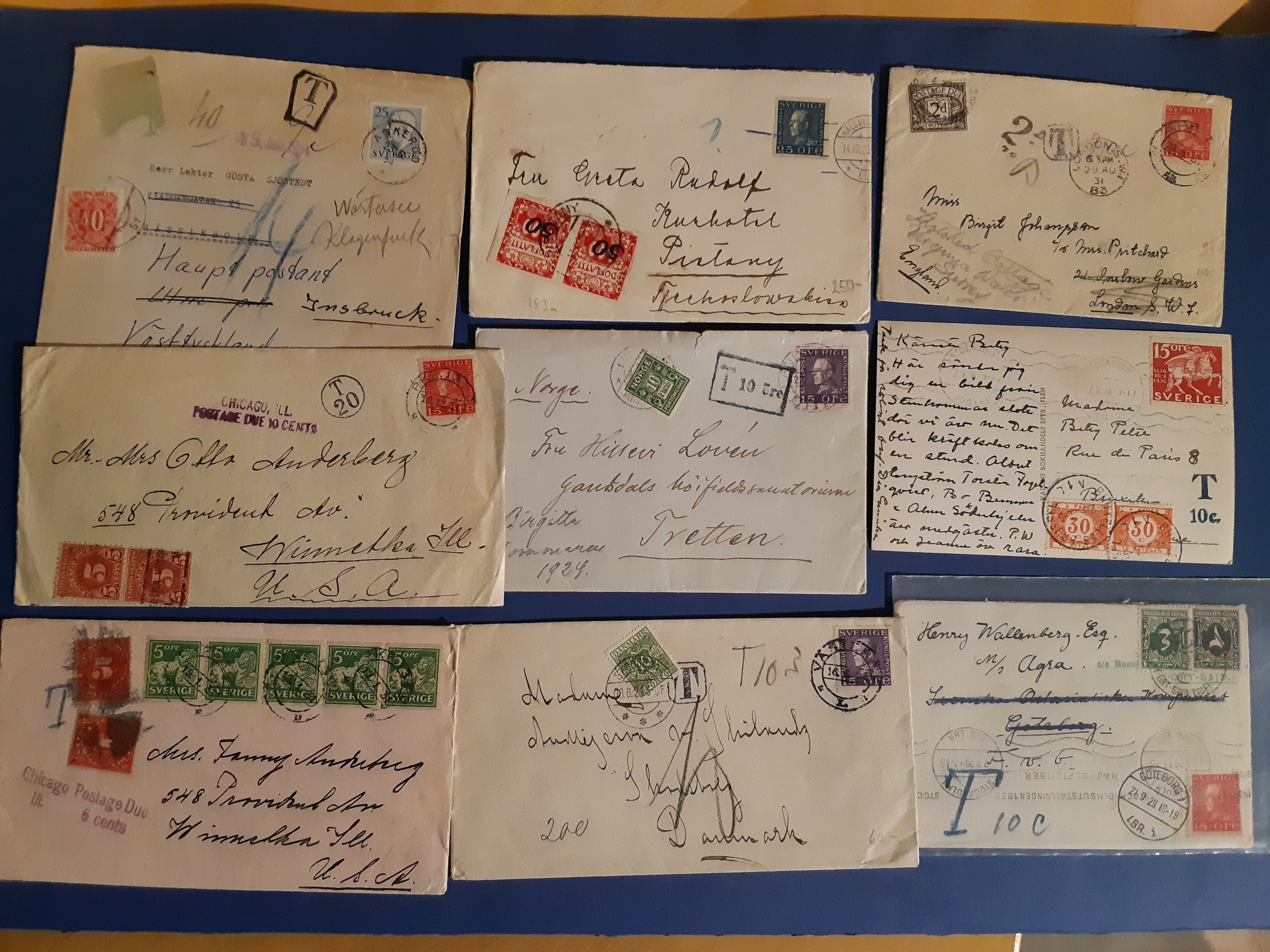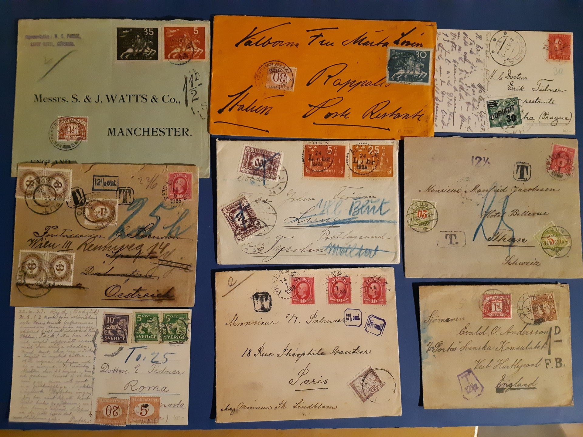 Sweden. Collection covers POSTAGE DUE. Mostly covers sent to foreign destinations, all with paid postage due, incl. some better. The entire lot is presented at www.philea.se. (23)