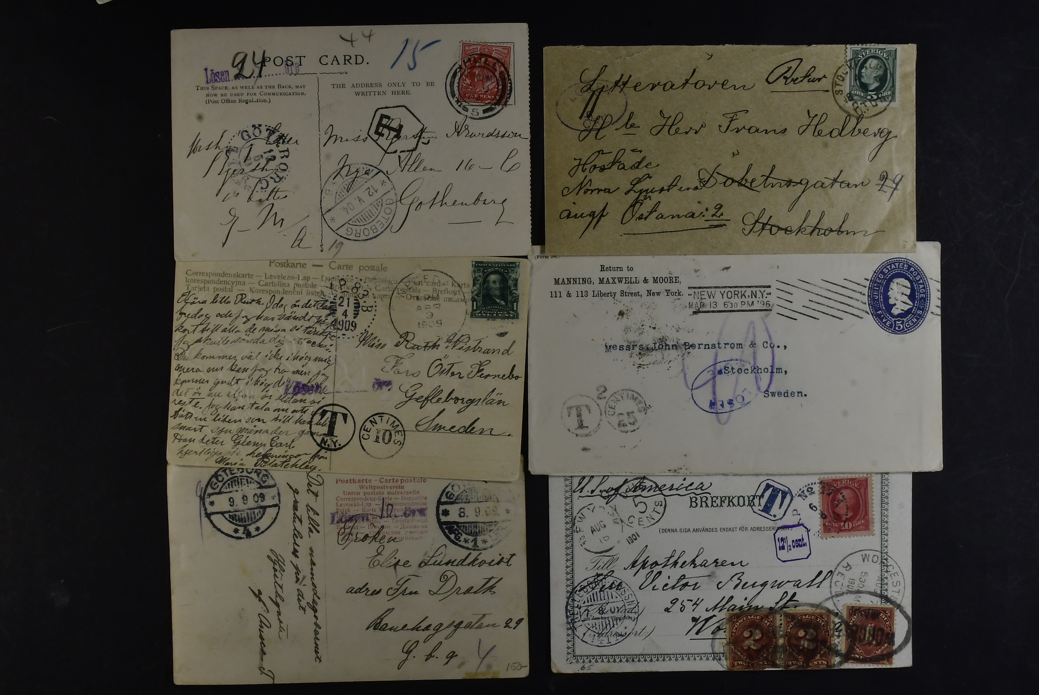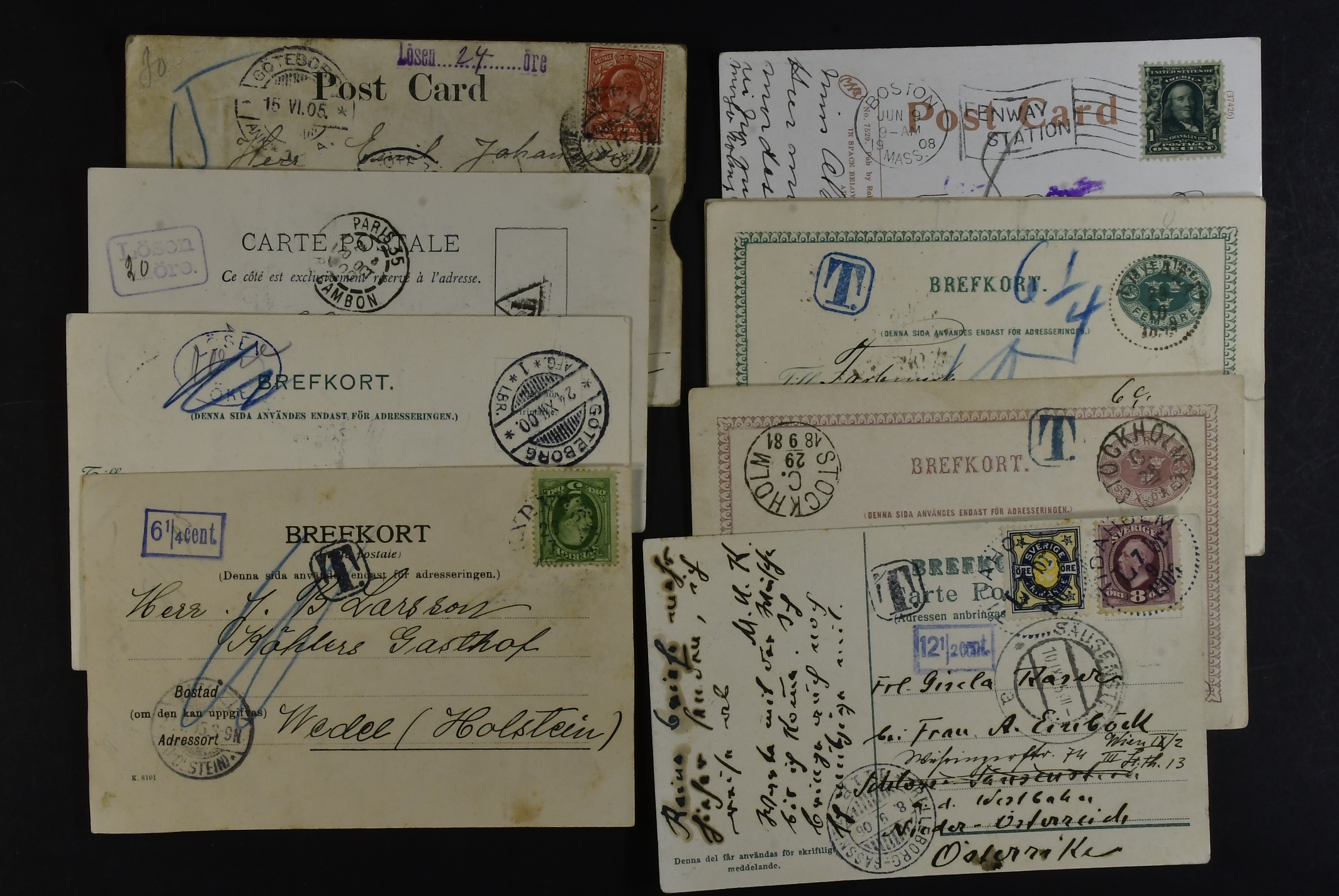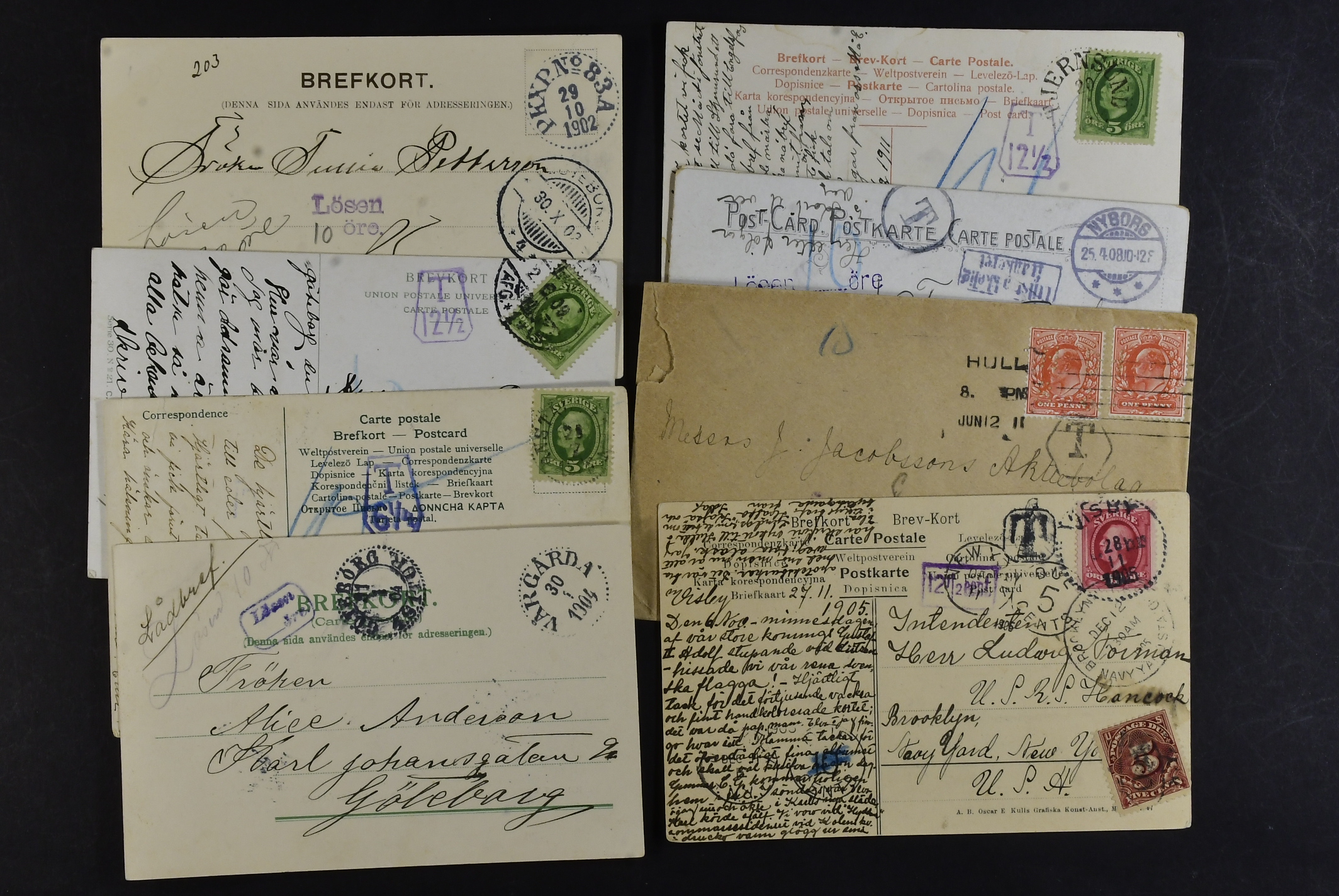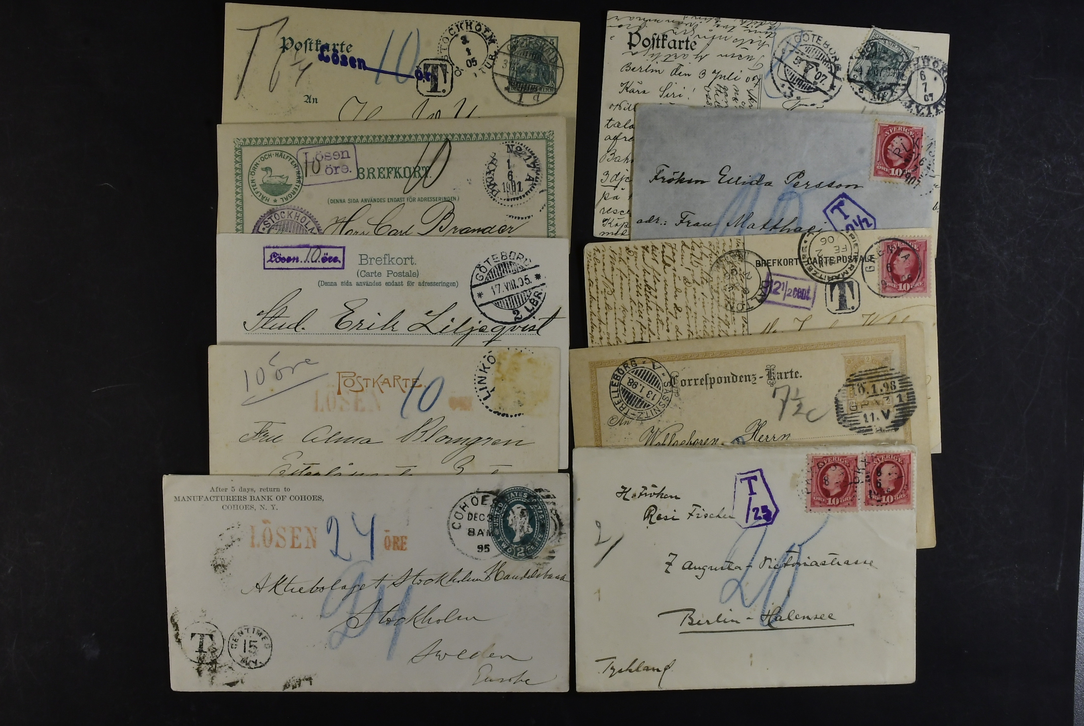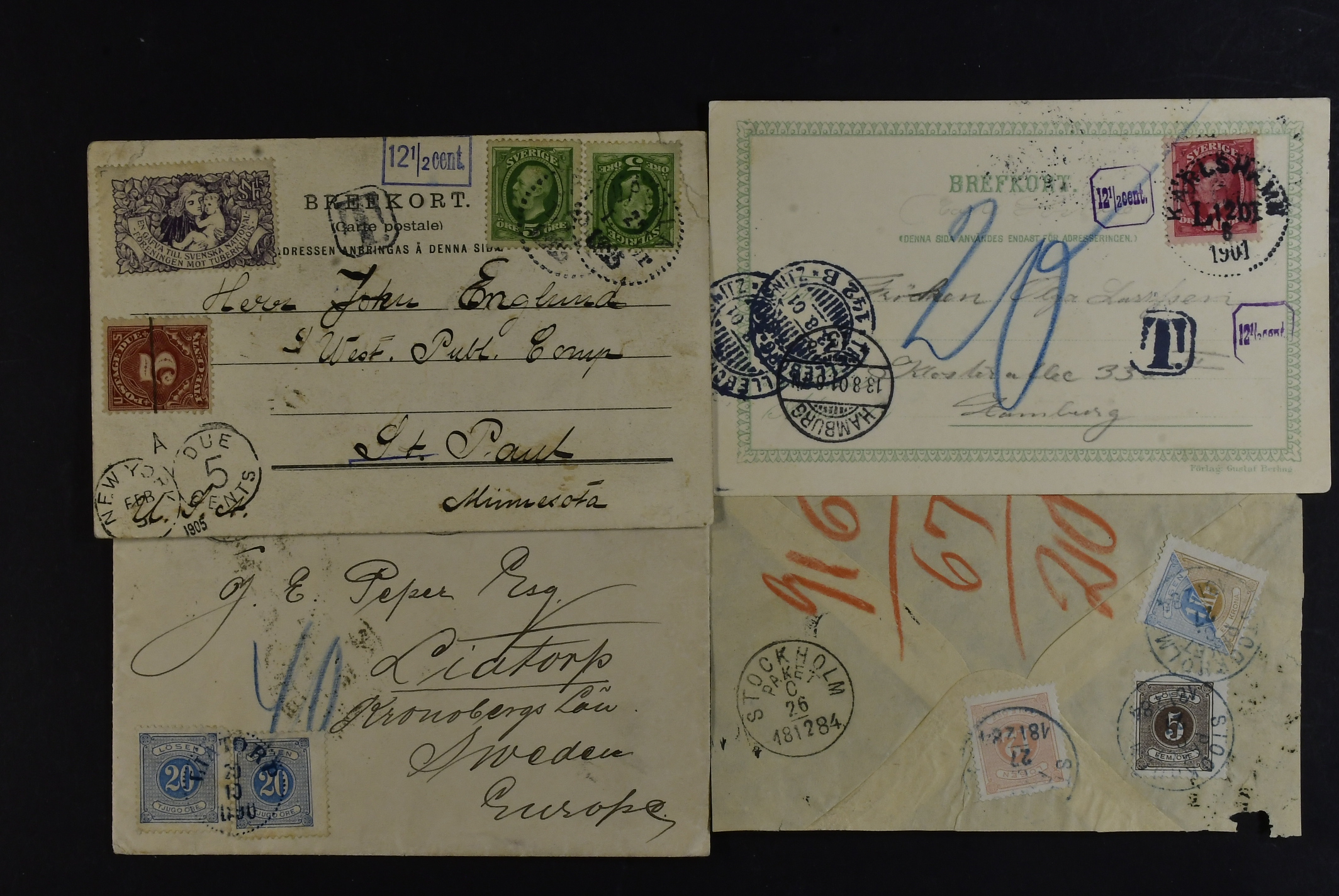 Sweden. Lot covers POSTAGE DUE 1890s–1900s. Coloured due marks, plus two items (poor condition) with postage due stamps. (44)