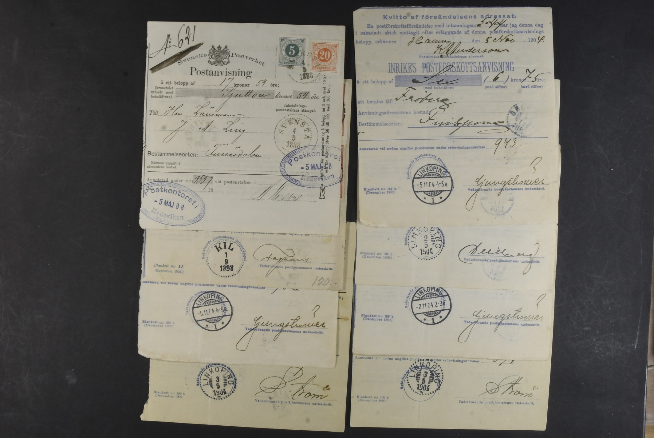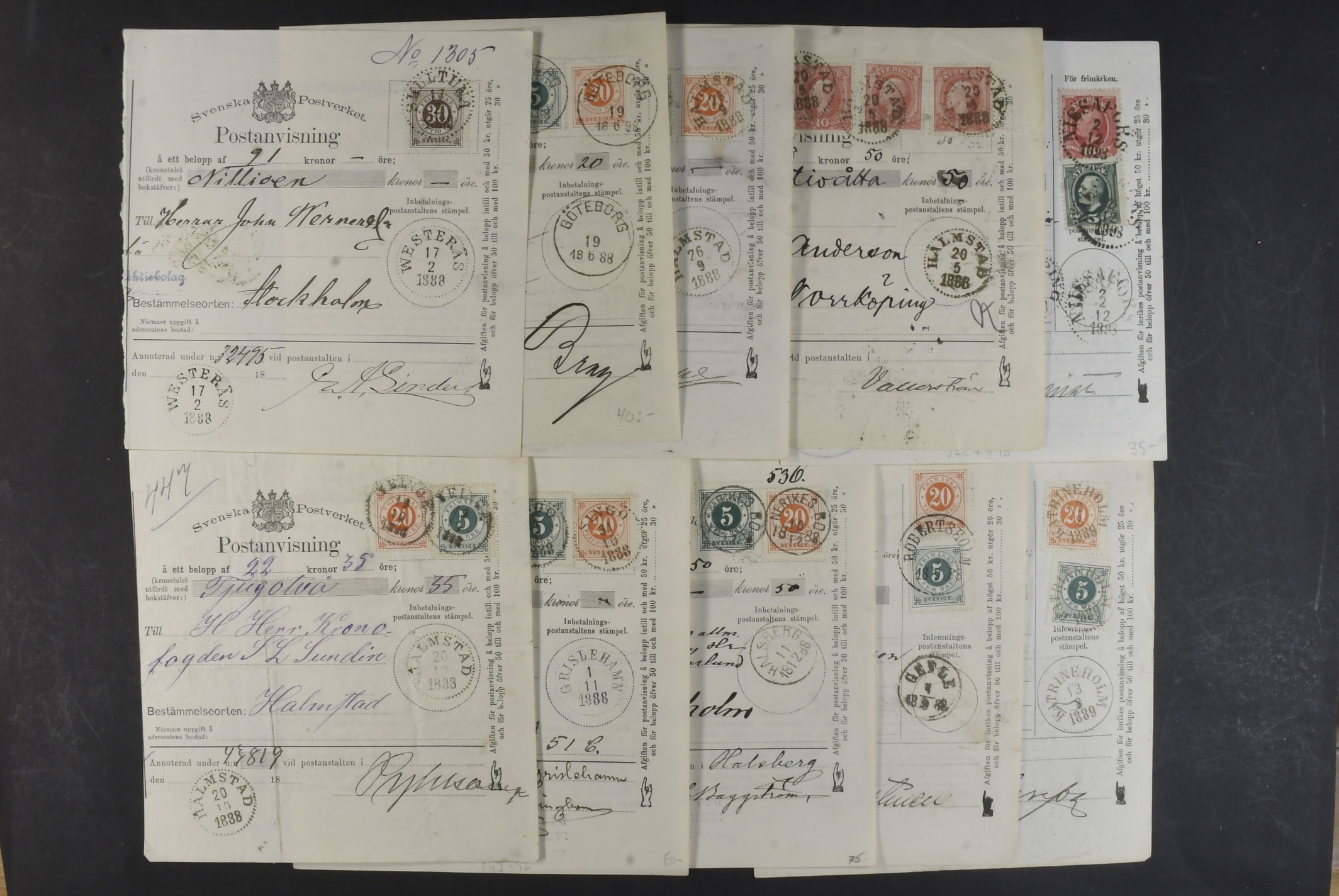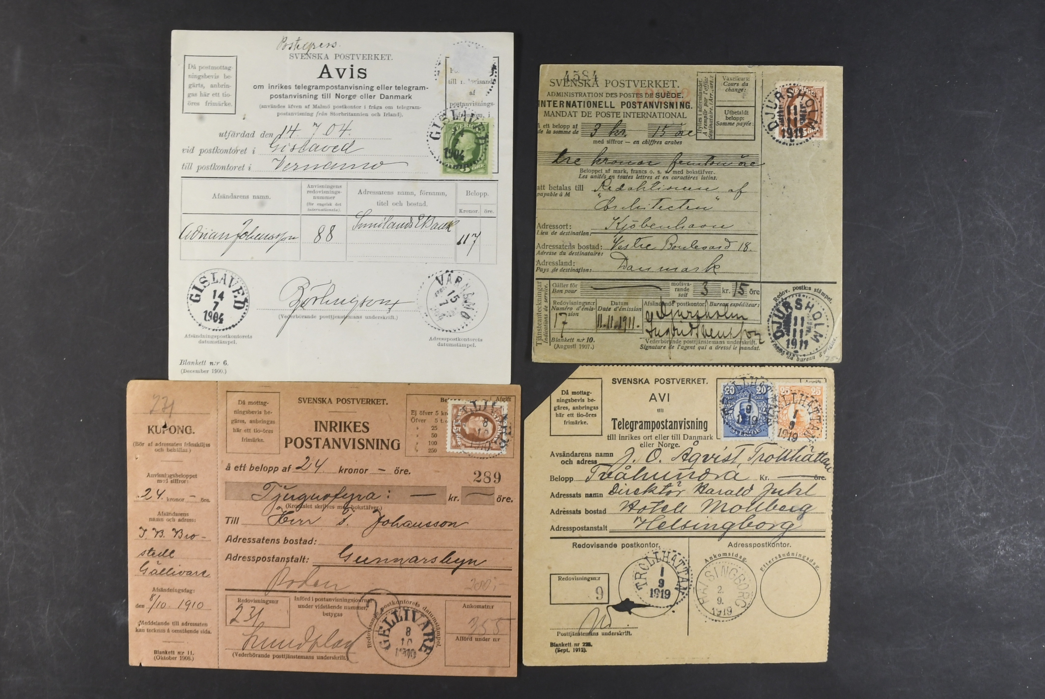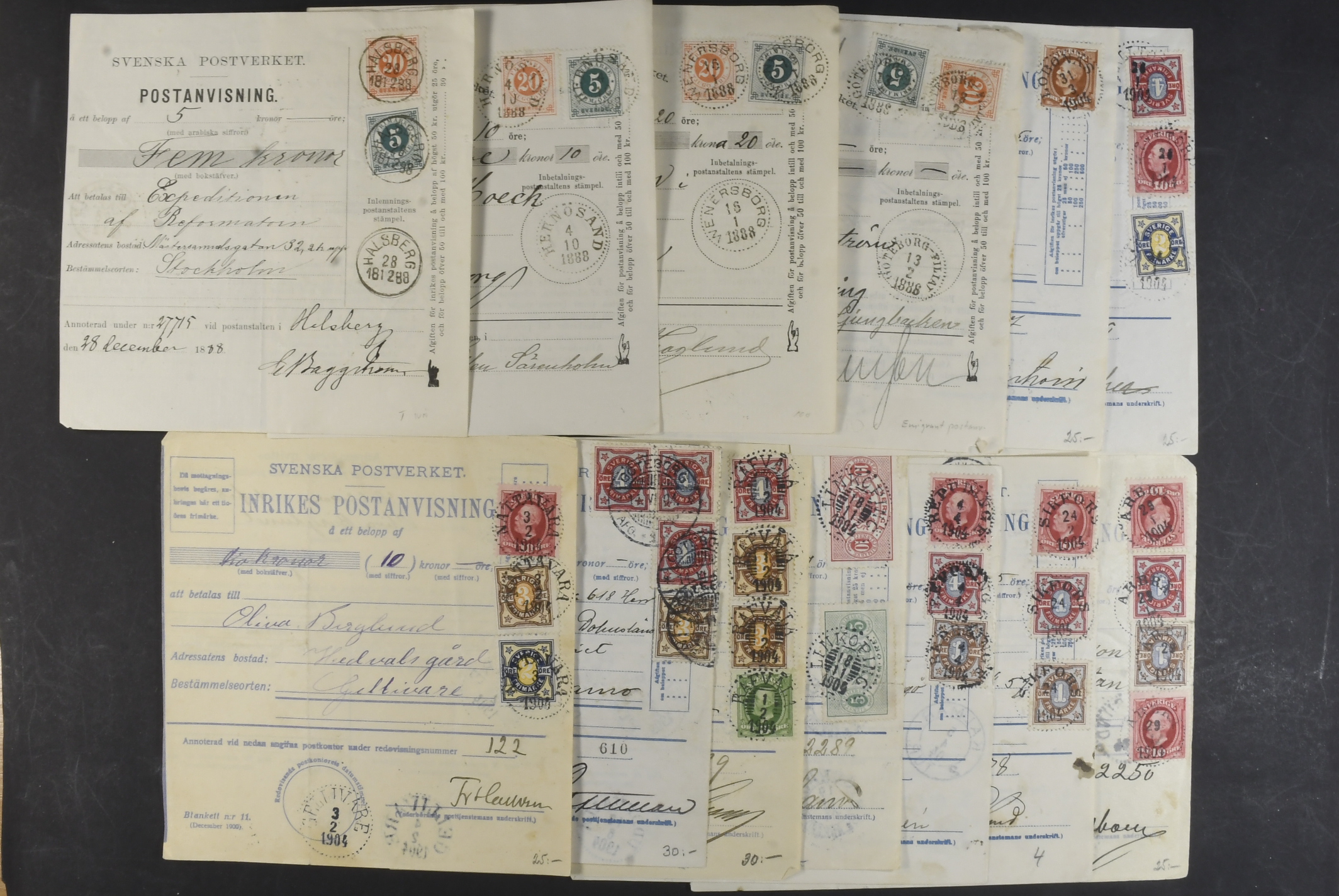 Sweden. Lot covers POSTAL FORMS. Mostly money orders and cash on delivery orders, plus a few receipts, freight ticket C.–H. J 25 öre with coupon, an early telegram cover, etc. (58)