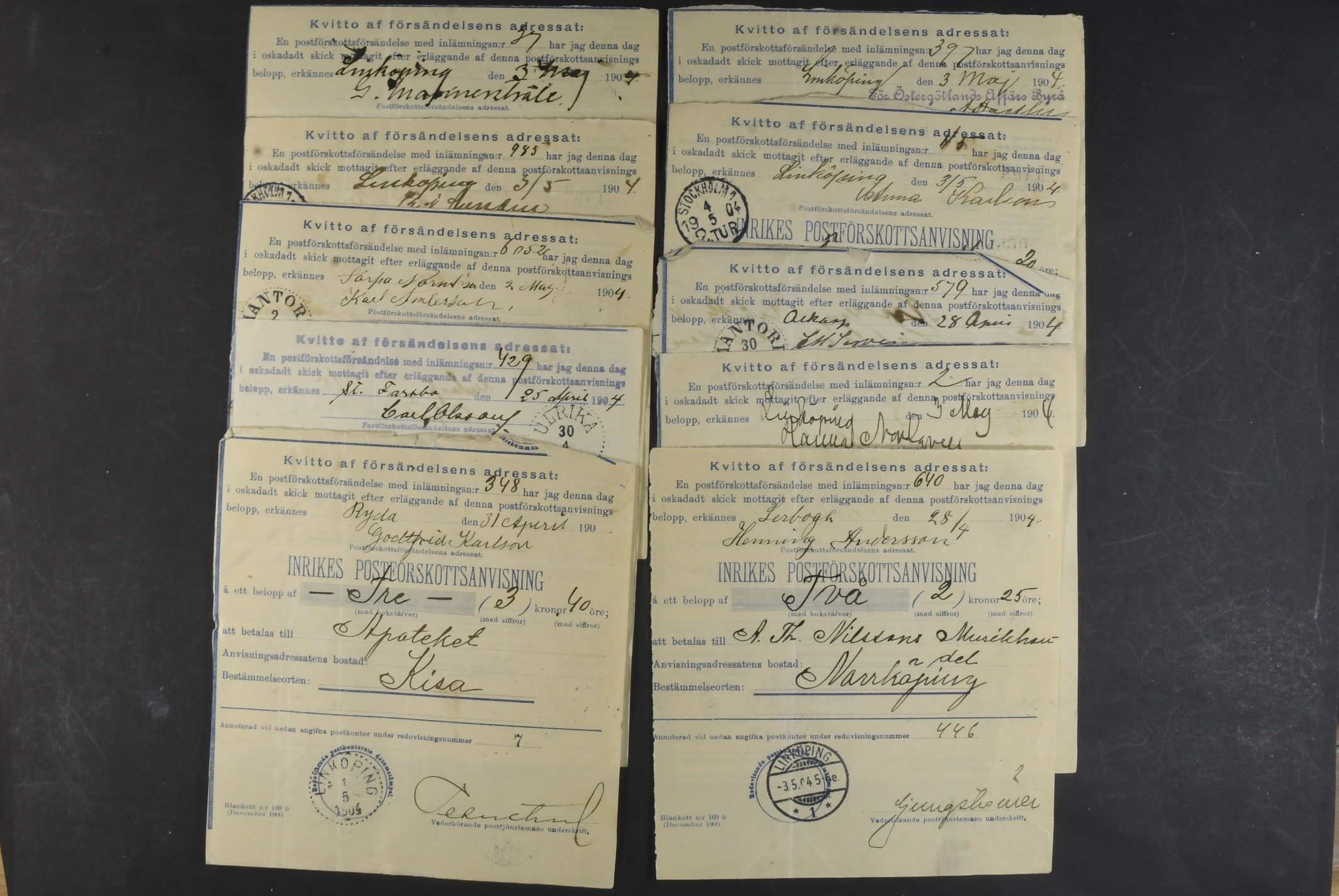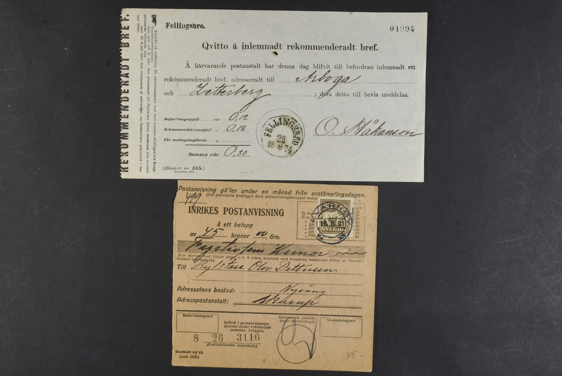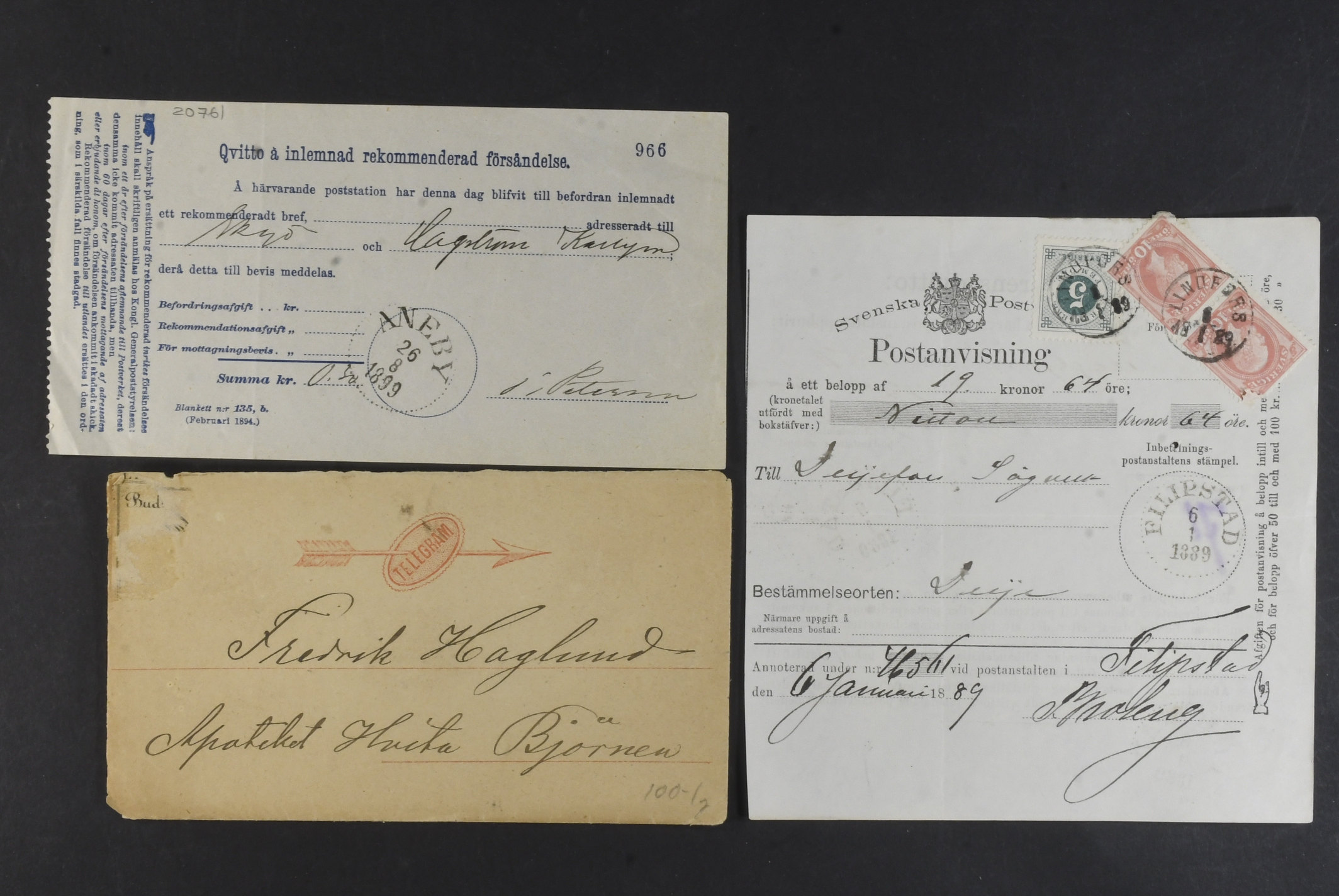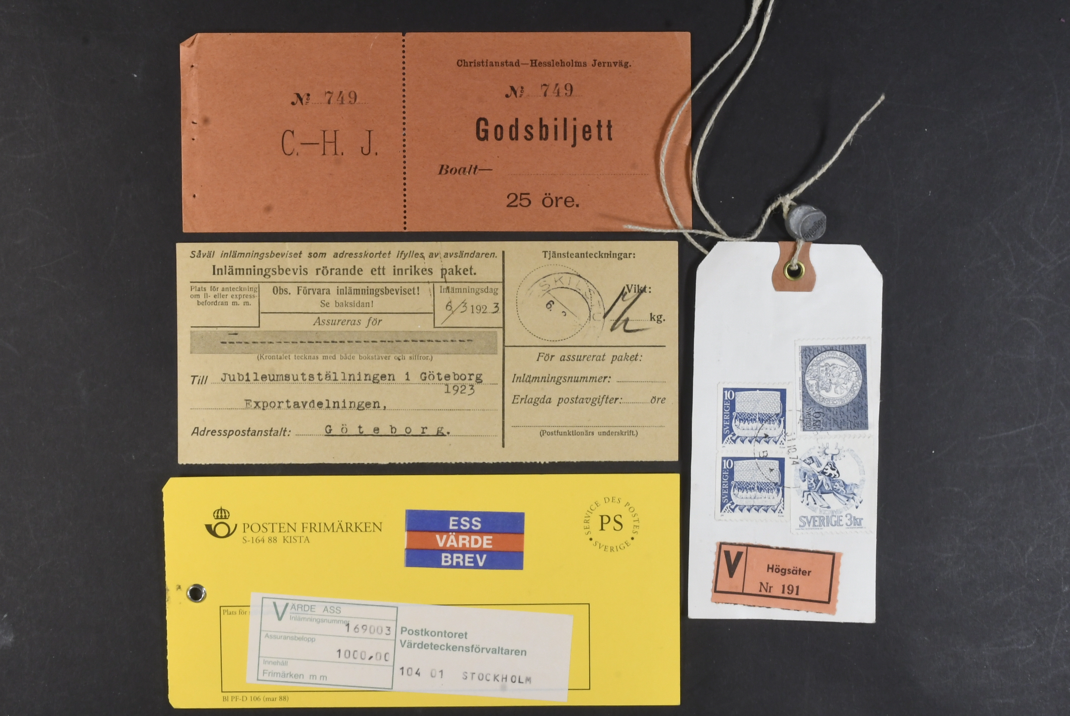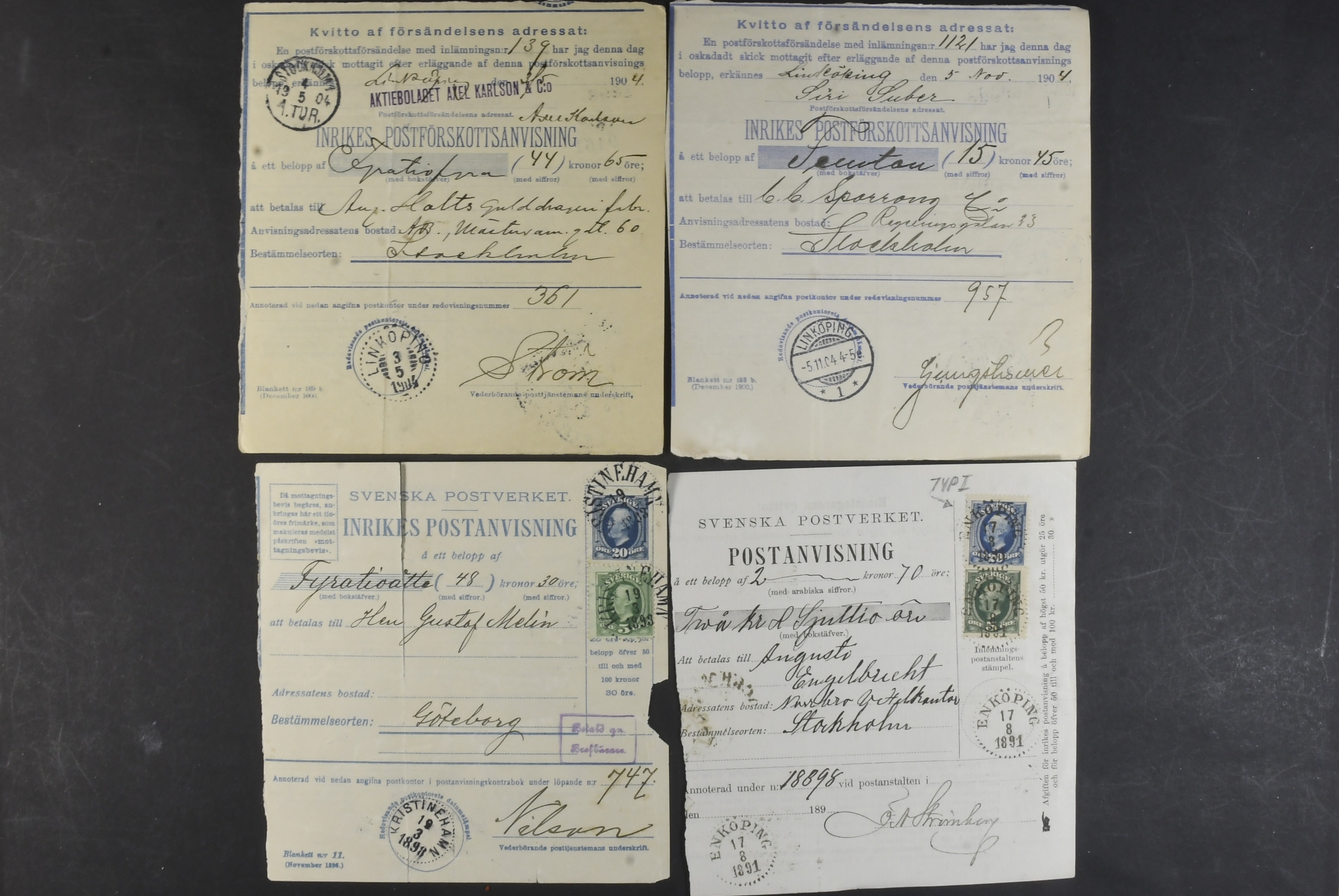 Sweden. Lot covers POSTAL FORMS. Mostly money orders and cash on delivery orders, plus a few receipts, freight ticket C.–H. J 25 öre with coupon, an early telegram cover, etc. (58)