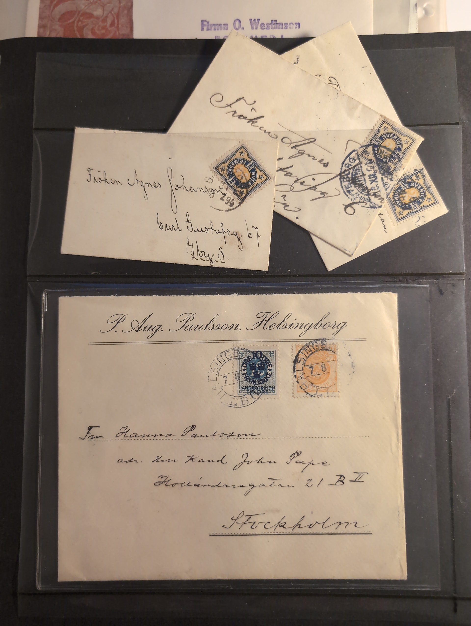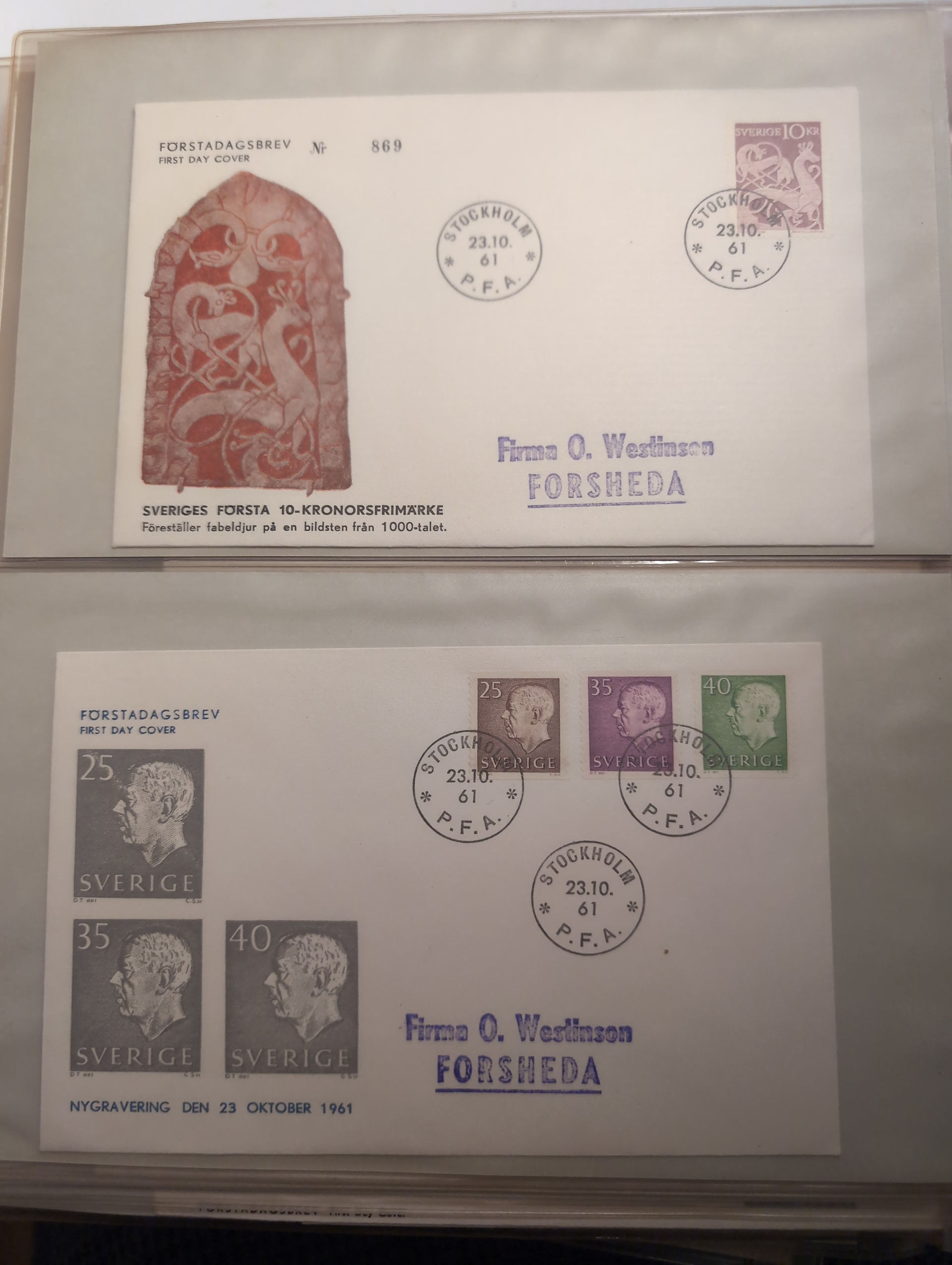 Sweden. Accumulation covers 1855–ca. 1970. Two unfranked covers 1855 and 1857, ten 12 öre Coat-of-arms covers, Military M1 cover and mostly FDCs 1930s–1970s incl. a few better e.g. 17.9.58 .Please see a selection of scans at www.philea.se. Mostly good quality. (100s)