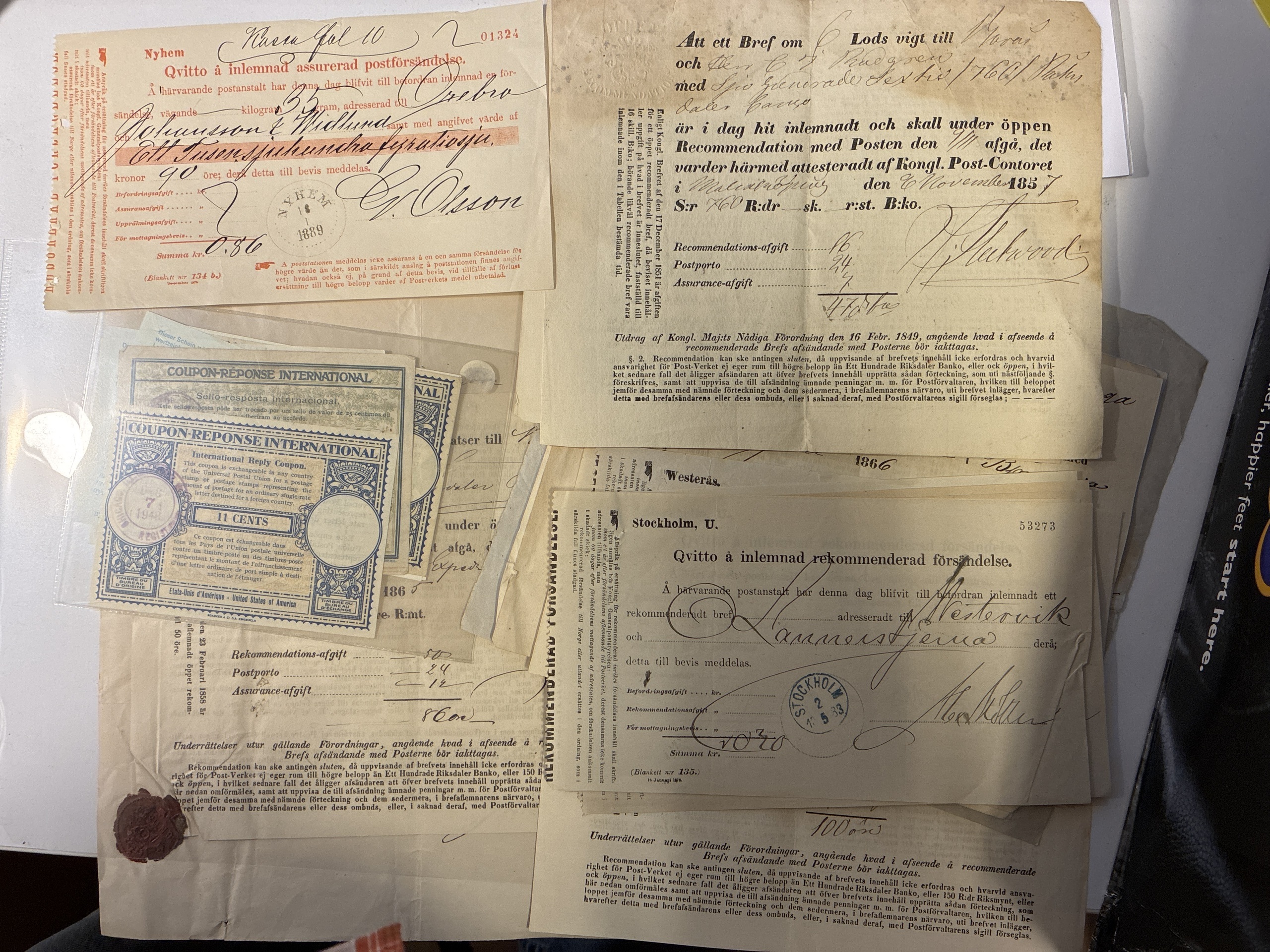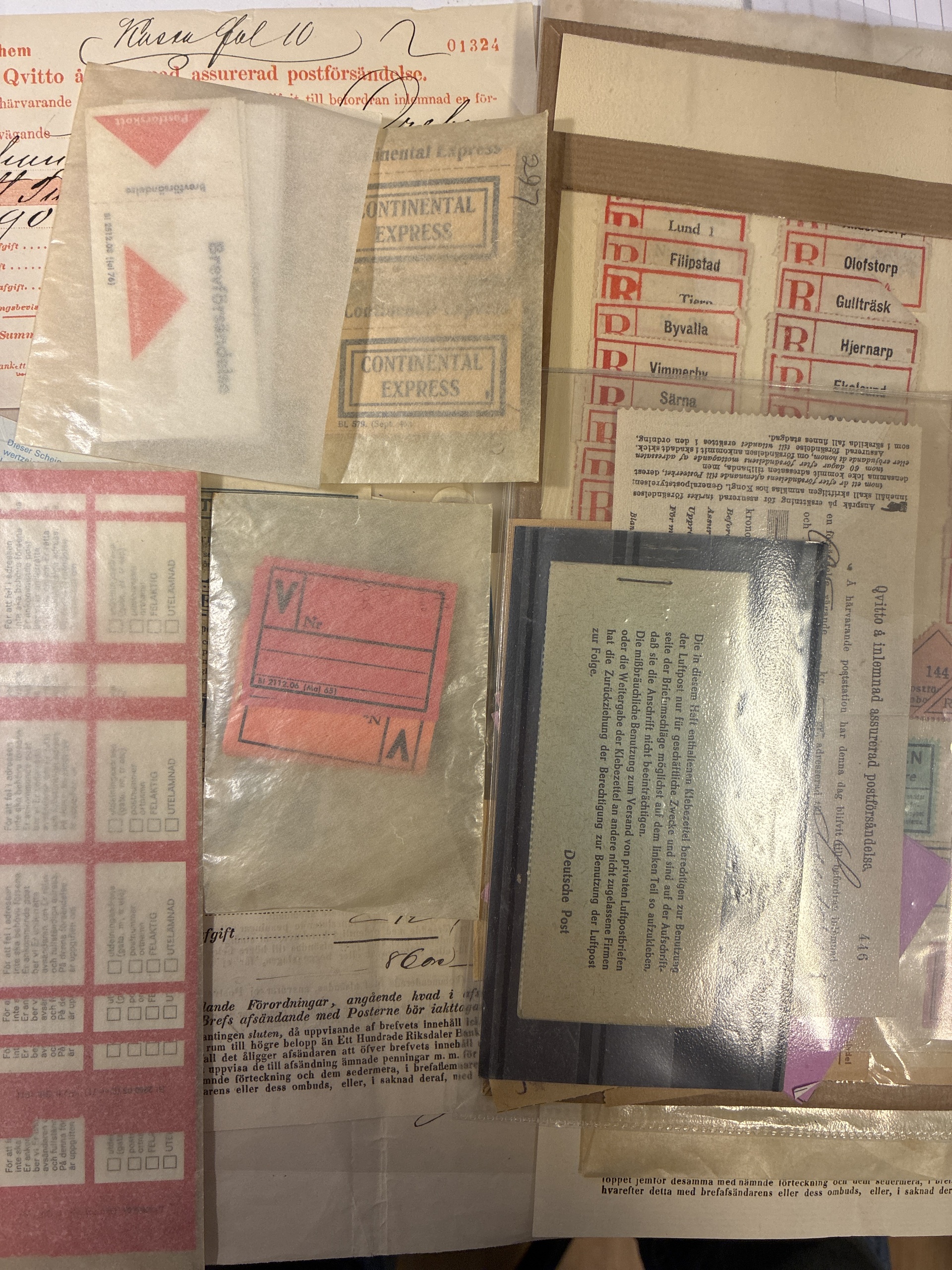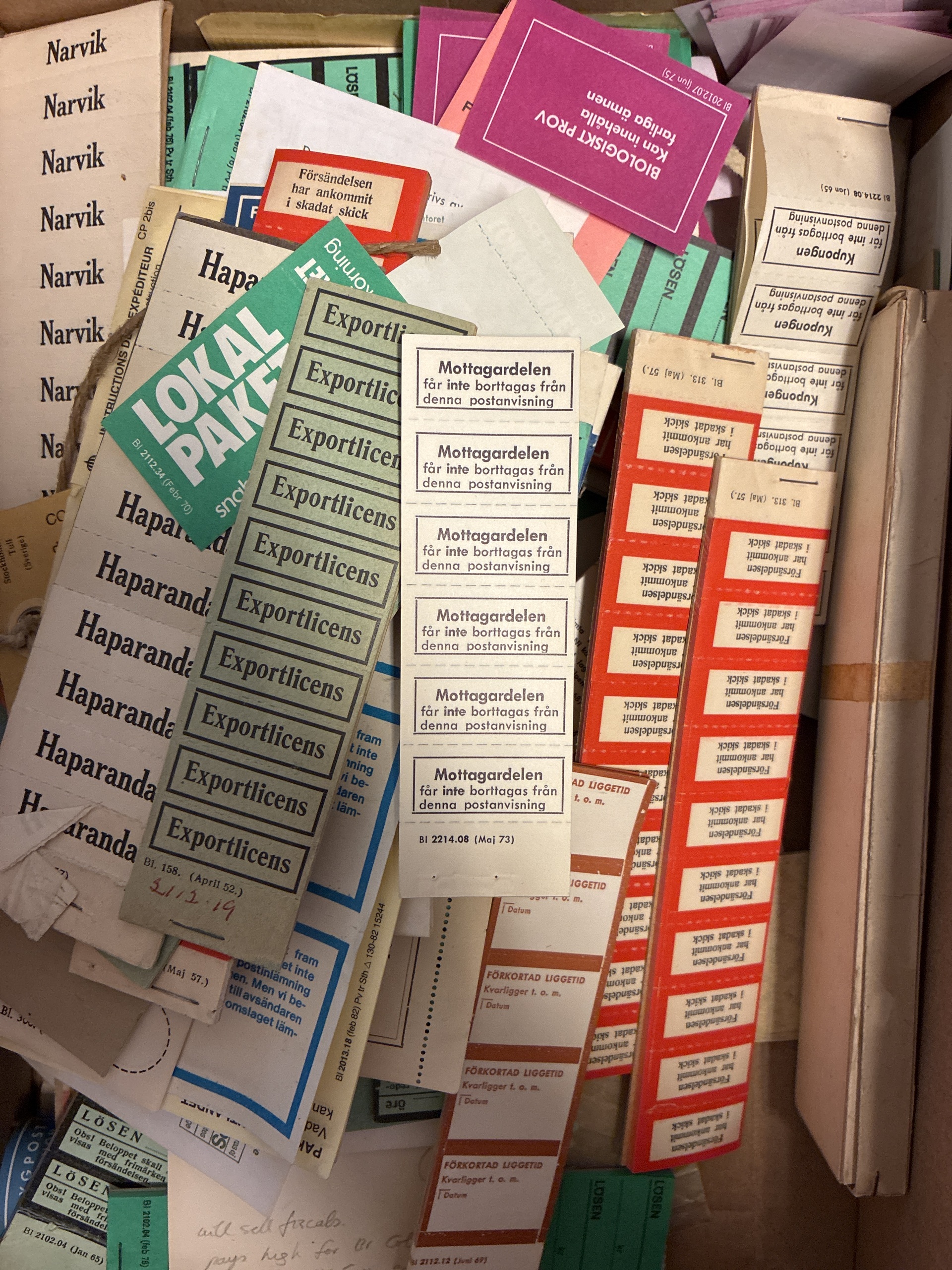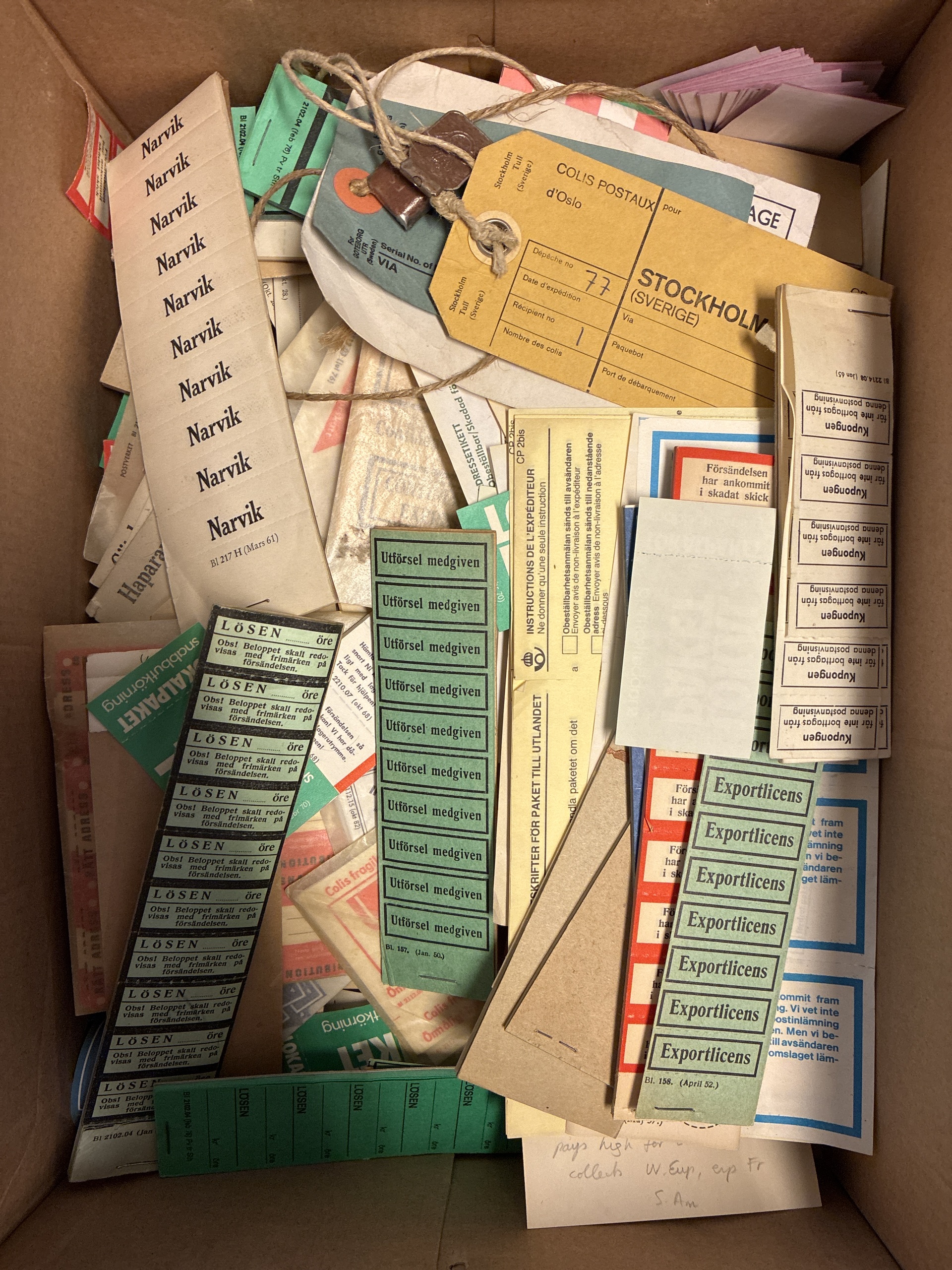Sweden. Postal seals, accumulation 1800–1900s in box. Postal labels a large amount of interesting material. Please see a selection of scans at www.philea.se. Mostly good quality. (>1000)