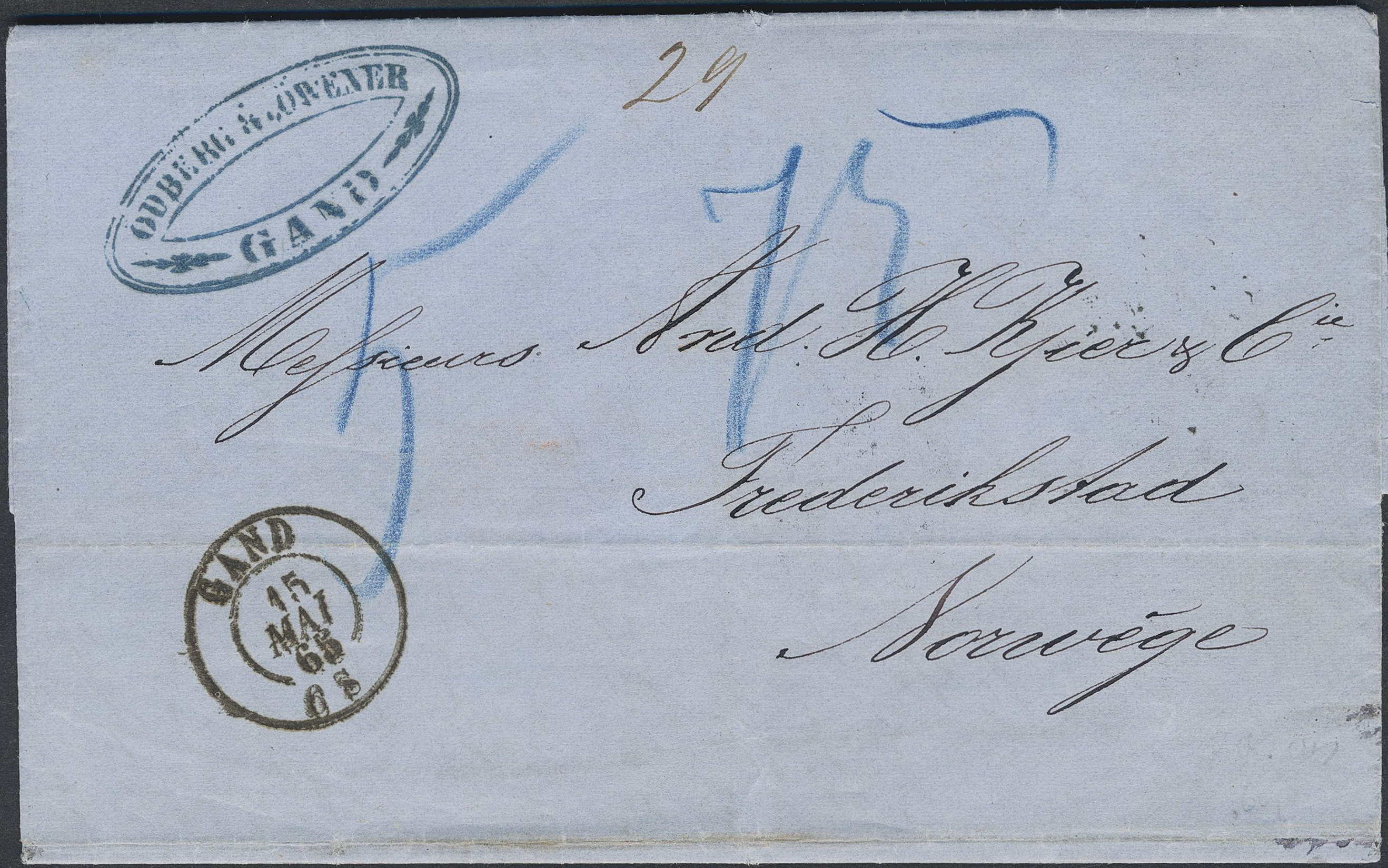 Norway. Prephilately. Incoming letter sent from GAND 15.MAI.65 via SÖDRA ST:BANAN 18.5.1865 and SVINESUND 21.5.1865 to Fredrikstad.