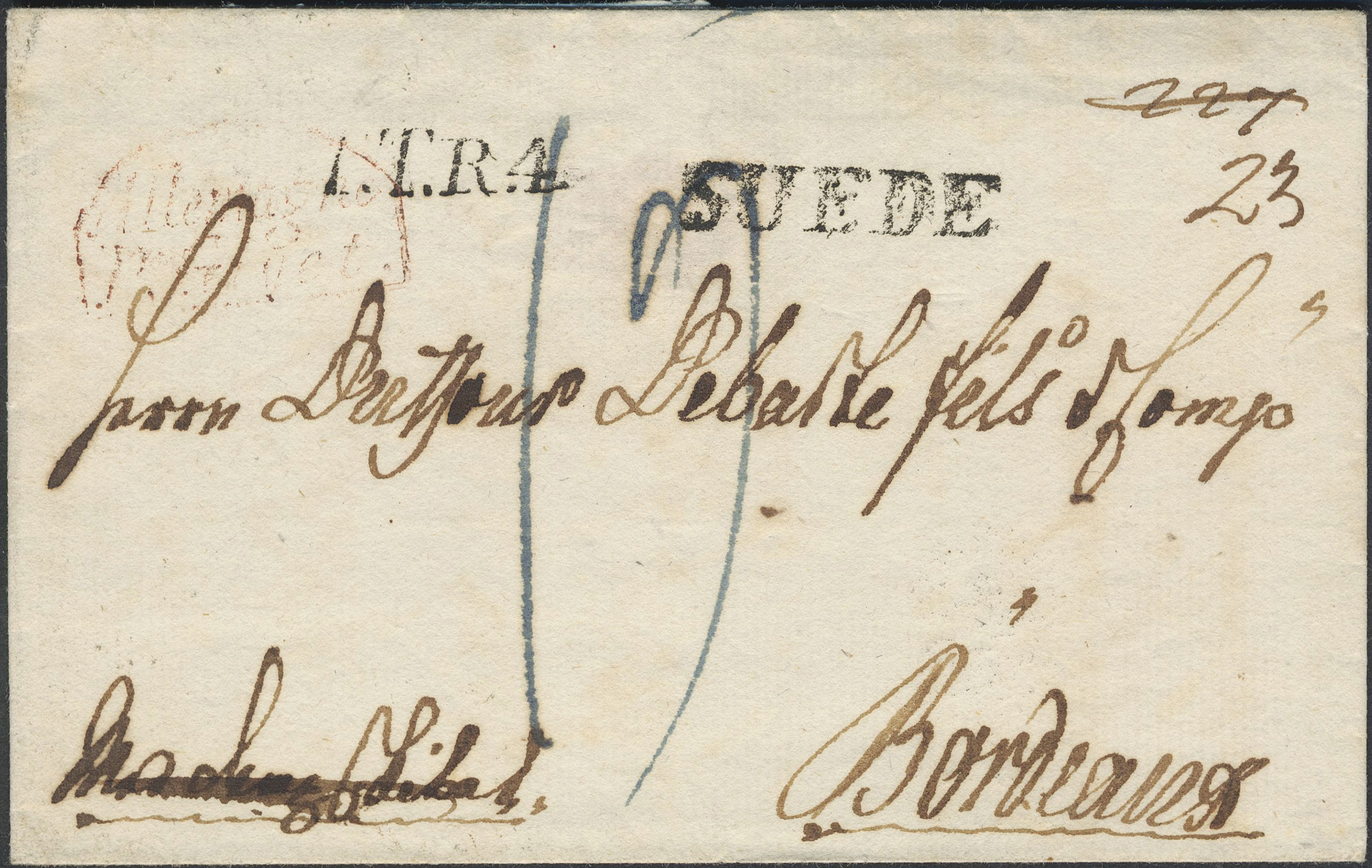 Norway. Prephilately. Cover sent from 'Drontheim le 15 aout 1829' to Bordeaux, with cancellations SUEDE and T.T.R.4.