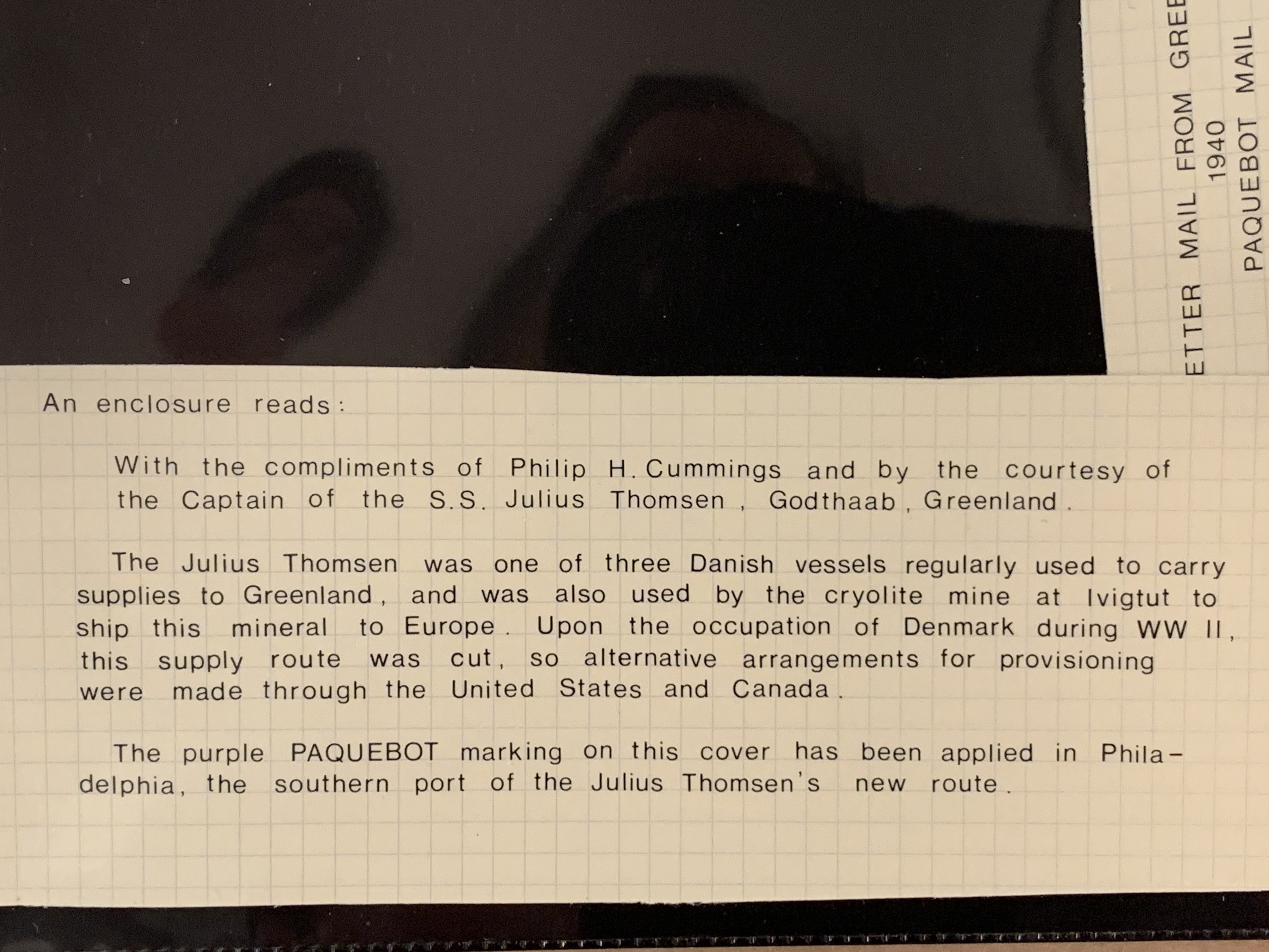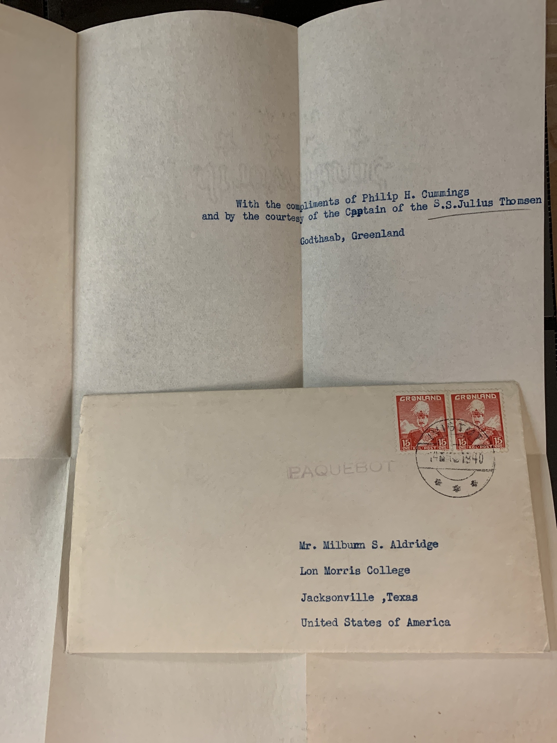 Greenland. Facit 5 on cover, 1938 King Christian X 15 øre red in pair on cover with content from IVIGTUT 14 XX 1940 to USA. The purple PAQUEBOT stamp has been applied in Philadelphia. Very rare. Catalogue value 3000.