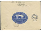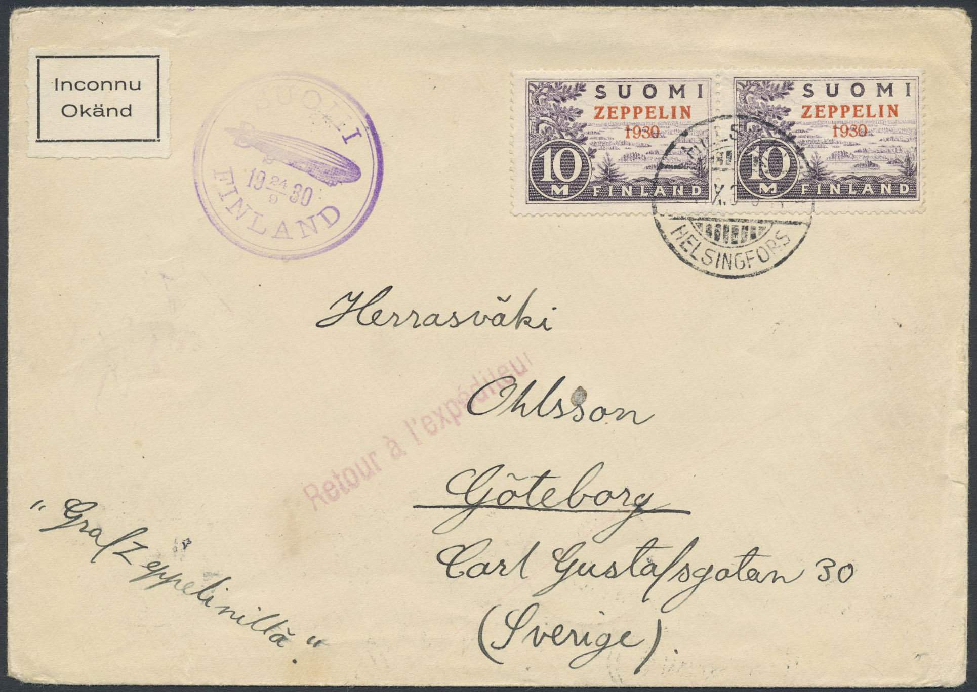 Finland. Facit 165Zf on cover, 1930 Zeppelin overprint 10 Mk red on light grey-violet (2). Pair on cover sent to Sweden, returned. With nice Concordia label on back. SEK 4000