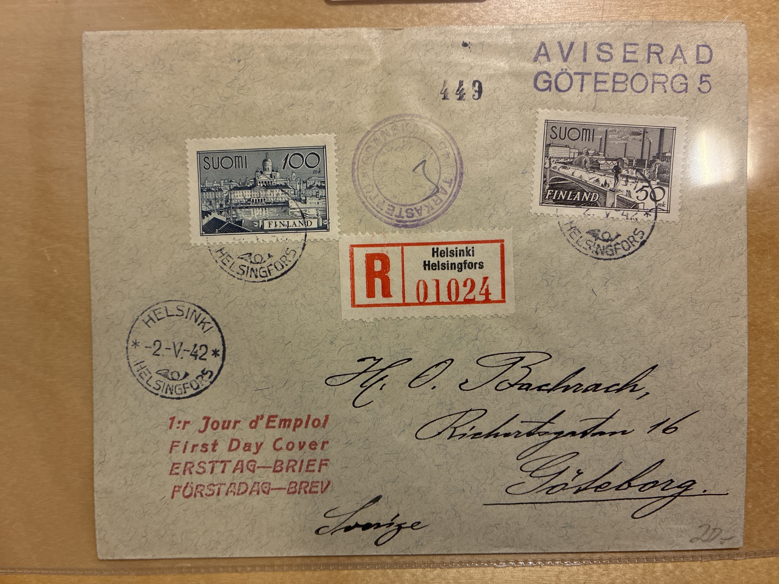 Finland. Facit 263, 264 on FDC, Registered, HELSINKI 2.V.42 to Sweden.