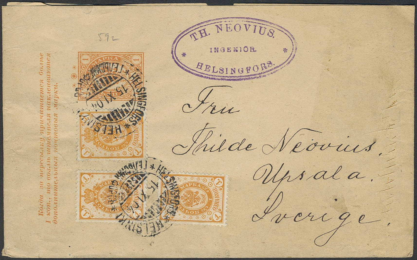 Finland. Postal stationery Facit 35, Postal Stationery RS1 wrapper with 35X3 HELSINGFORS 15.XI.04 to Upsala Sweden.