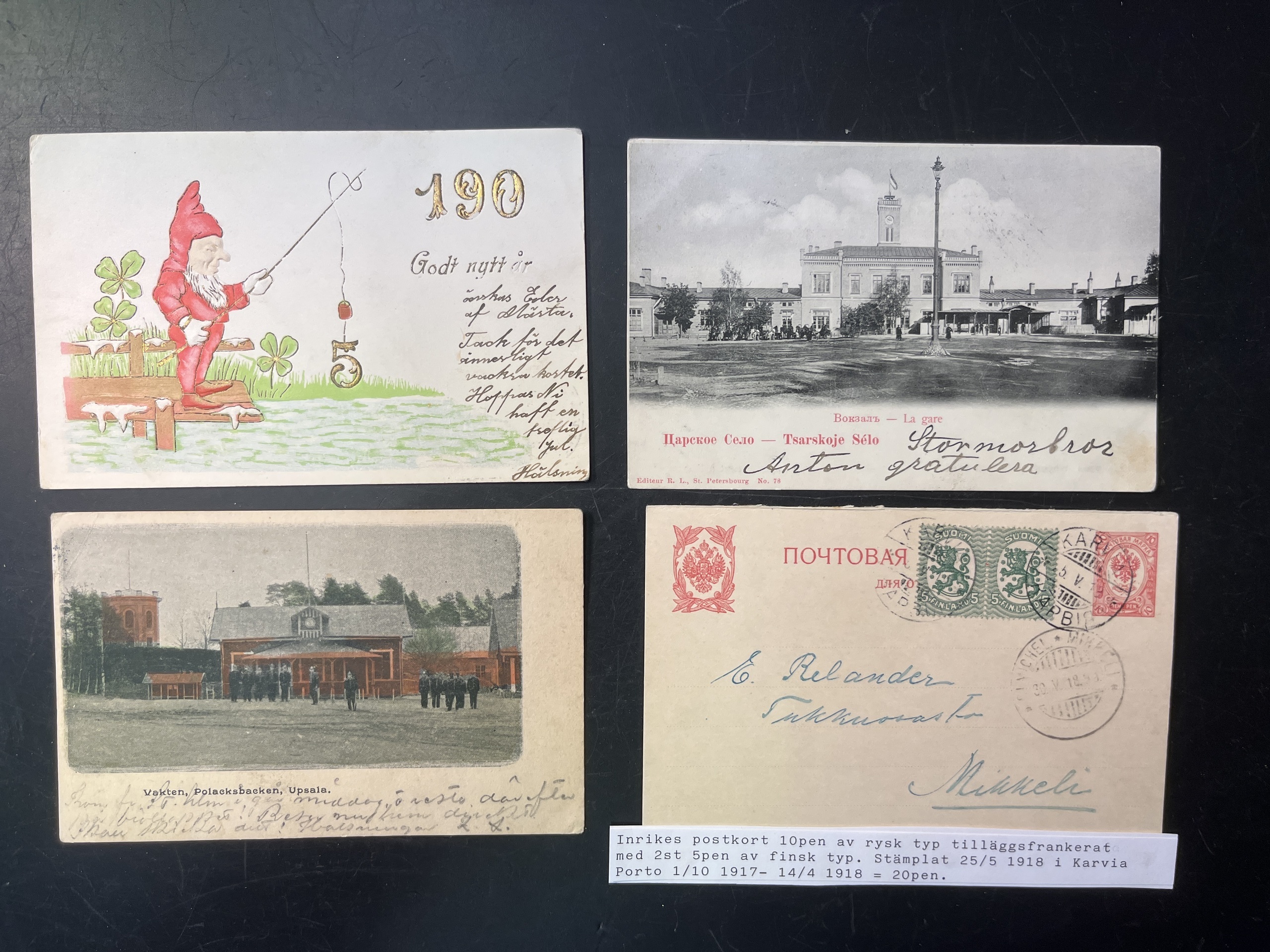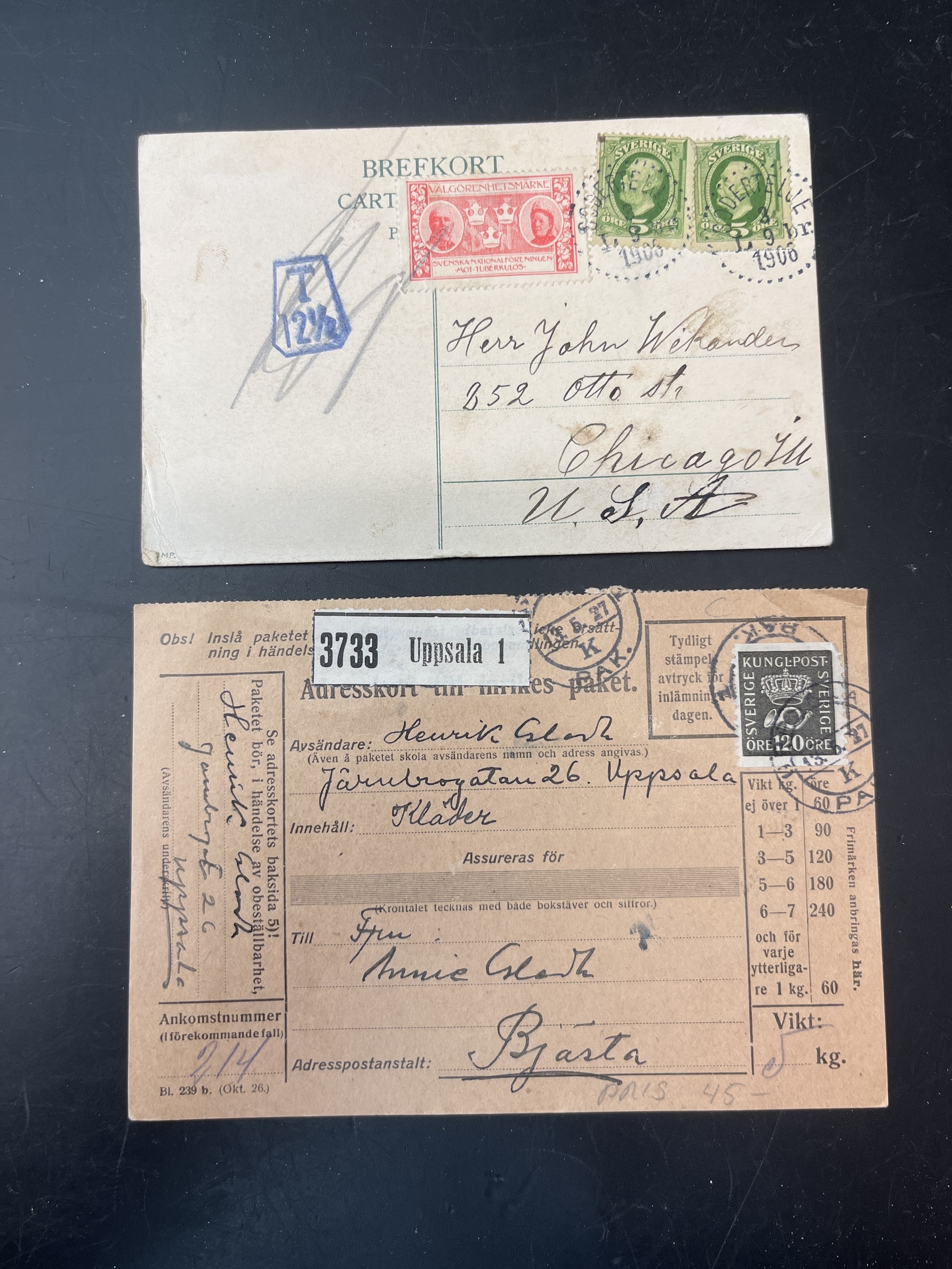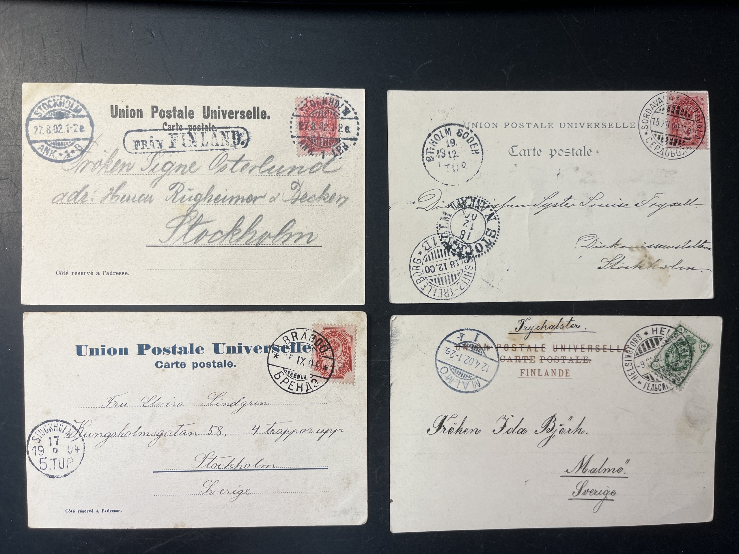 NORDIC COUNTRIES. Accumulation covers Mainly the first half of the 20th century in two albums. With e.g. 85 postcards from Finland (most 1902–05) many to Sweden and 'Figurstämplar/Korkstämplar' on Swedish stamps.