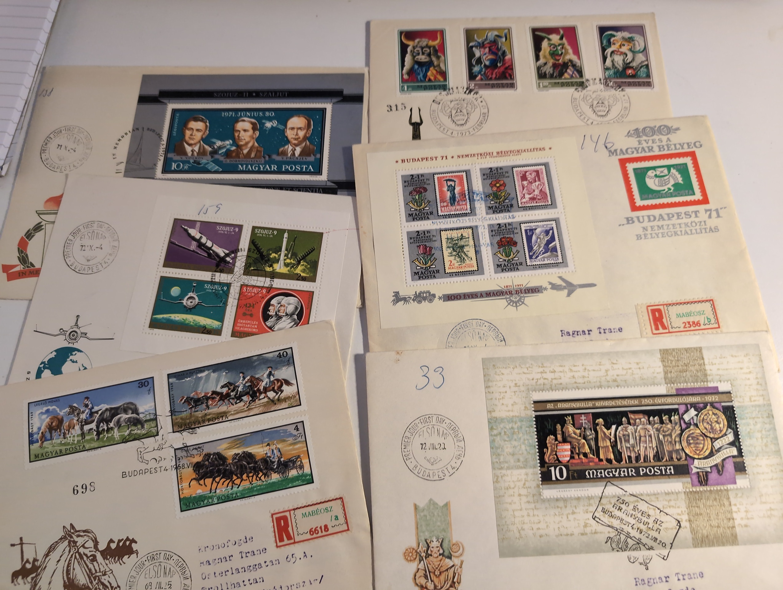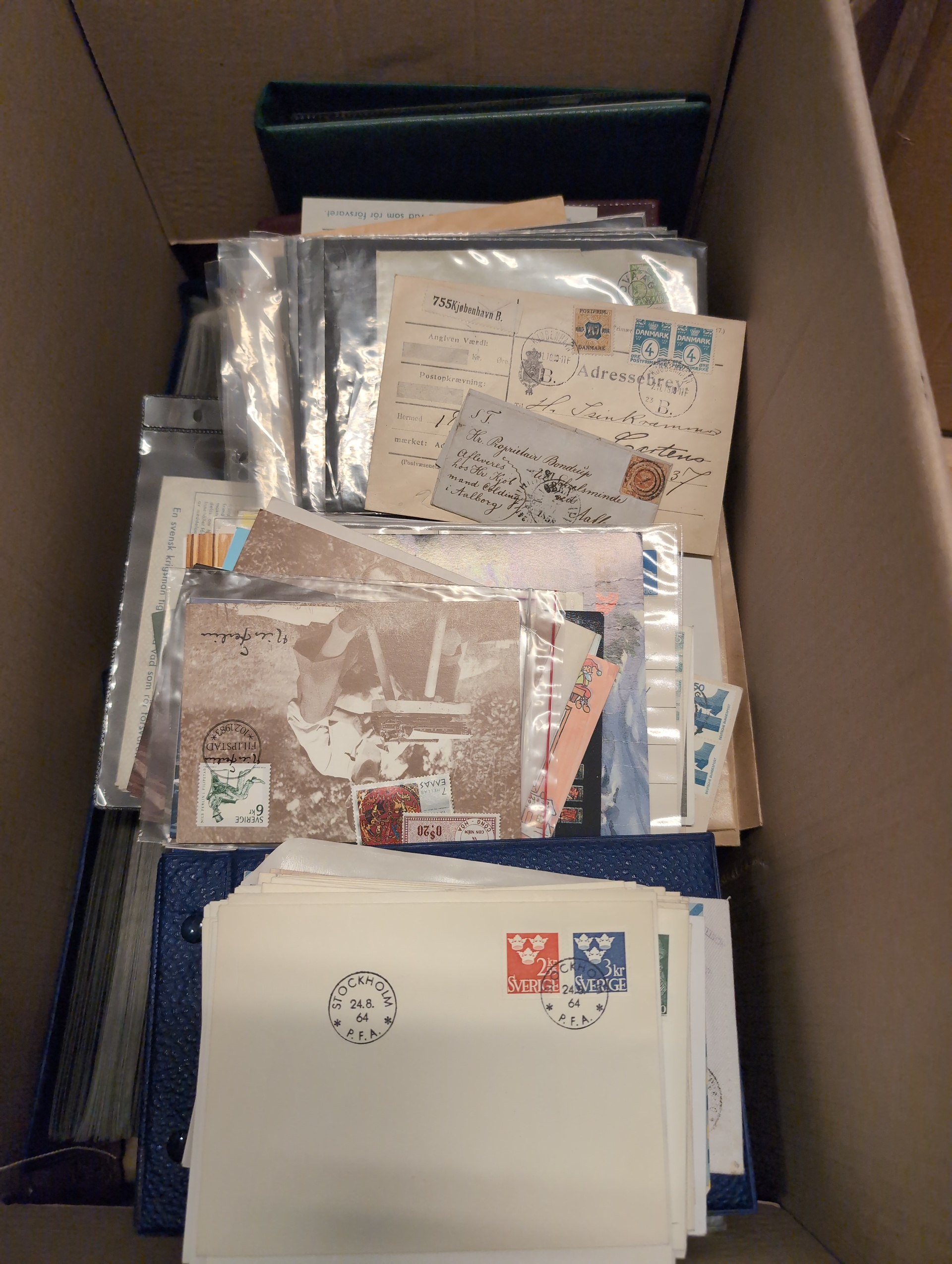 ALL WORLD. Accumulation covers 1850s–2000s in removal box. Mostly FDCs but also some better Denmark and Faroe Islands with danish stamps including a couple of registered and insured covers. FDC includes GB (mostly modern), Finland, Norway, Denmark, Aaland Is, and Hungary incl. a few with souvenir sheets. Please see a selection of scans at www.philea.se. Mostly good quality. Approx. 20 kg.