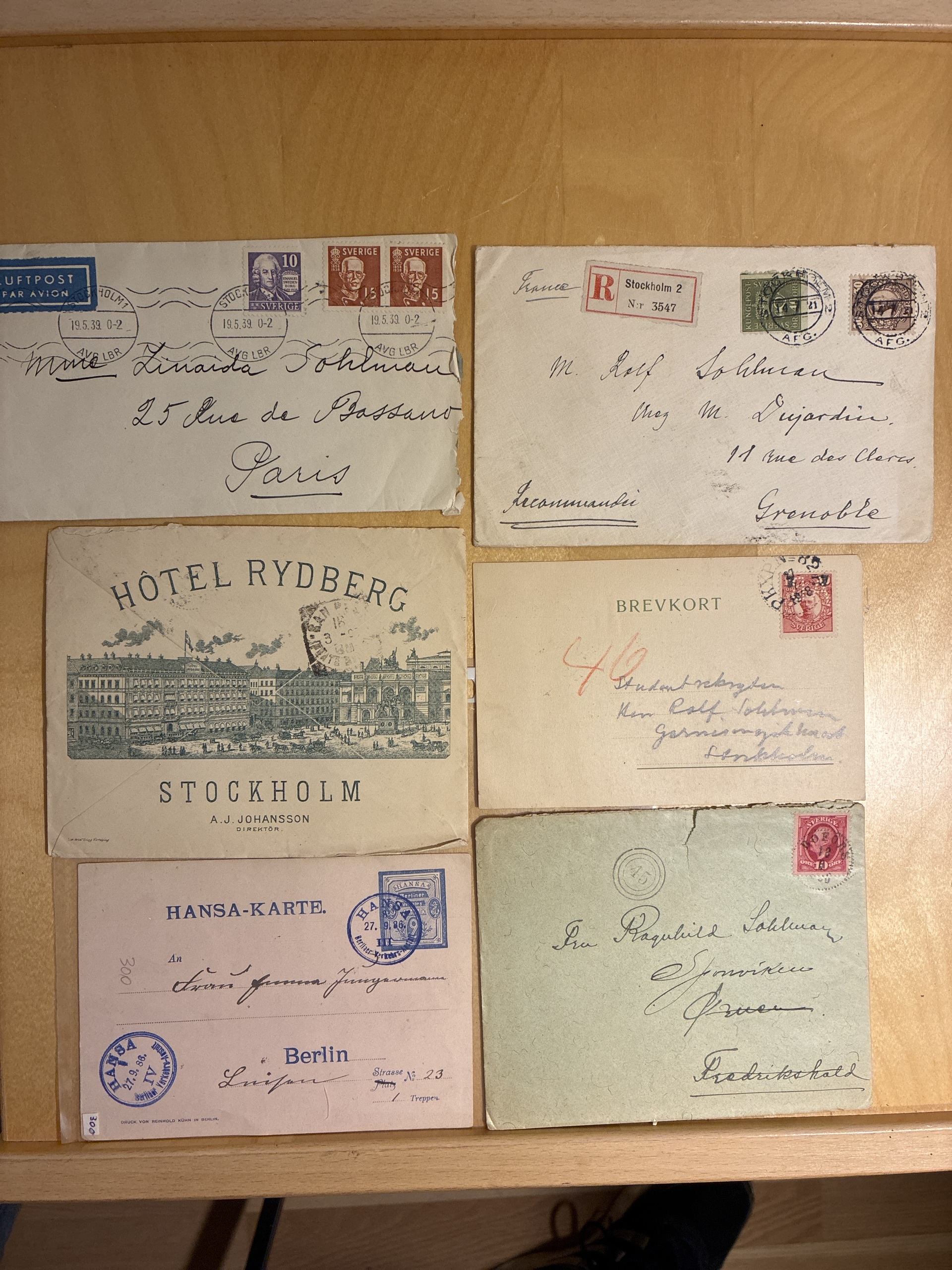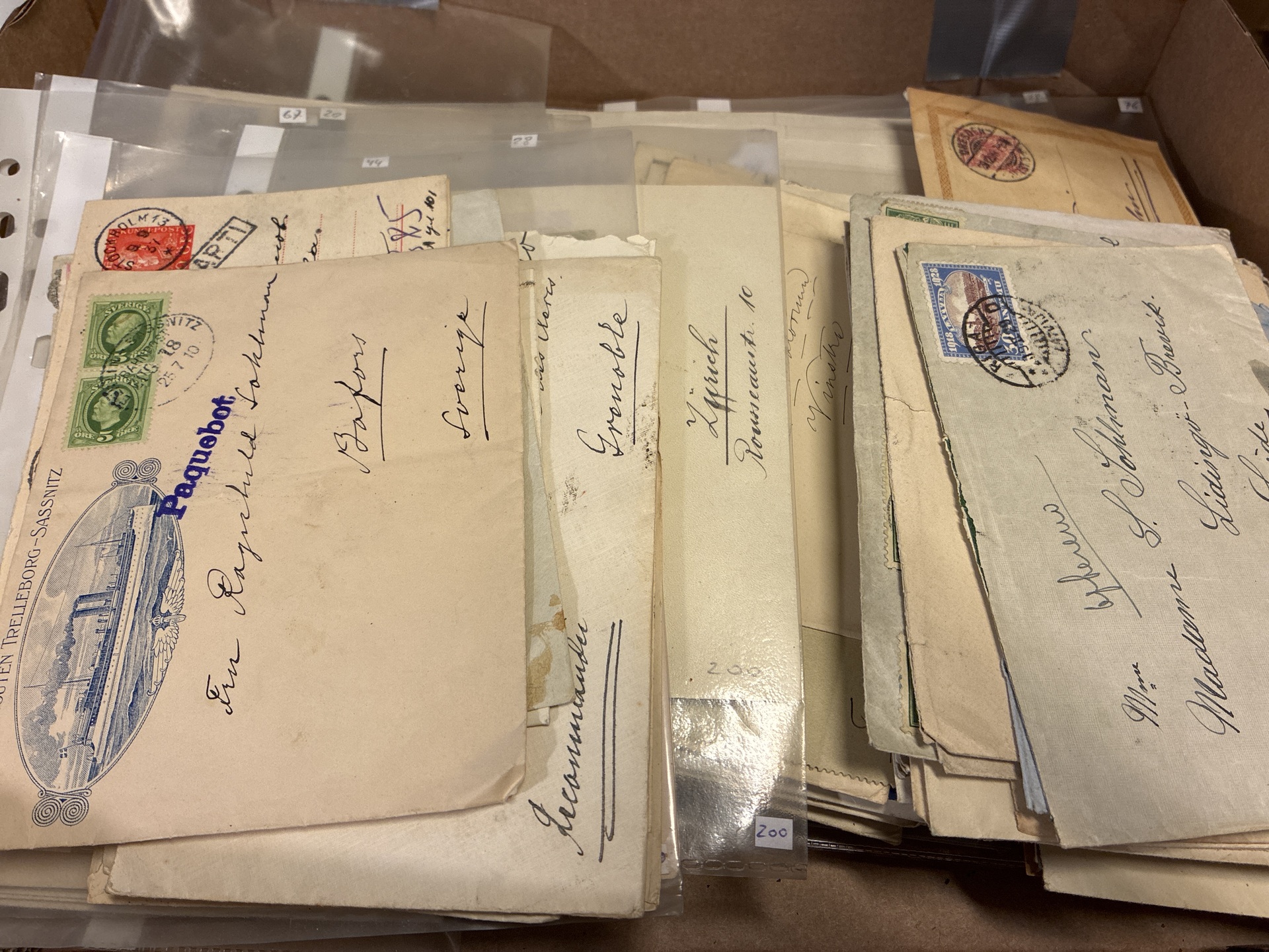 ALL WORLD. Accumulation covers 1860–1940s in box. Box with covers, 60 12 öre Coat of Arms, postal staionery from diffrent countries. Greenland 'Various designs' FDC. Several nice covers. Please see a selection of scans at www.philea.se. Somewhat mixed quality. (ca. 300)