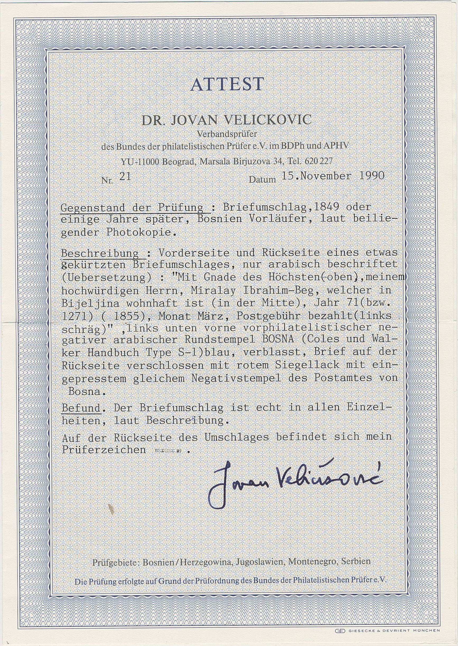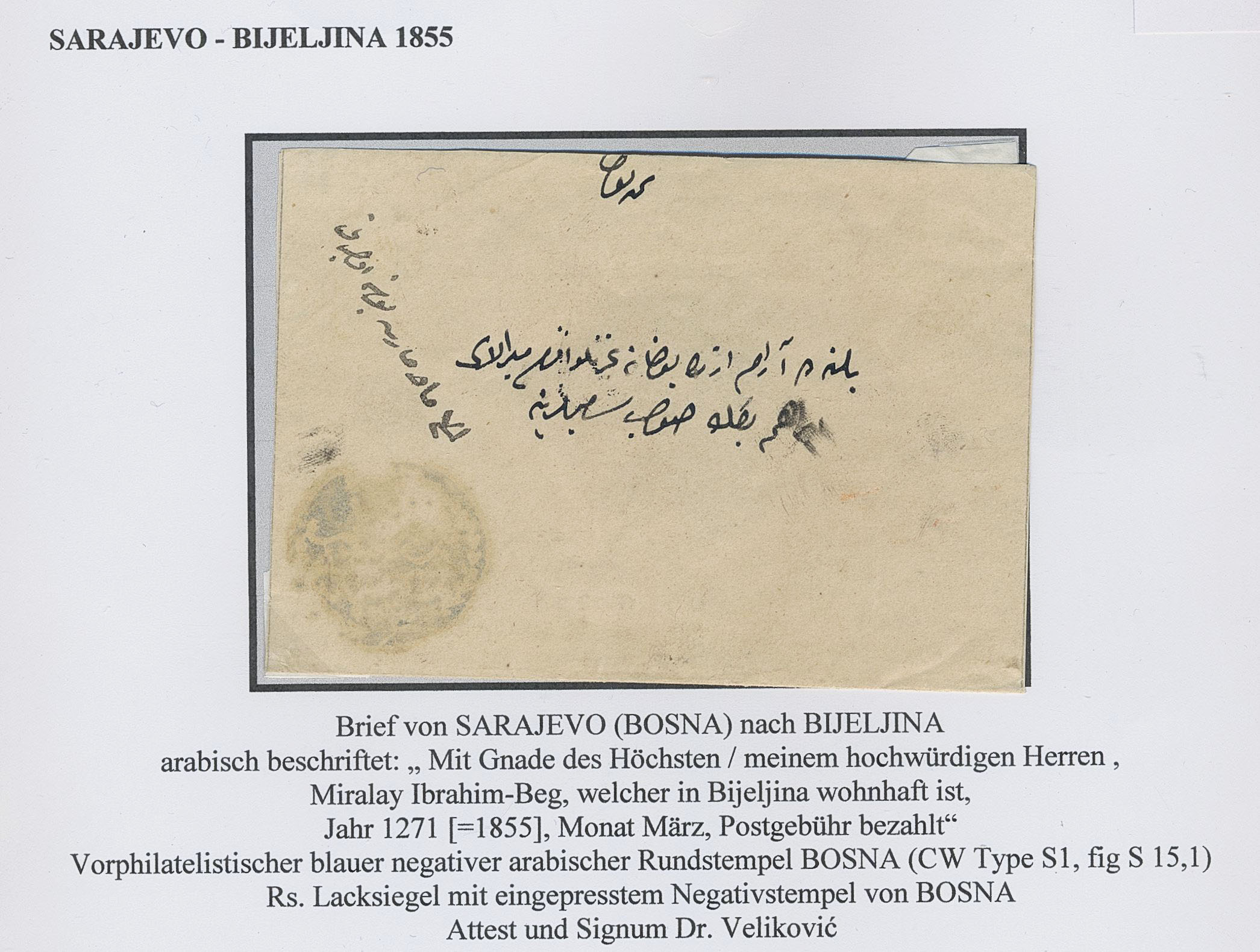 Bosnia and Herzegovina. Prephilately. Pre-philatelic cover sent from Sarajevo (Bosna) to Bijeljina in 1855 with a negative Arabic round cancel Bosna (Coles & Walker S-1) in blue (faded). Sealed on the reverse with a red seal, where the same negative cancel of the Bosna P.O. was impressed. Certificate Velickovic (1990).