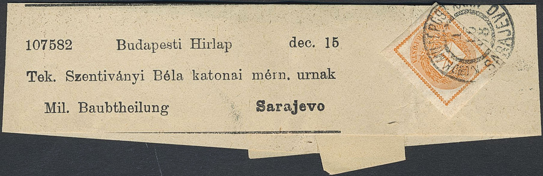 Bosnia and Herzegovina. Cover, 1898 Hungarian Newspaper stamp 1 k orange-red imperf, wmk 2 (Mi 53X) on Newspaper wrapper, cancelled upon arrival with military postmark SARAJEVO 1.10.98. Scarce.