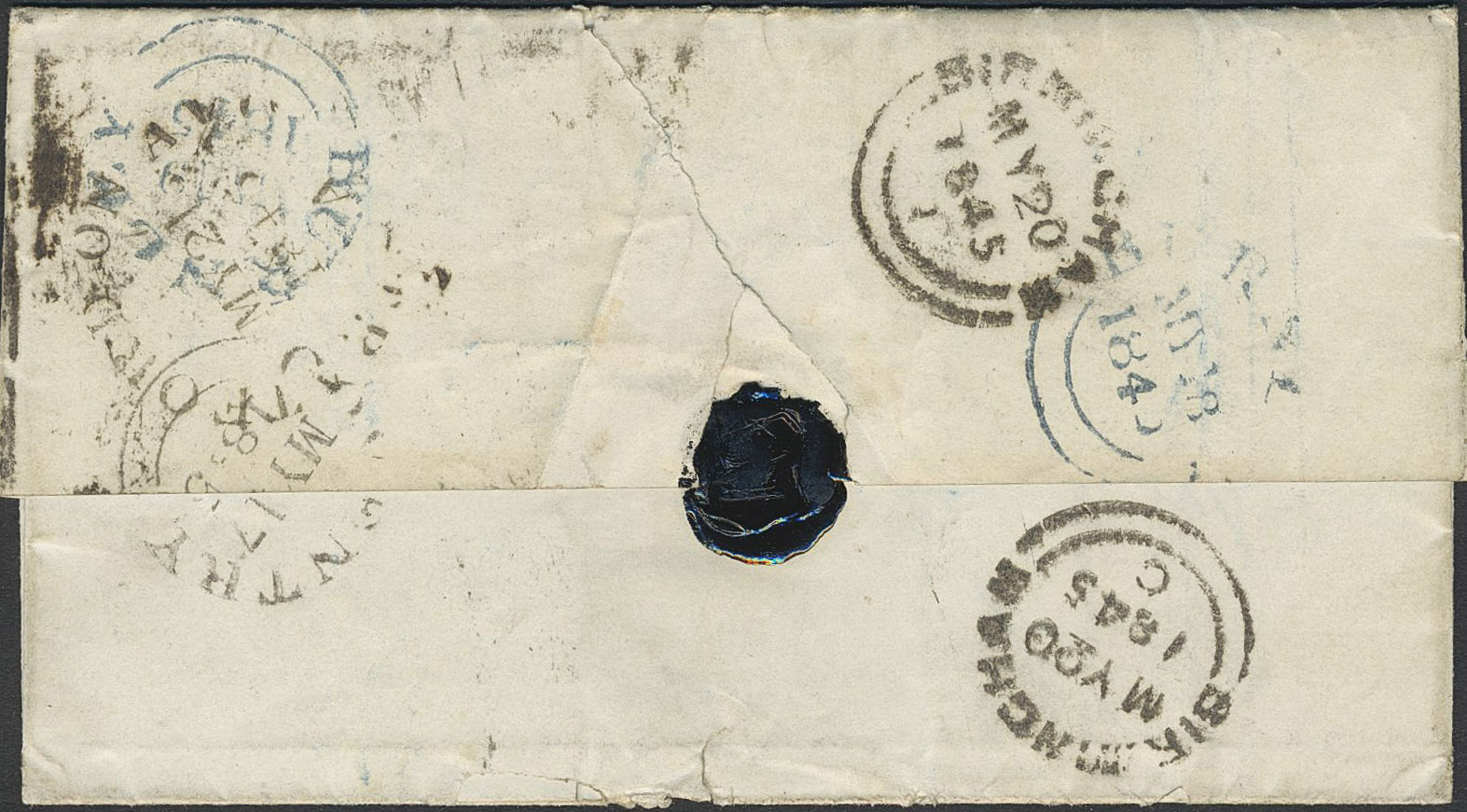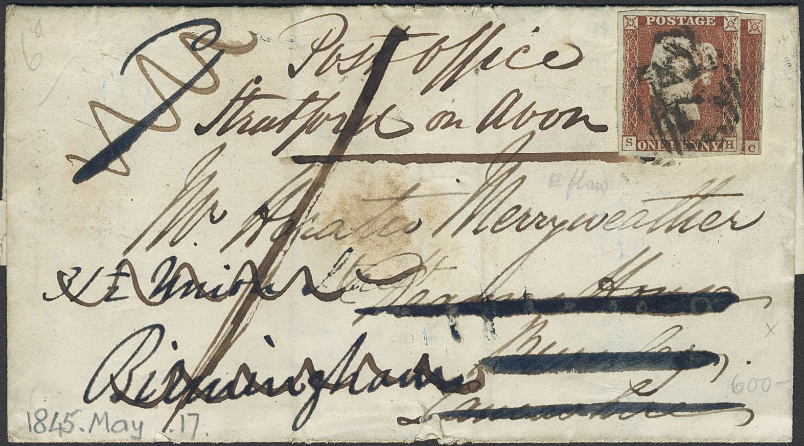 Britain. Michel 8 on cover, Cover sent to Birmingham re-directed to 'Post Office' Stratford upon Avon with extra fee paid by an extra stamp partly affixed on top of the original stamp. With several cancels on the back.