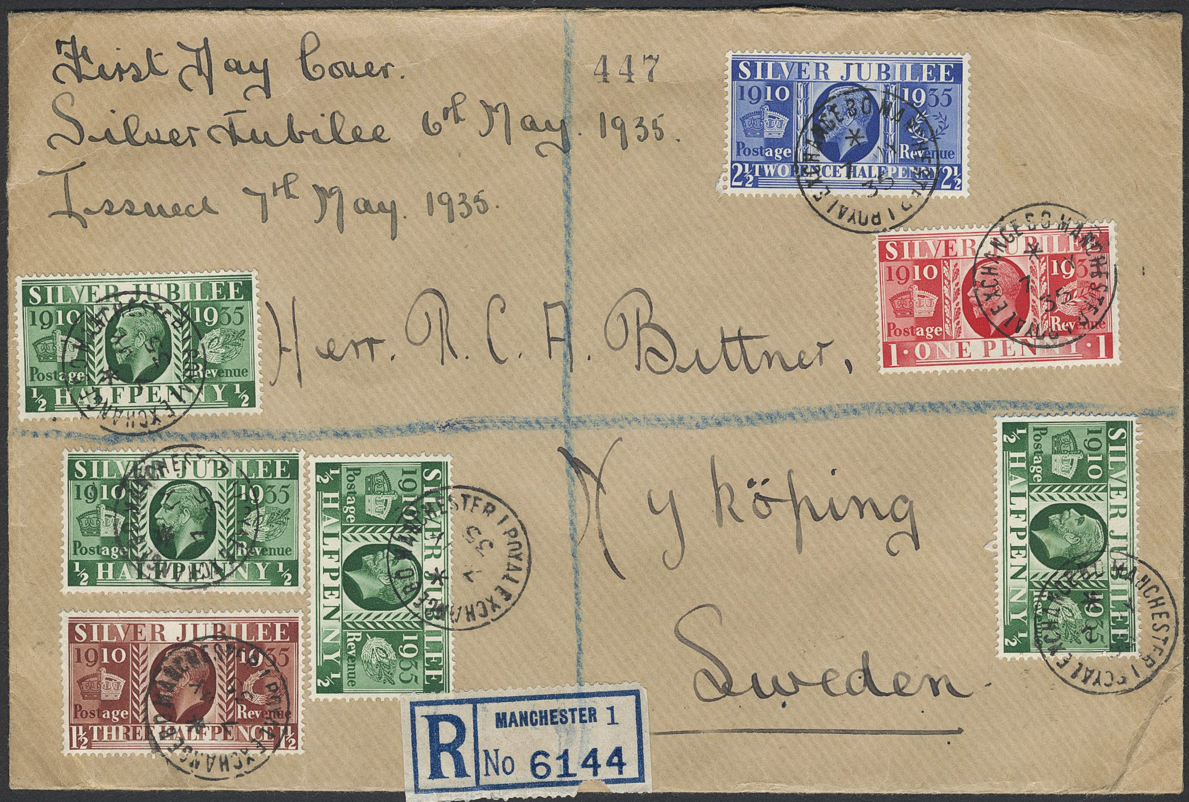 Britain. FDC, Michel 189–92, Registred, privately made, FDC celebrating the Silver Jubilee of the reign for King George V, cancelled Royal Exchange P O Manchester, May 7, 1935 and sent to Nyköping, Sweden. EUR 750