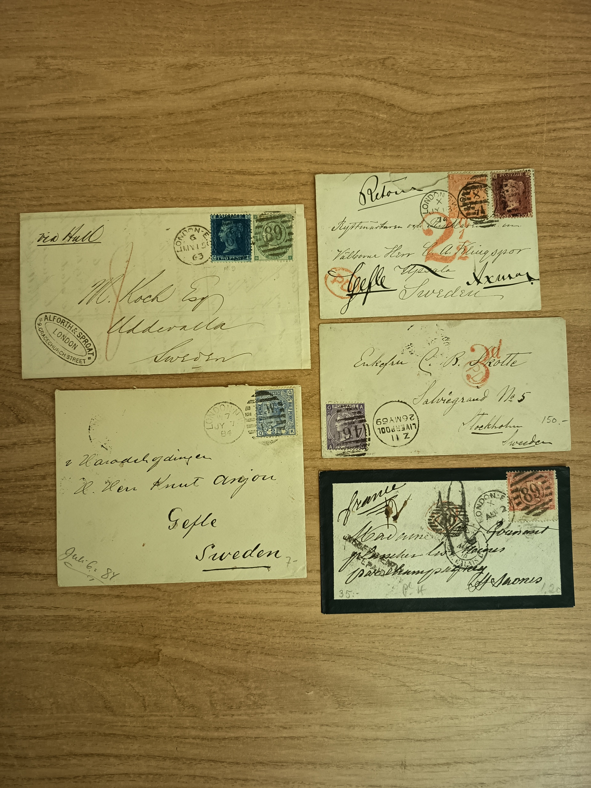 Britain. Lot covers 1863–1884. Four covers to Sweden and one to France. The entire lot is presented at www.philea.se. Good quality. (5)