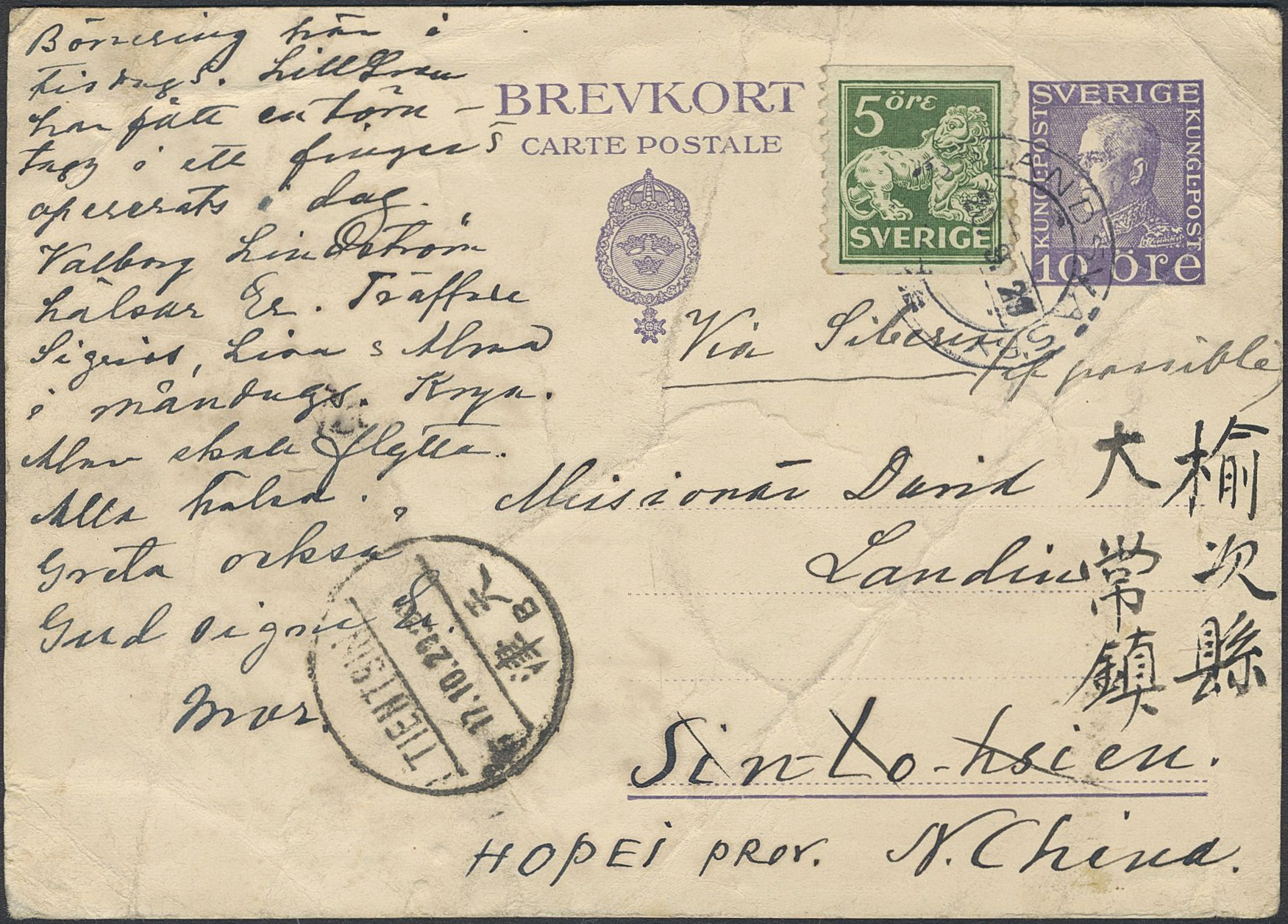 China, Incoming mail. Michel bKe31, F143A on cover, Sweden. Postal card 10 öre additionally franked with 5 öre, sent from UPPLANDS VÄSBY 20.9.29 to Hopei (Hebei), via TIENTSIN 17.10.29. Creases and somewhat worn.