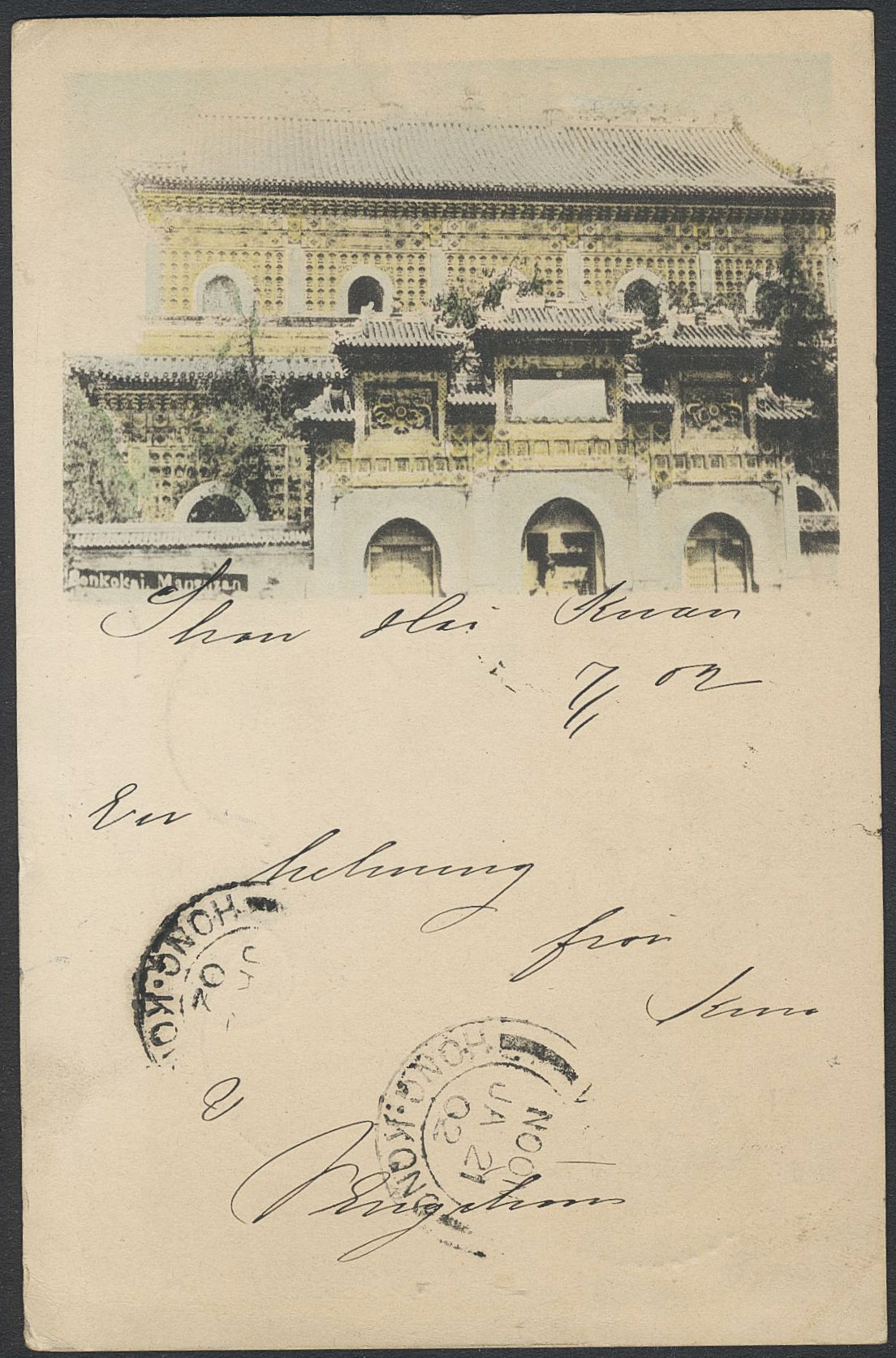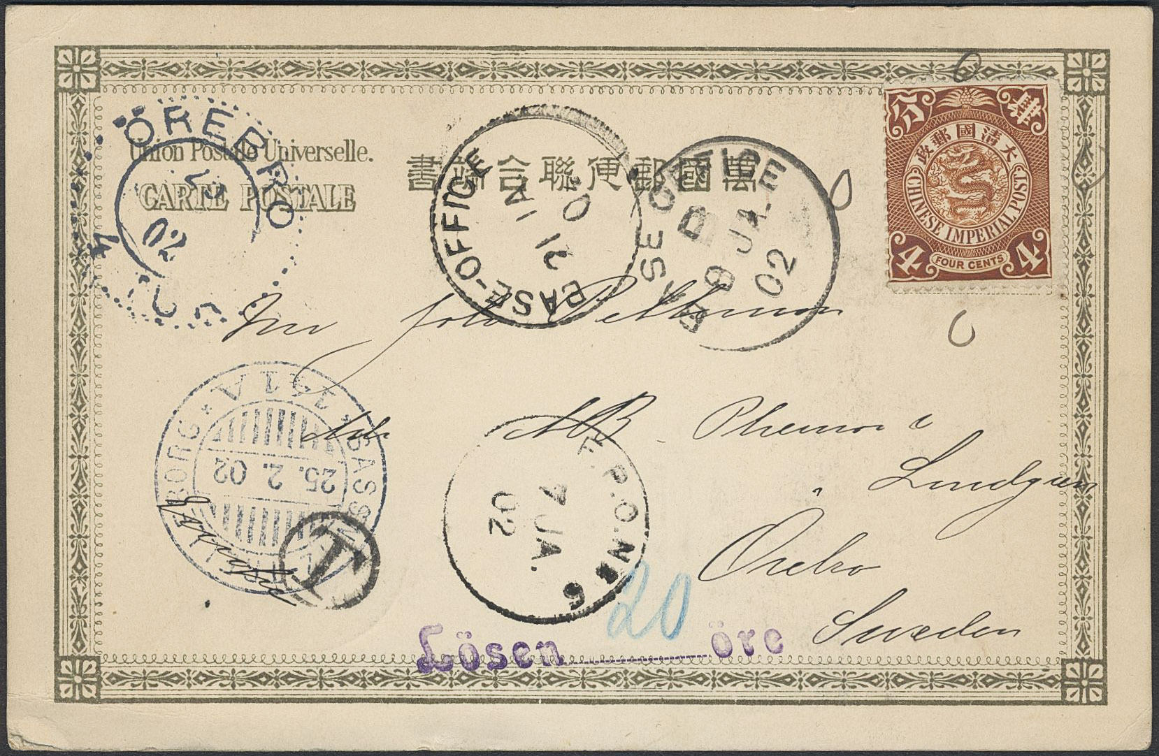 China, Empire. Michel 50 on picture postcard, Sent to ÖREBRO, Sweden. Cancelled F.P.O No. 6. 7 JA 02, additional cancels Base-Office 8 JA 02 and 21 JA 02, SASSNITZ-TRELLEBORG 25.2.02 and arrival cancel ÖREBRO 25 (FEB) 02 4 TUR and on front V(ICTORIA) JA 21 HONG-KONG. 4c dragon stamp invalid for postage with 0. T in circle and Postage Due 'Lösen 20 öre'. Scarce cancels from the British Forces in China.