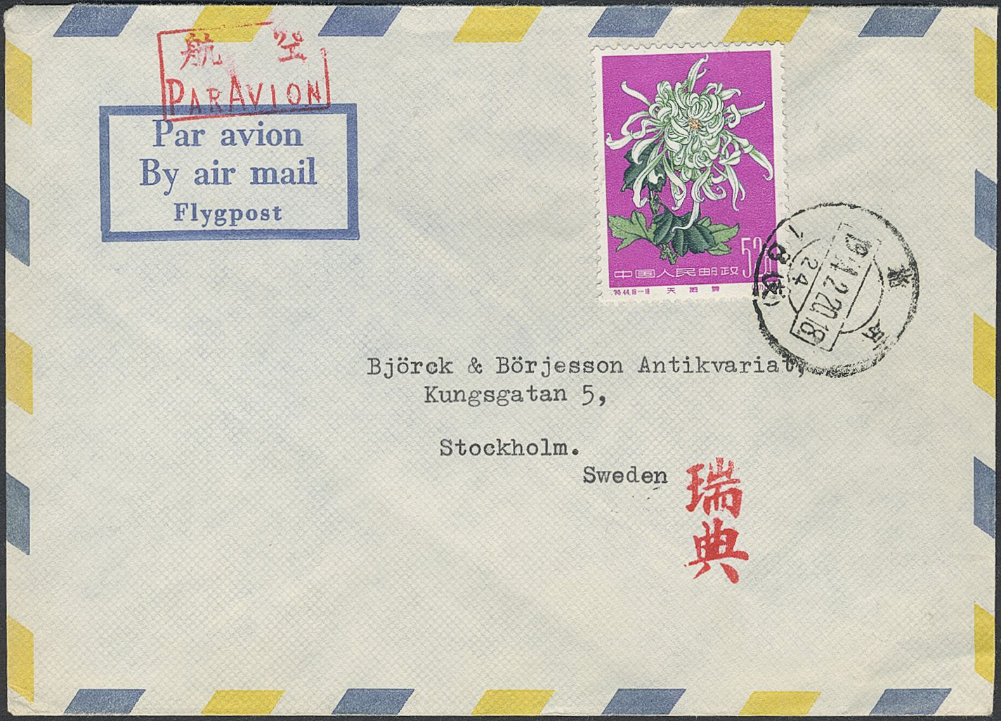 China, People’s Republic. Michel 575 on cover, Chrysanthemum 52 F on airmail cover to Sweden.