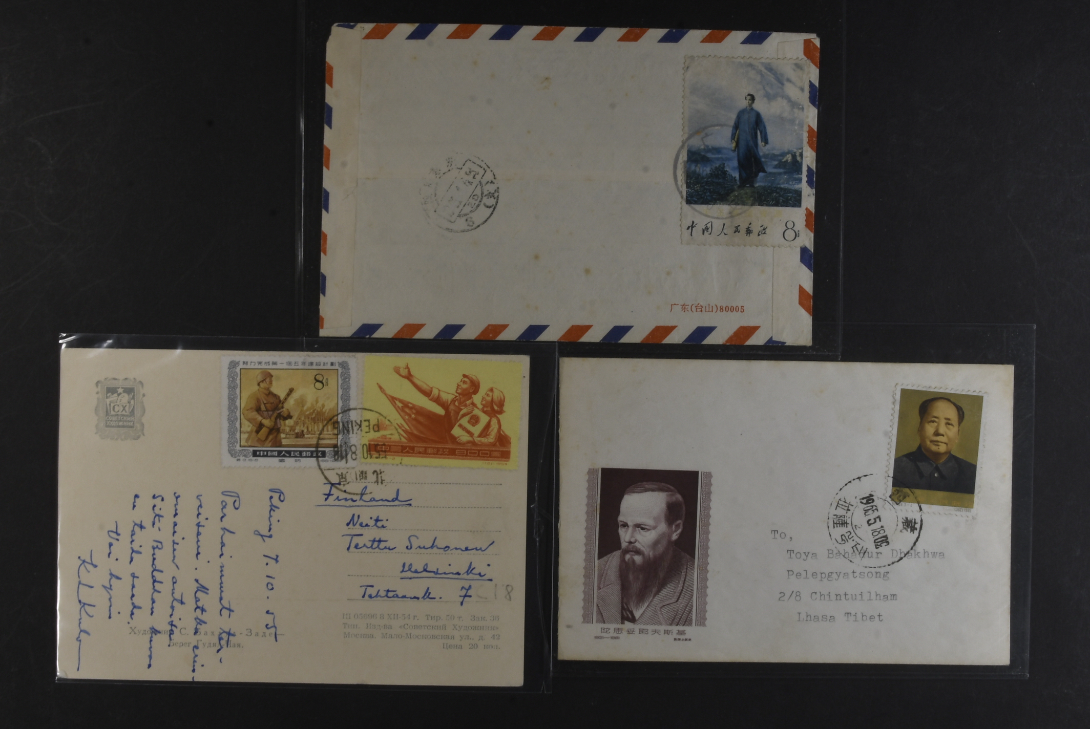 China, People’s Republic. Covers. Three covers/cards 1955–1965 franked with different stamps. One inland cover with Chairman Mao goes to Anyuan (damaged), one card sent to Tibet 1965 with 8 f SG 2236, and a card sent to Finland 1955.