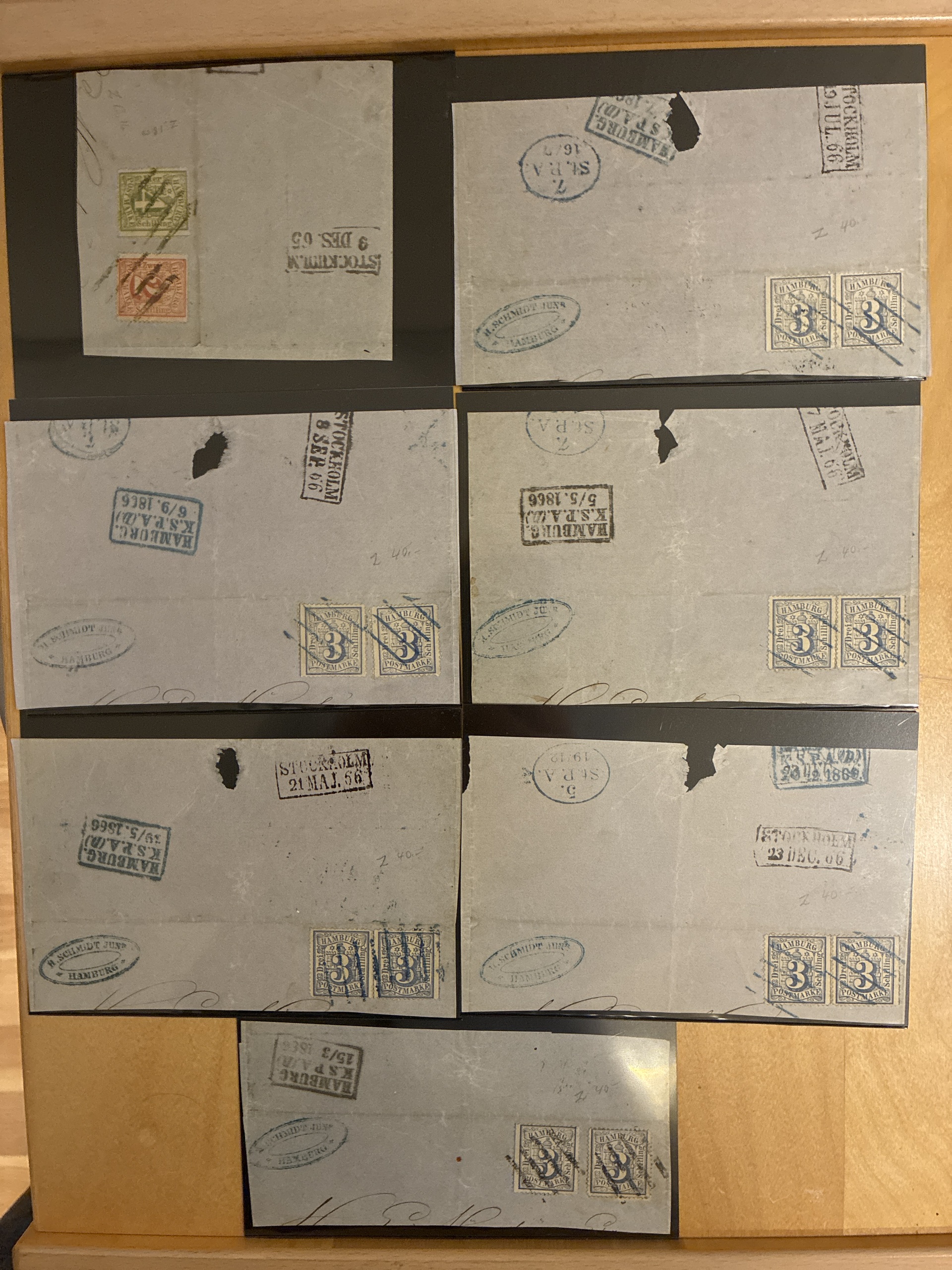 Germany, Hamburg. Lot cut pieces 1865–66 in envelopes. Seven large parts of covers Mi.13, 15, 16 with transit postmark STOCKHOLM (low typ) and HAMBURG K.S.P.A (D) black or blue. The entire lot is presented at www.philea.se. Somewhat mixed quality. (14)