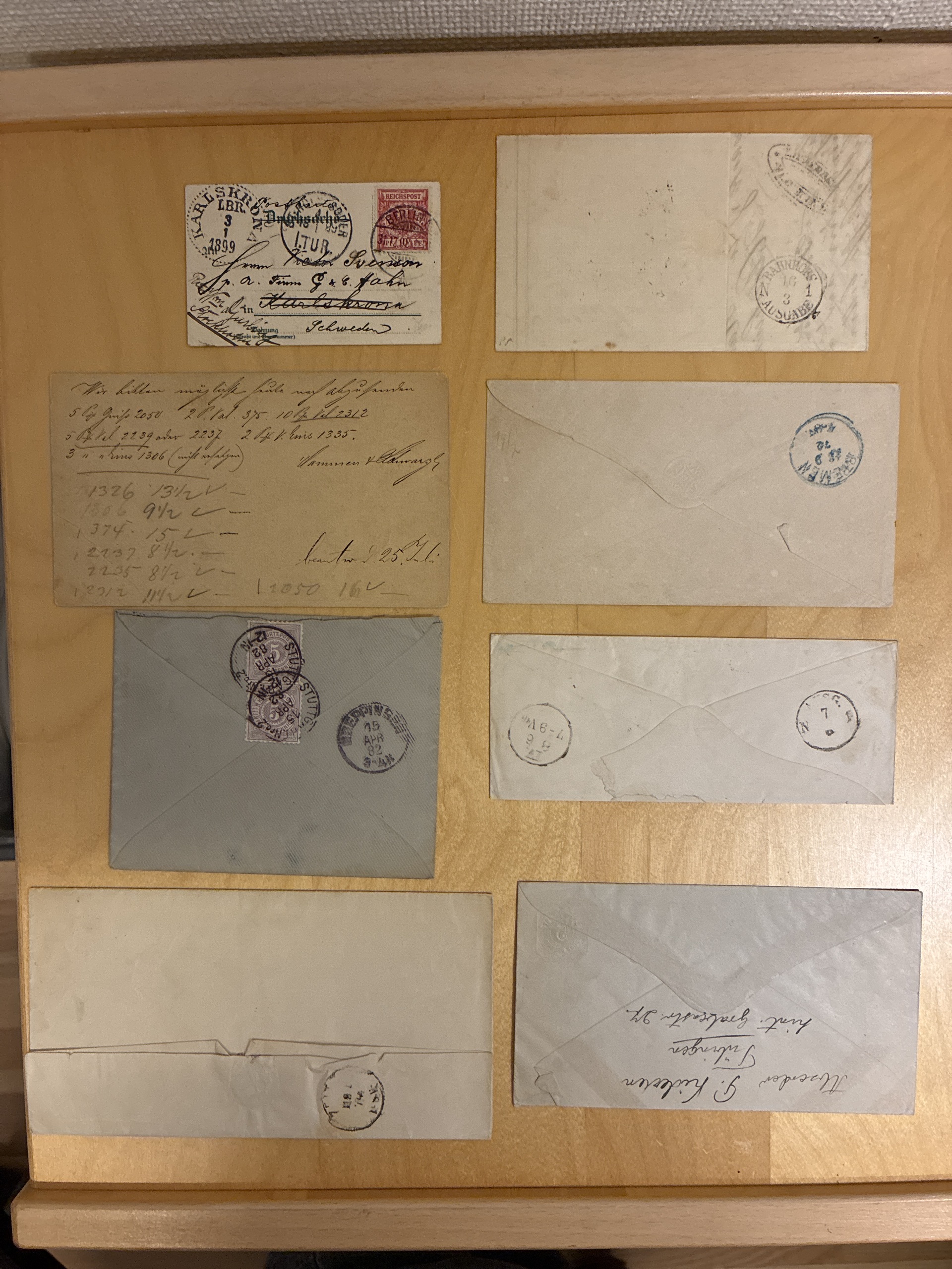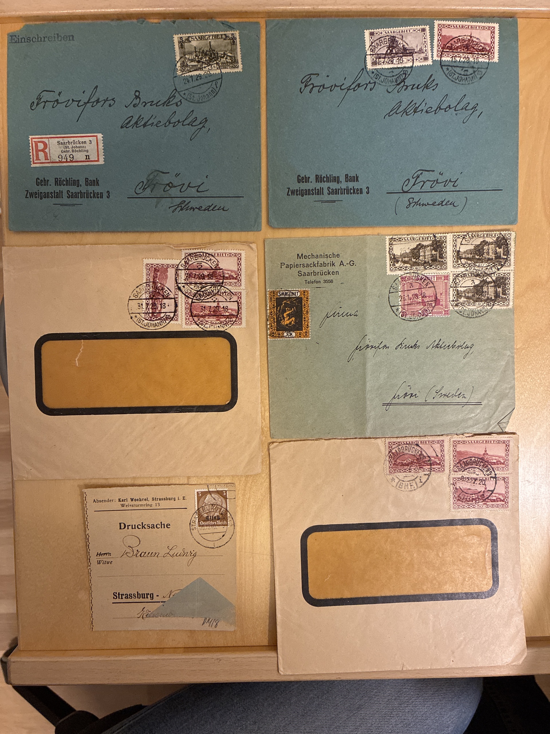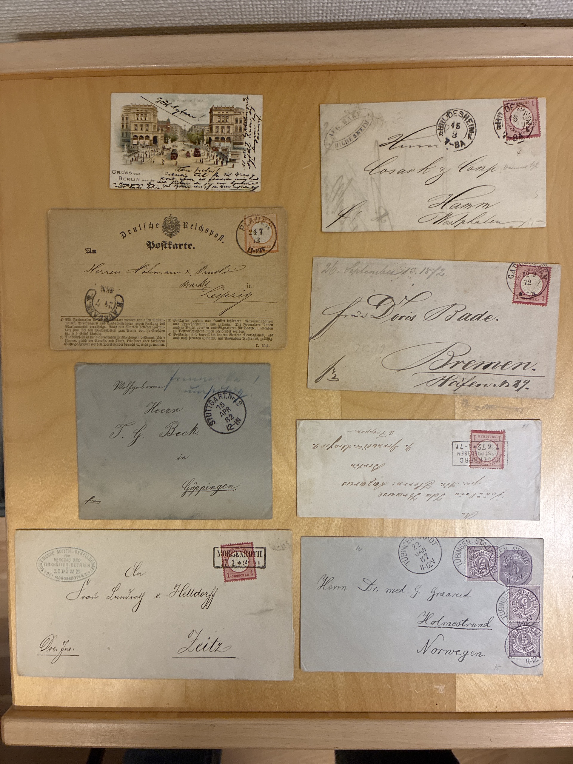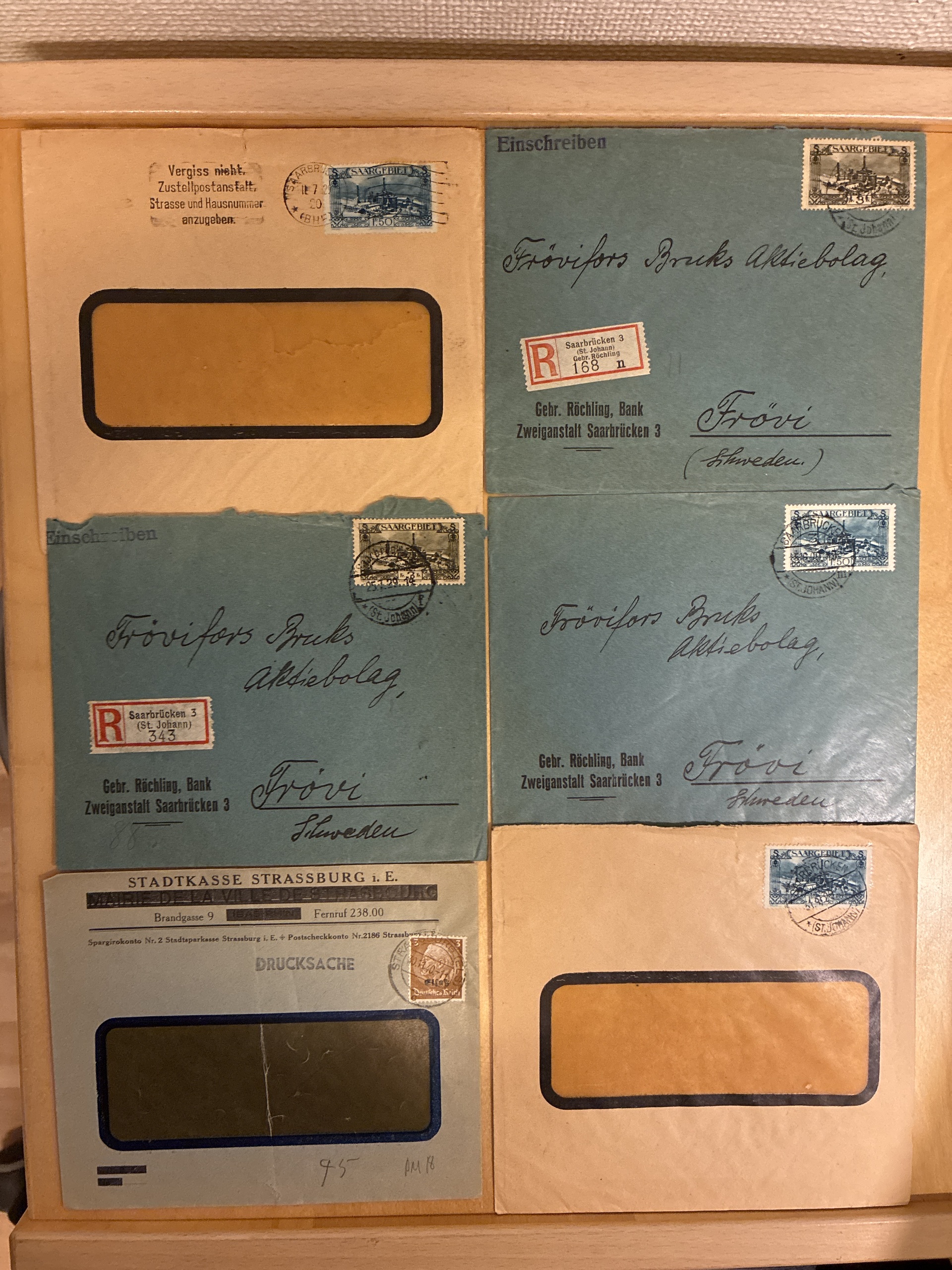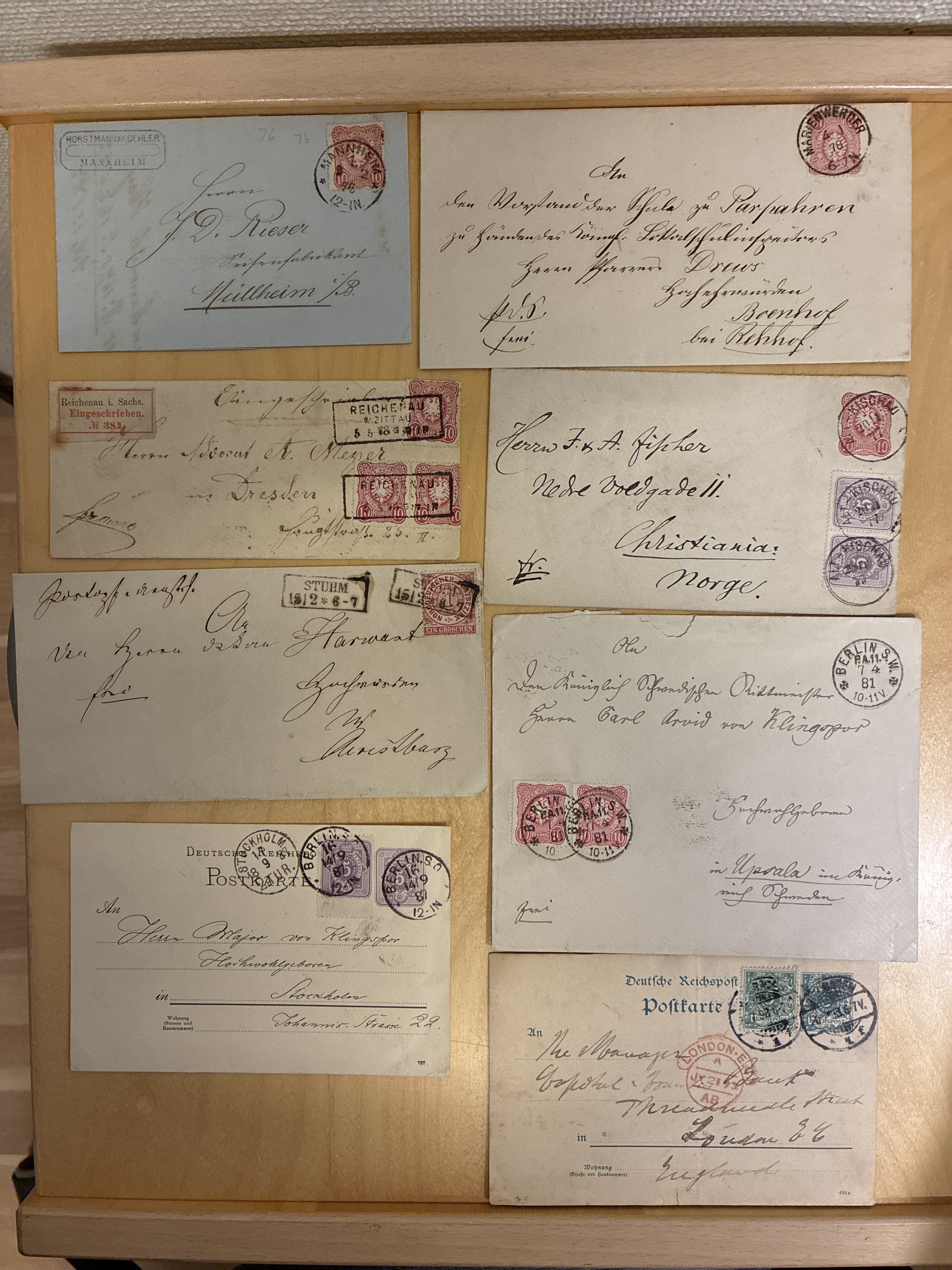 Germany, Reich. Covers 1870–1930 on leaves. 28 covers/postcards, several beatiful. Five with shields, one small 'gruss aus Berlin' to Sweden ca. 9x5.5 cm 1898 and some Saargebiet. The entire lot is presented at www.philea.se. Good quality.