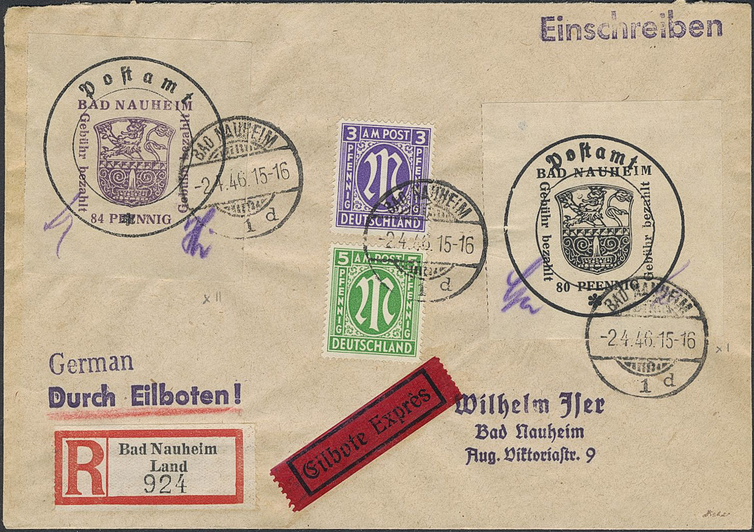 Germany, local issues. Michel 4–5. Cover. Bad Nauheim. Postal seal labels used as stamps 80 pf, 84 pf + AM Post 3, 5 pf on philatelic reg. express cover.