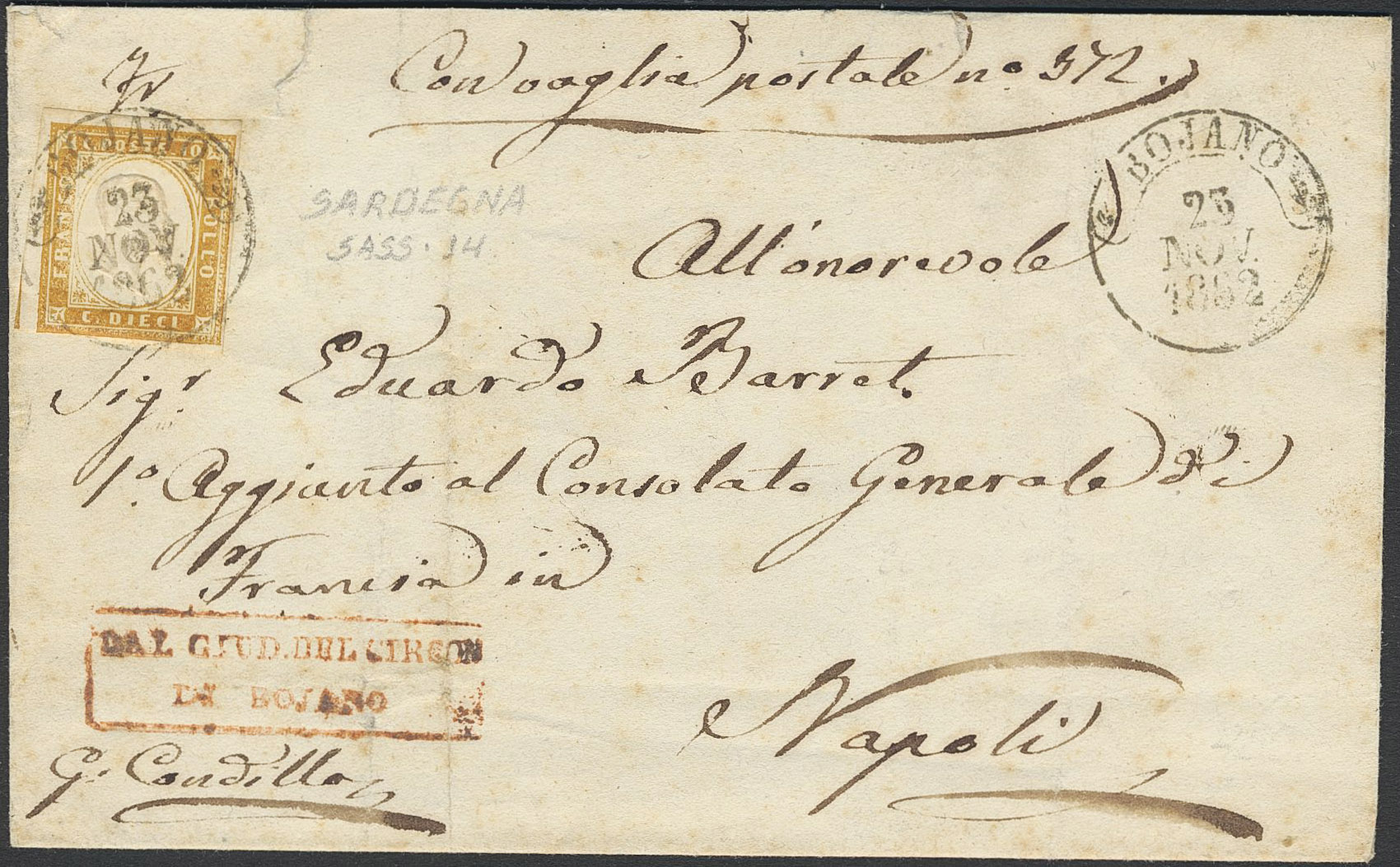 Italy. Michel 9b on cover, Cover from BOJANO 23 NOV 1862 to NAPOLI 25 NOV 62.Closely cut at the lower margin.
