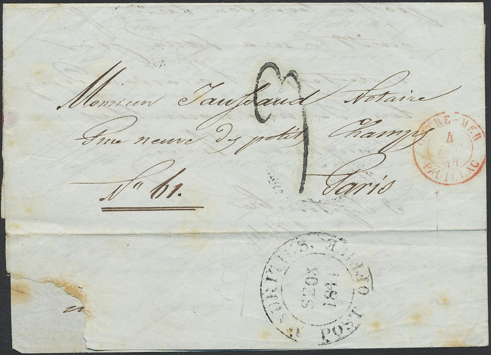 Mauritius. Prephilately, Prephilately. Cover MAURITIUS POST OFFICE SE 03 1844 to France, French postage due mark and red OUTRE – MER PAUILLAC 4 NOV 44, on back PARIS 7 DEC 44.