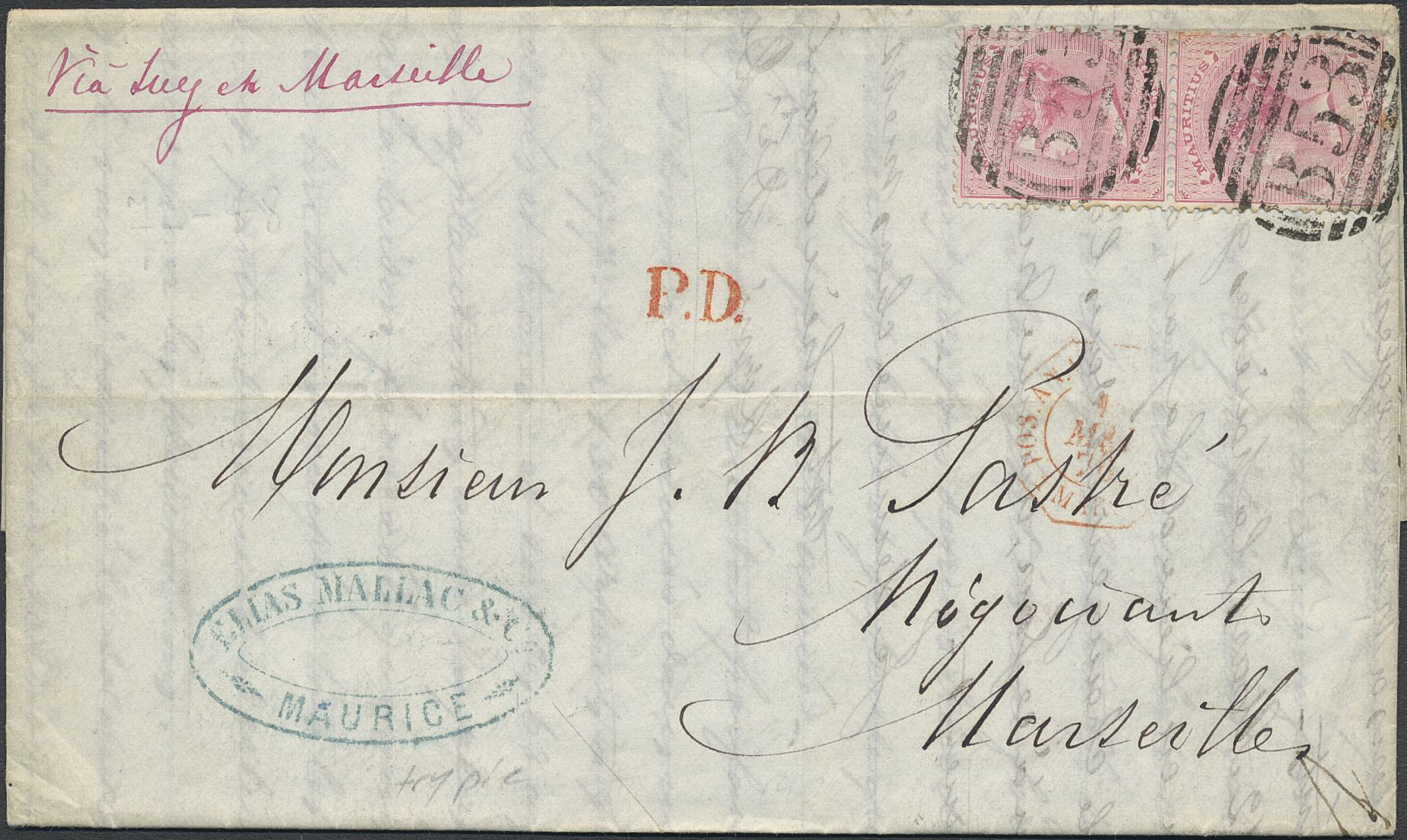 Mauritius. Michel 30 on cover, Q V 4 p in pair on cover cancelled B53, on back MAURITIUS MR 31 76 sent to France.