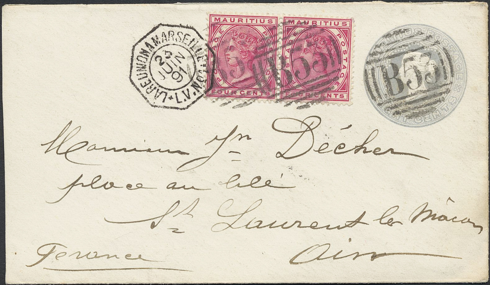 Mauritius. Michel 68 on cover, Q V 4 c in pair on 8 c postal stationary envelope cancelled B53, on back Mauritius B JU 2 91, on front LA REUNION A MARSEILLE L.V. No 1 23 JUIN 91 sent to France.