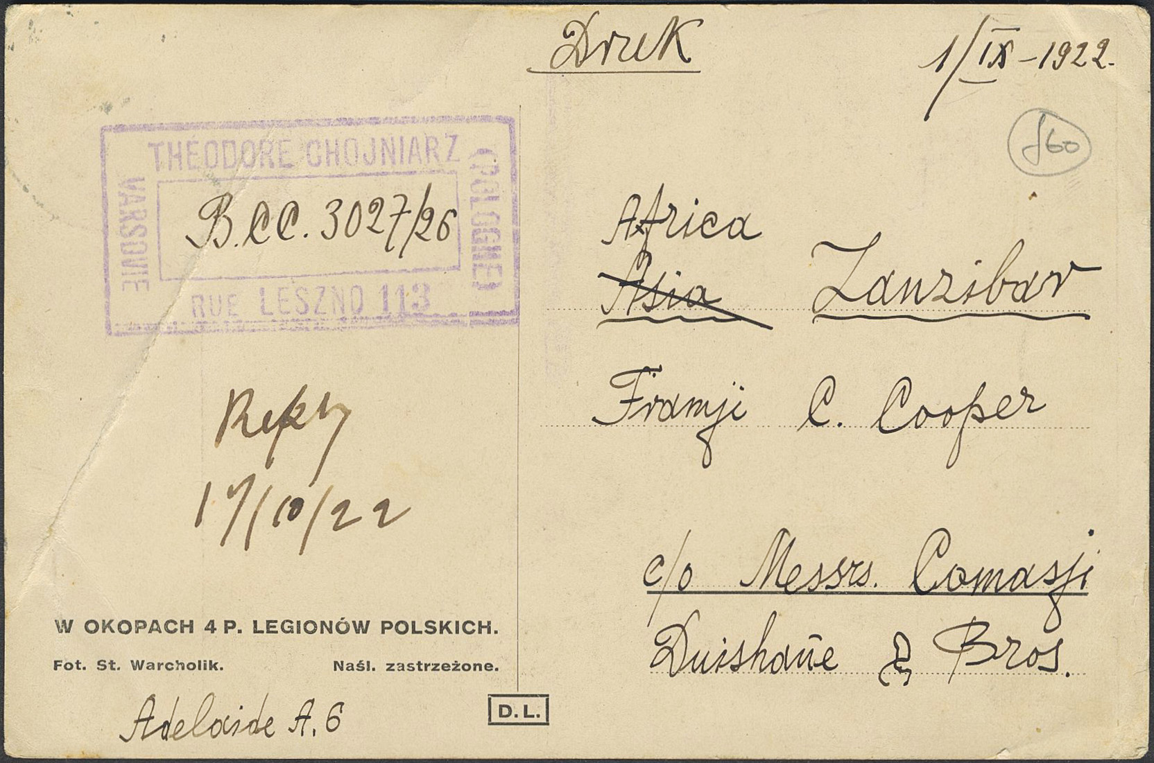Poland. Michel 158 on cover, 1921 Sower 10 M blue-grey 28 x 22 mm. Polish legation card sent to ZANZIBAR 1.OC.22. Weak creases. Unusual.