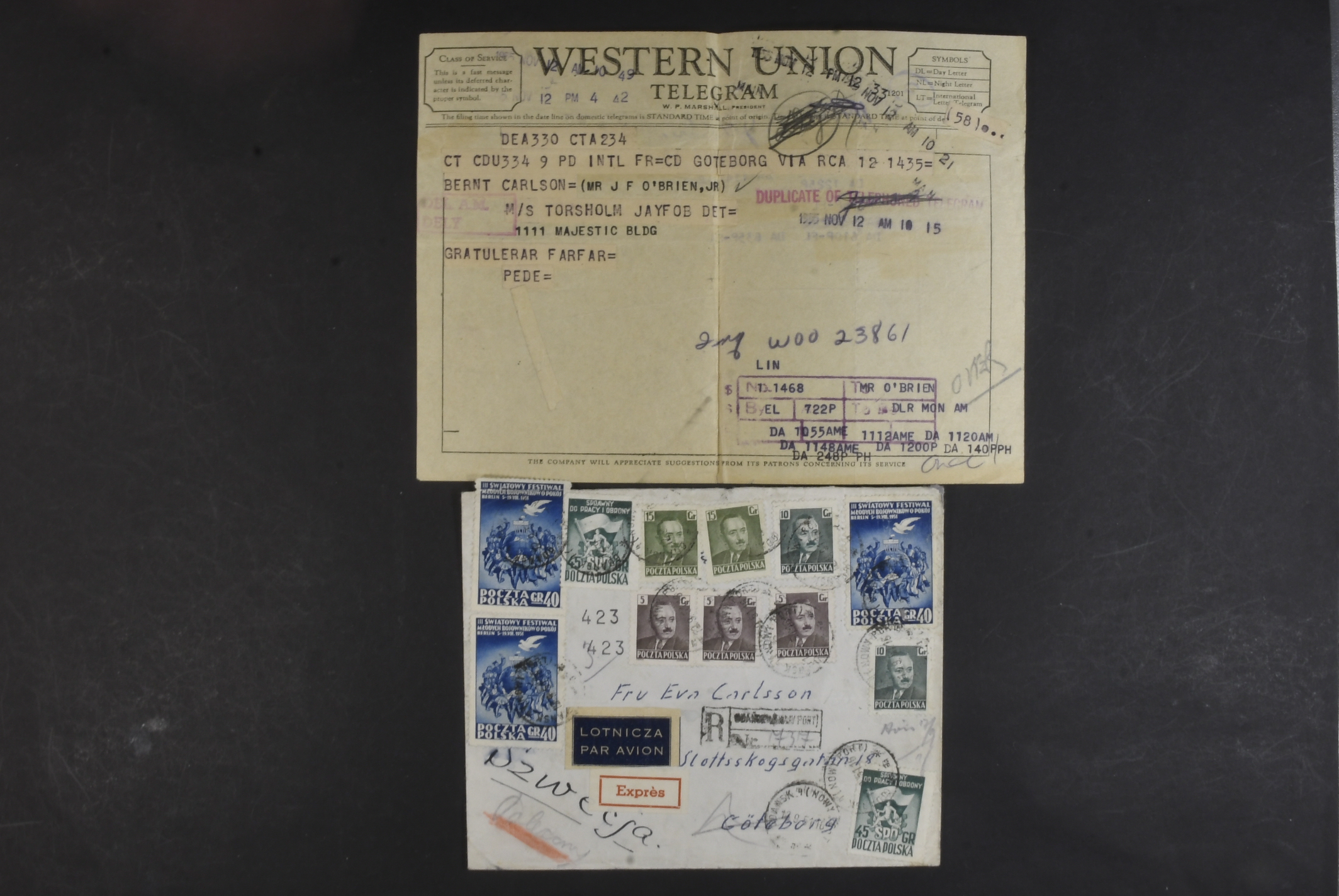 Poland. Cover, 1951 Reg. express cover GDANSK NOWY PORT sent to Sweden 1951. Also a telegram sent to the same person and Polish fieldpost stamps set of 3 and Red Cross Dachau s/s.