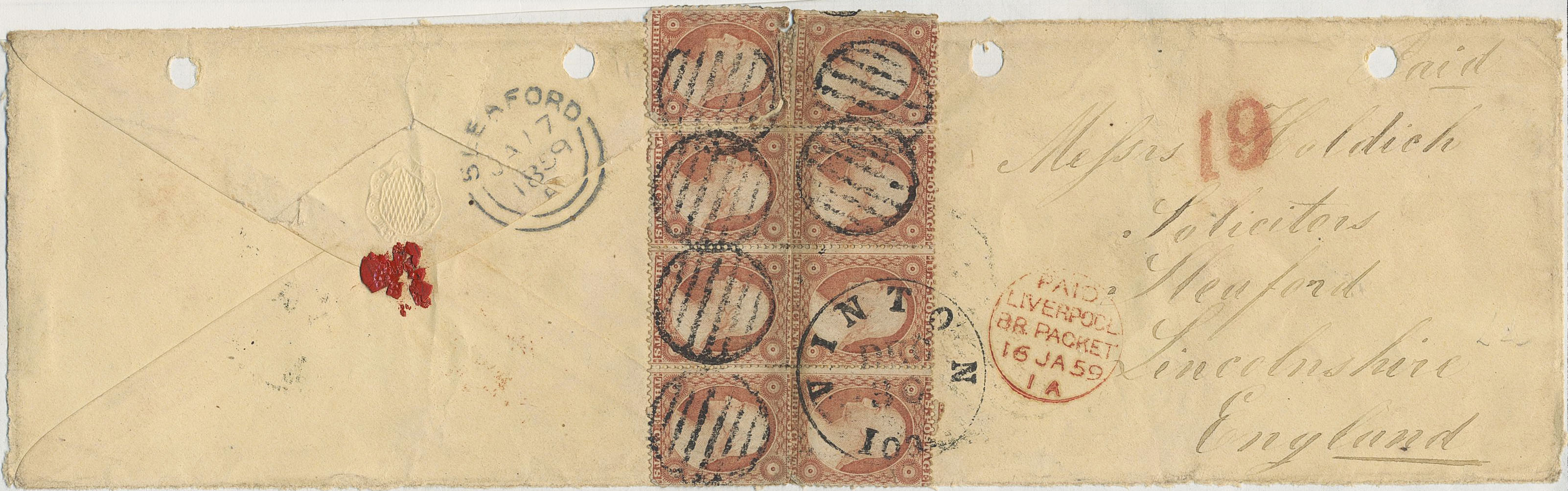 U.S.A. Sc 26 on cover, Washington 3c×8 on cover to Slealford, England. Four stamps in strips (or connected?) on each side of the cover. Tied by Winton Dec 30 1858 C.D.S. Arrival Liverpool and Sleaford. Scarce! Some faults incl. hole punched and opened for mounting.