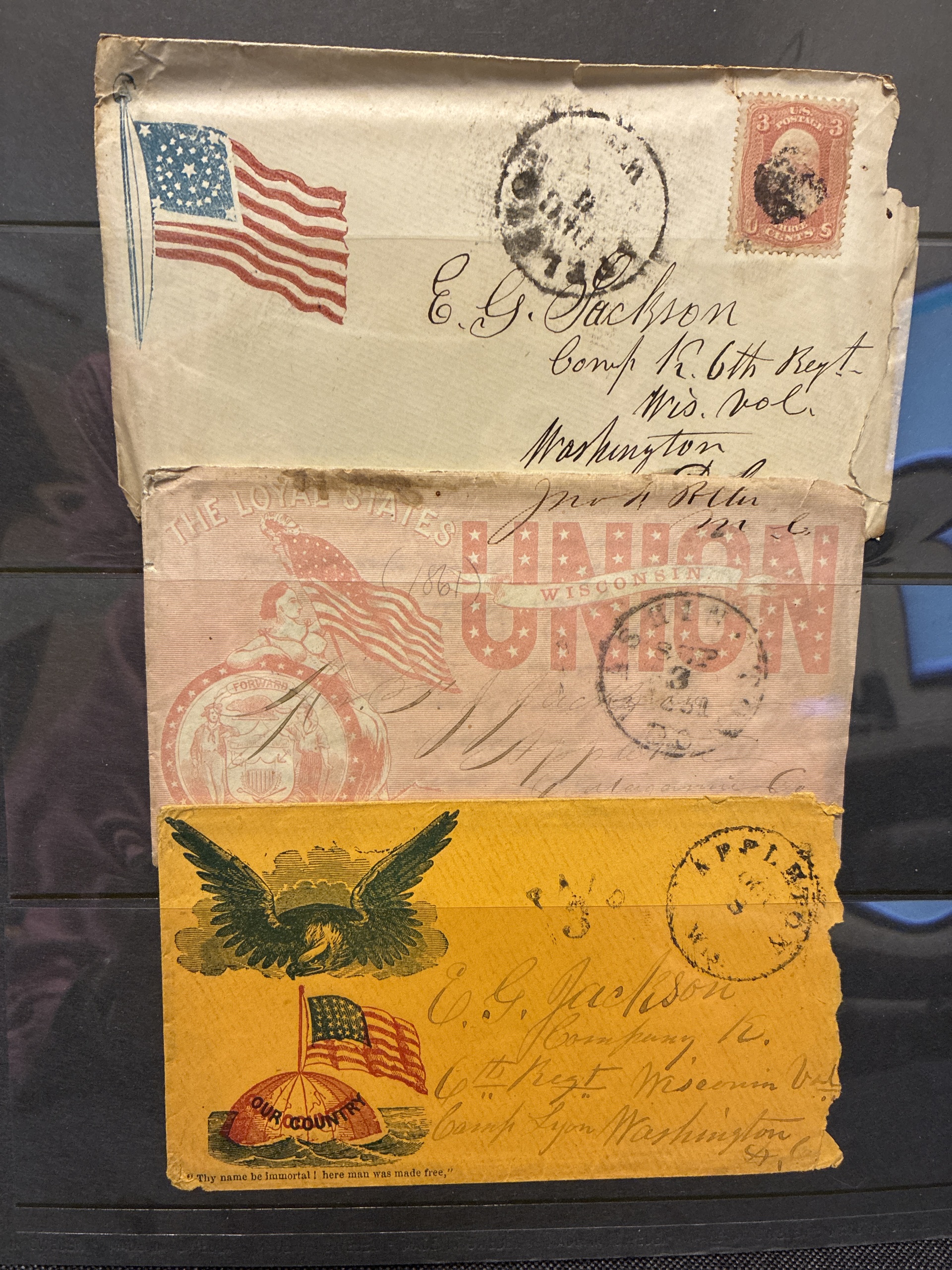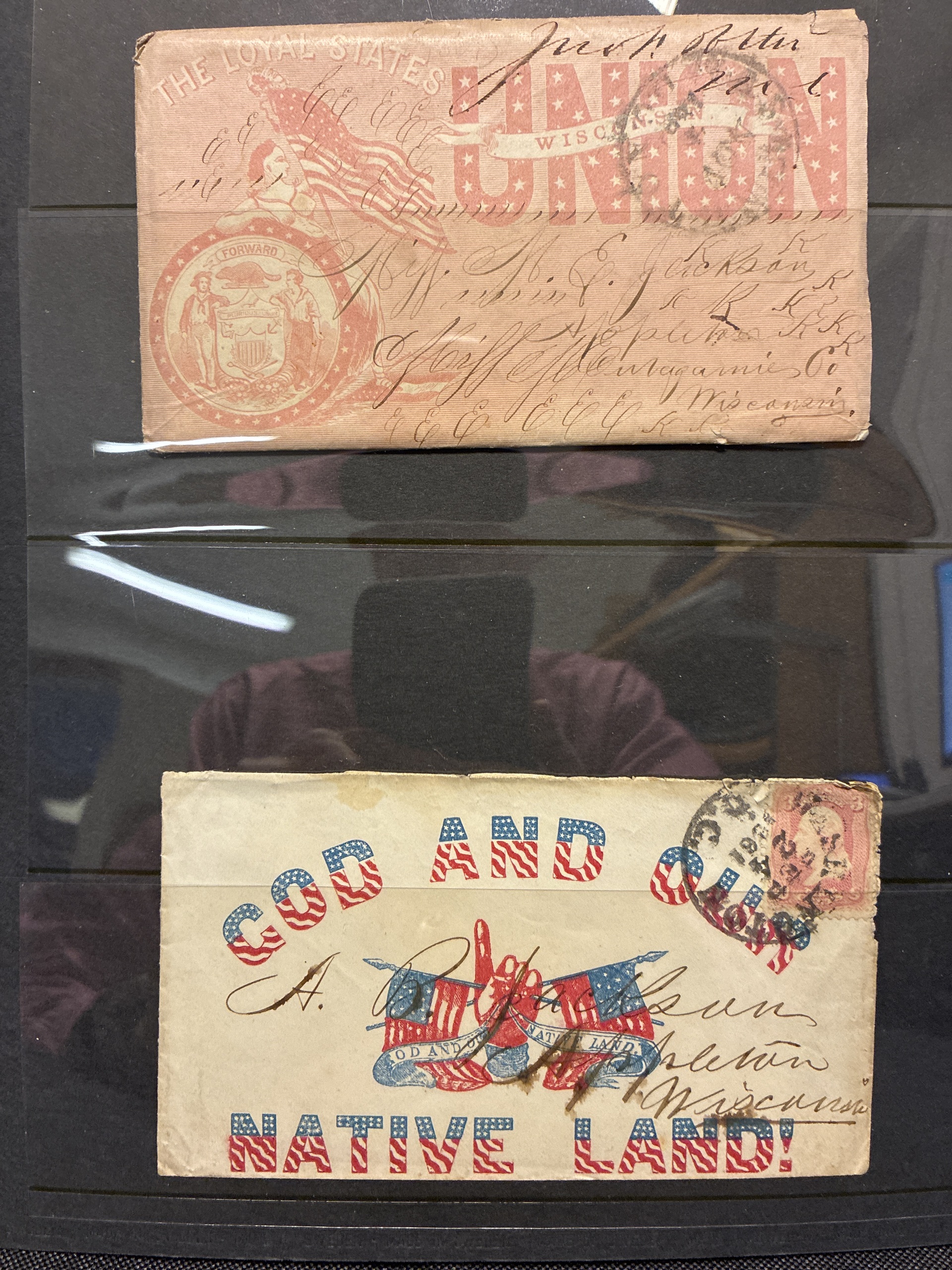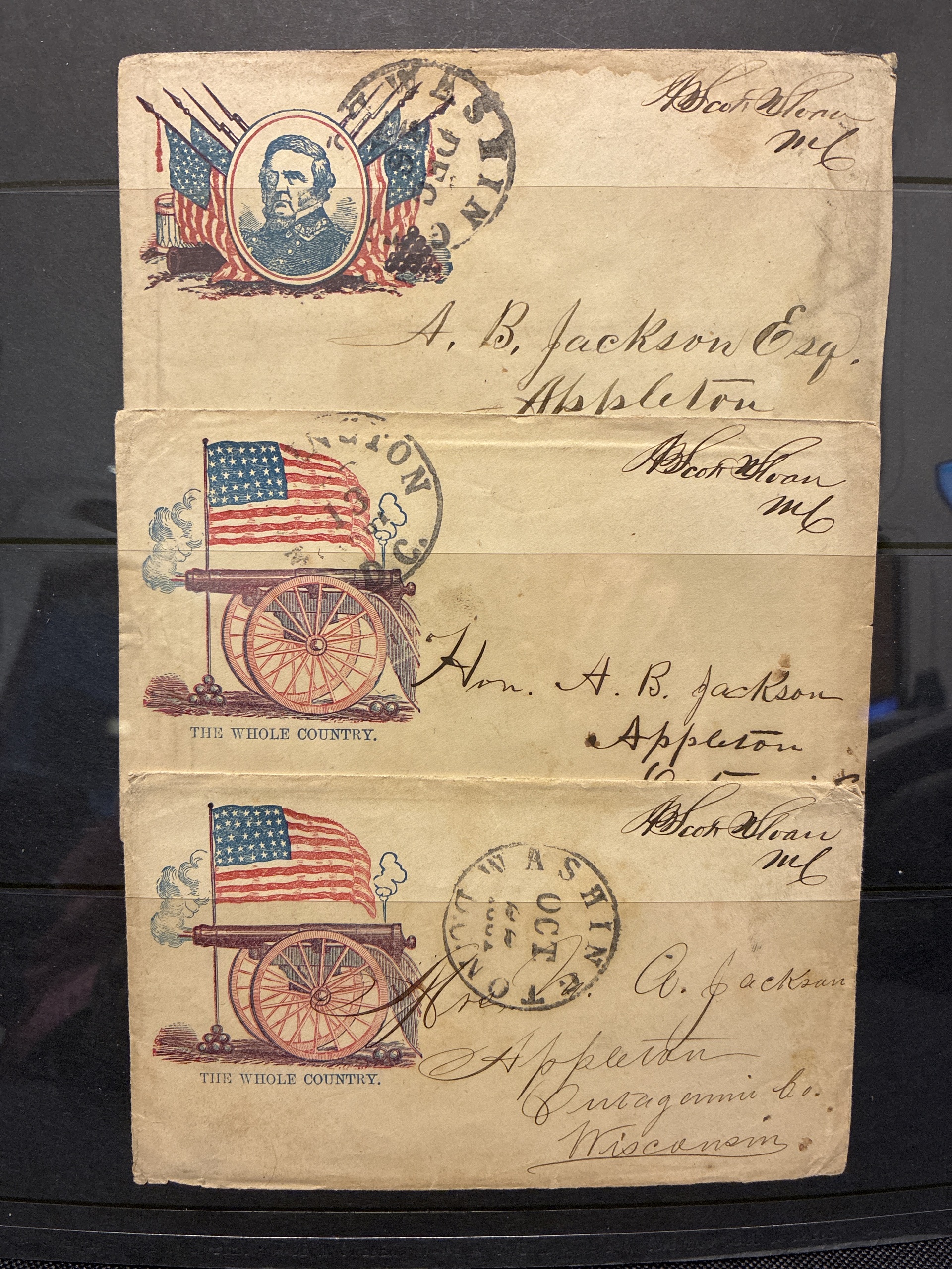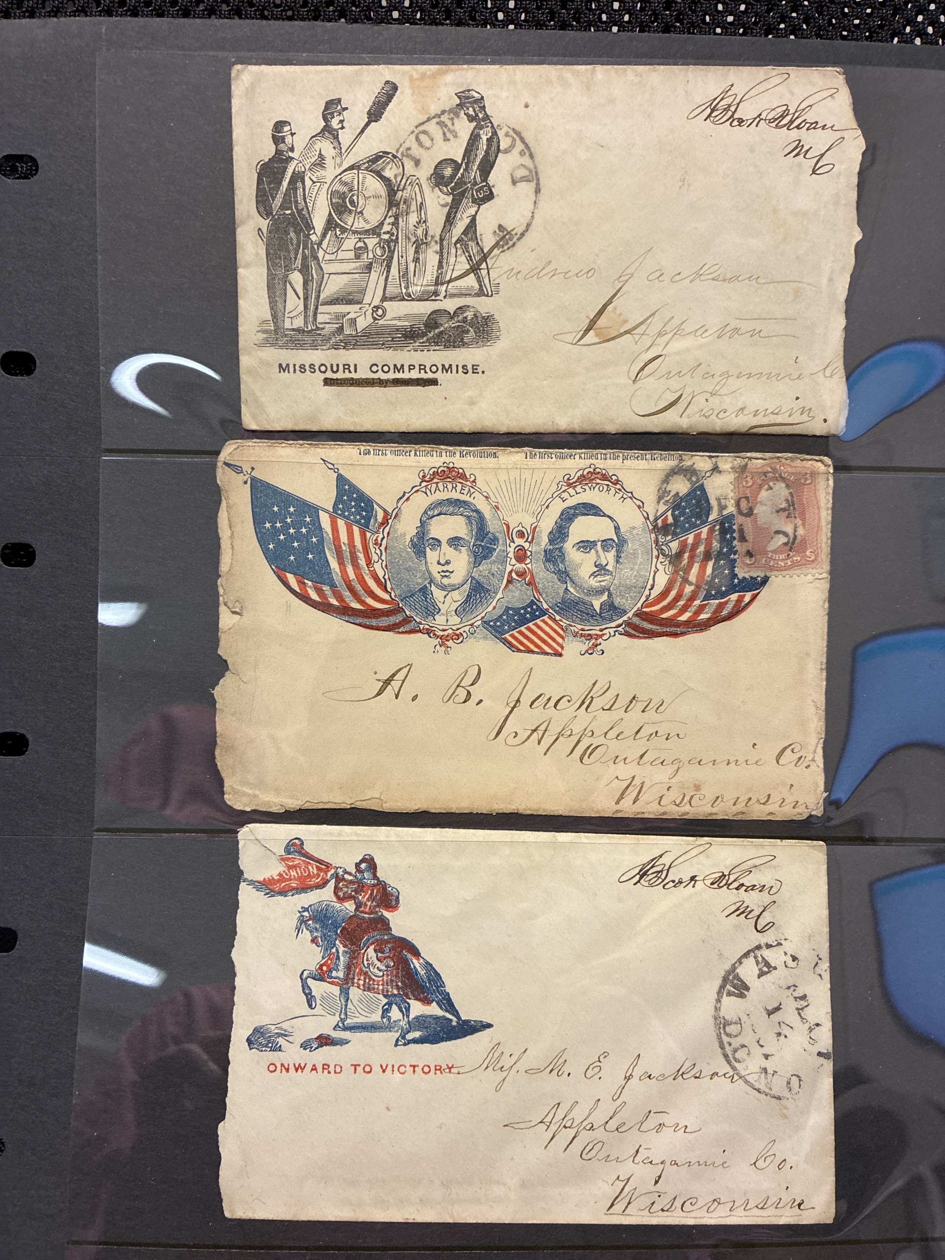 U.S.A. Lot covers ca. 1860 on leaves. Eleven patriotic covers. Three with stamps. Mostly cancelled WASHINGTON. The entire lot is presented at www.philea.se. Somewhat mixed quality. (11)