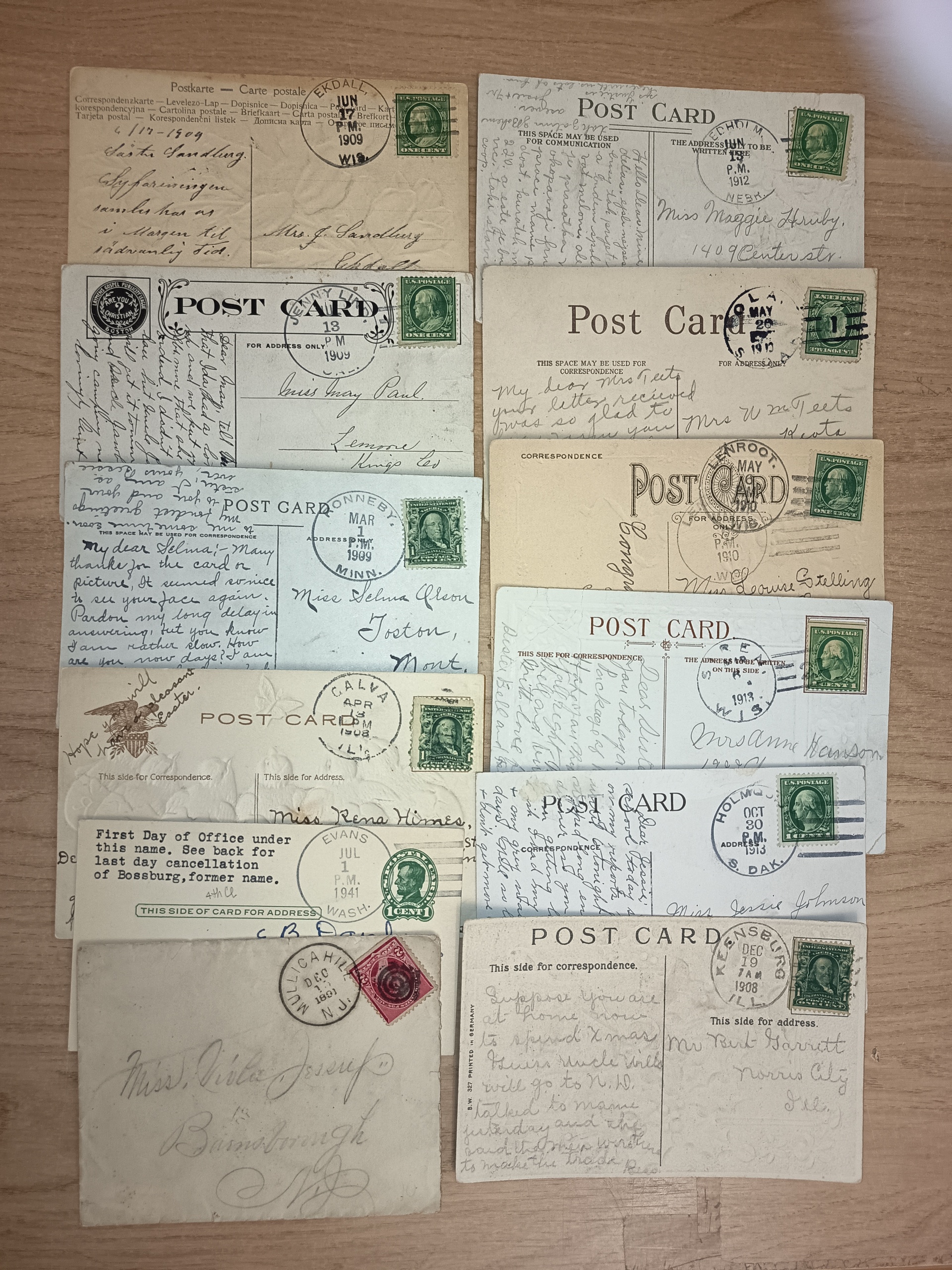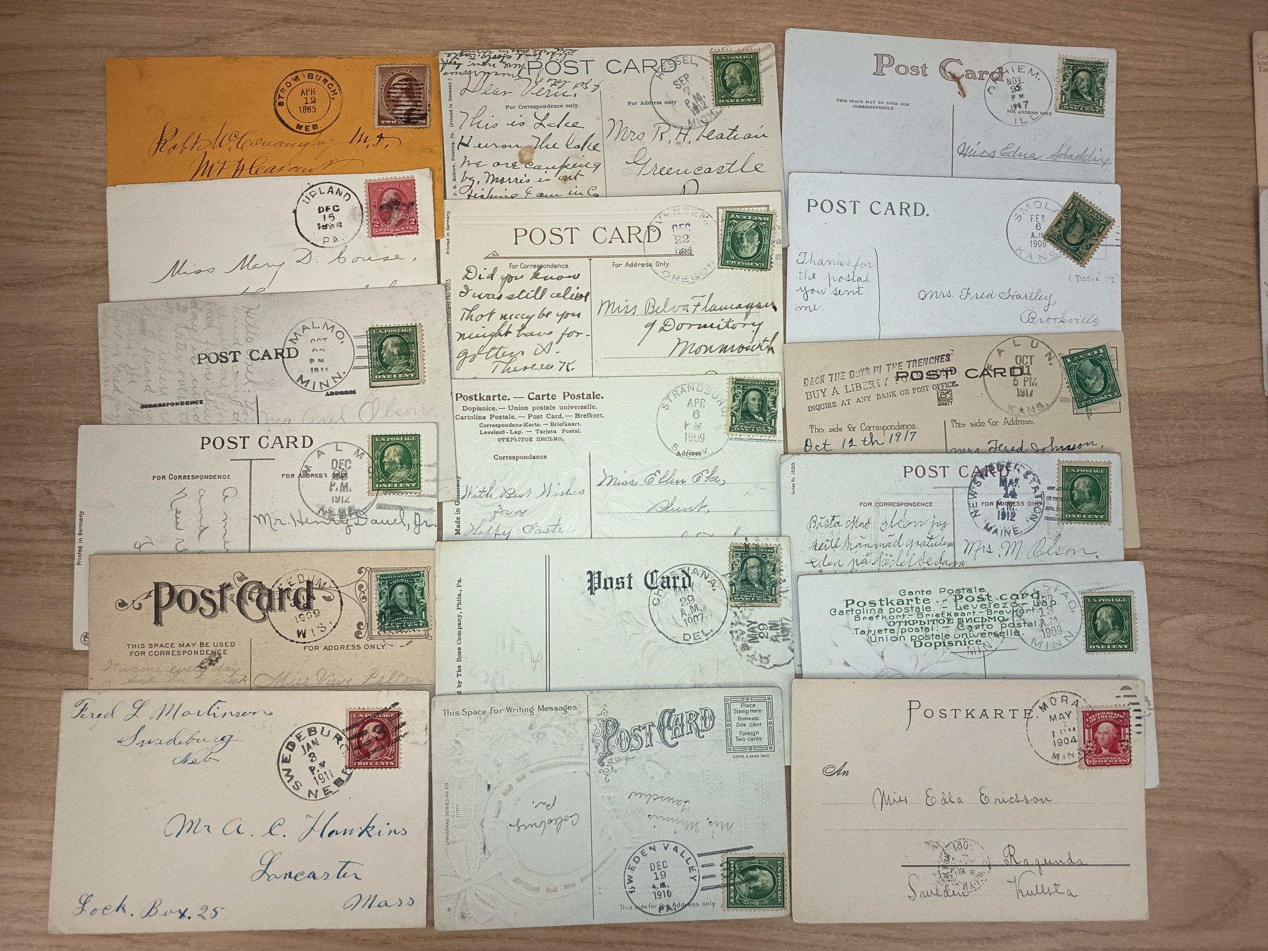 U.S.A. Covers. Lot 29 postcards an few covers, all with nice cancellations, e.g. Doane´s. Incl. places with Swedish names. Mostly good quality.
