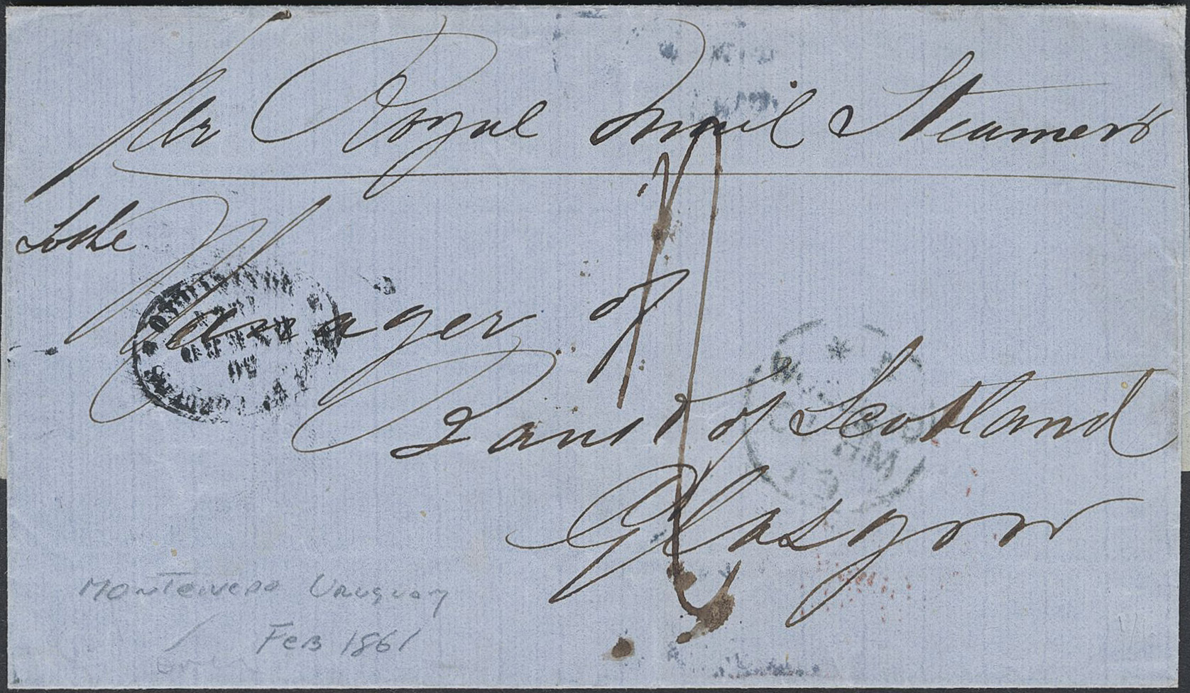 Uruguay. Prephilately. Letter sent from Montevideo 'pr Royal Mail Steamer' to LONDON 9.MR.61, to GLASGOW 10.MR.61.