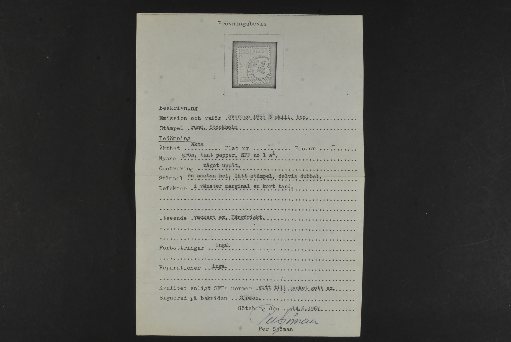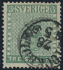 Sweden. Facit 1a used, 3 skill light bluish green (slightly short perf and folded corner perf). Cert. and signed Sjöman: Fine–very fine. SEK 50000