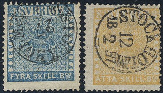 Sweden. Facit 2, 4 used, 4 skill blue and 8 skill yellow. Canc. Stockholm. Decent quality.