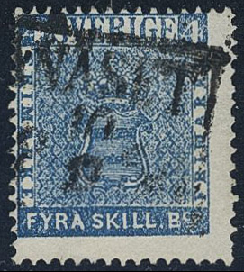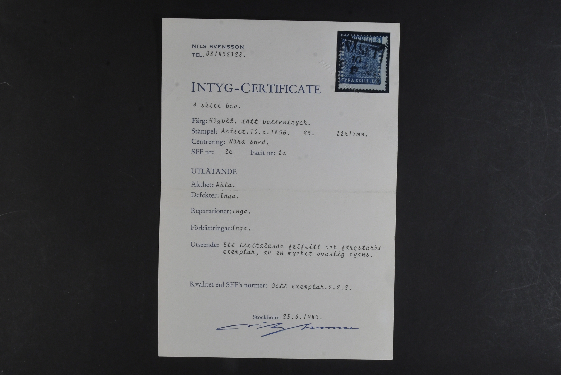 Sweden. Facit 2c used, ÅNÄSET 10.X.1856 on bright blue dense background. Certificate Nils Svensson Fine 2.2.2. SEK 2000