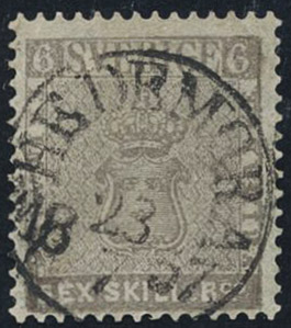 Sweden. Facit 3 used, 6 skill grey. Canc. HEDEMORA 23.7.1857. Space filler.