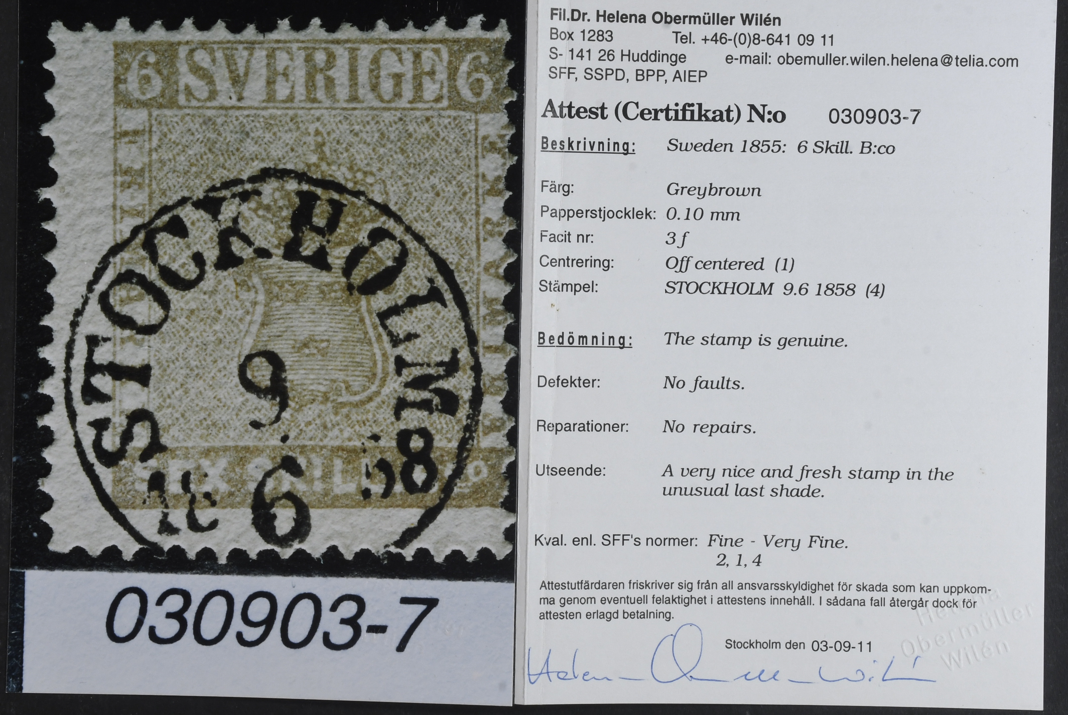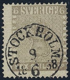 Sweden. Facit 3f used, 6 skill grey-brown on medium thick paper. Cert. HOW 2.1.4. No faults. Nice and fresh stamp. SEK 13000