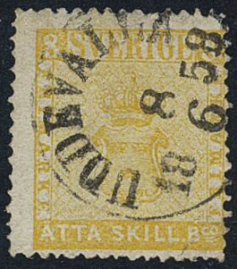 Sweden. Facit 4c used, 8 skill lemon-yellow. Canc. UDDEVALLA 8.6.1858. Space filler. SEK 25000