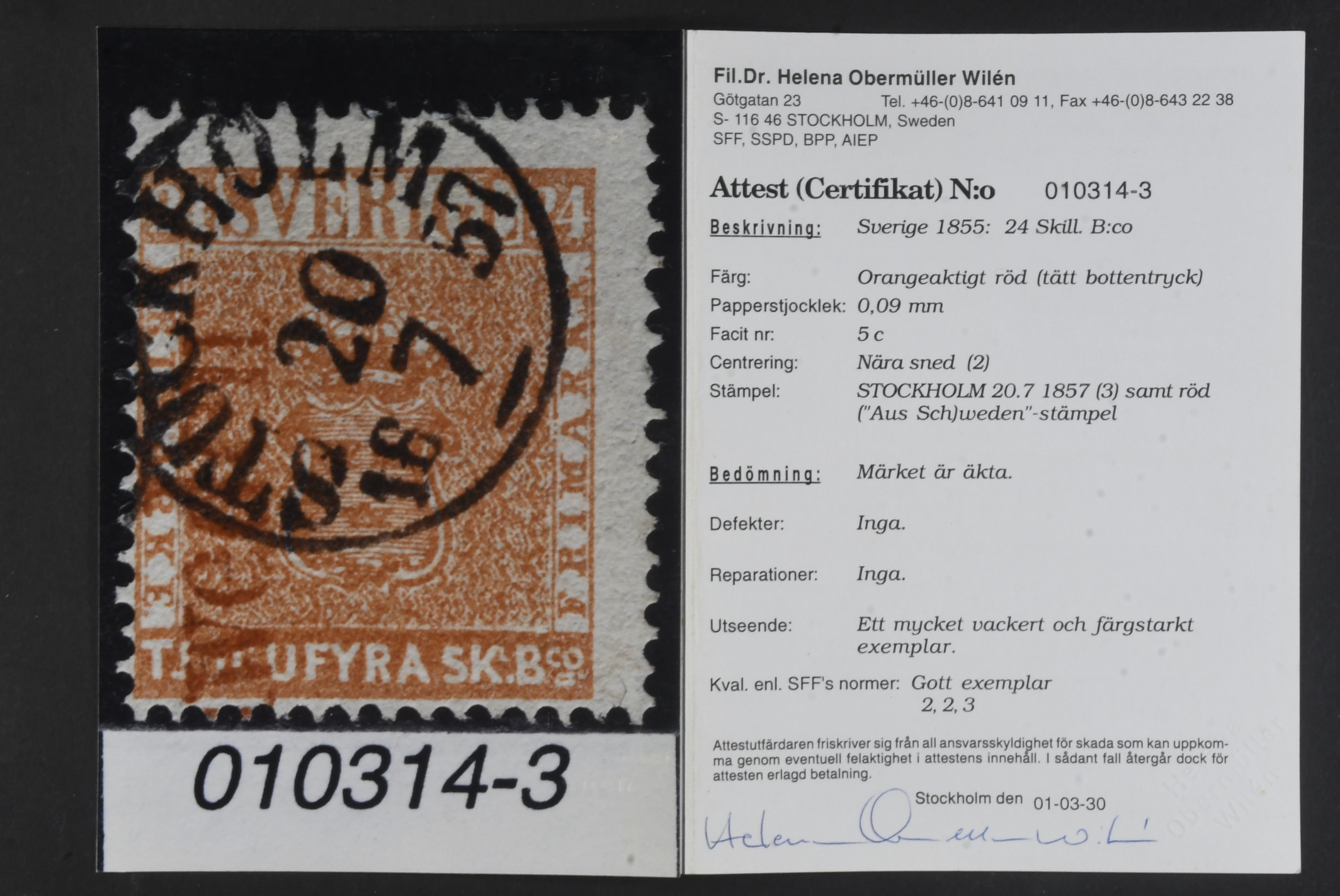Sweden. Facit 5c used, 24 skill brick-red with dense background on medium thick paper. Very beautiful example STOCKHOLM 20.7.1857 and red ("Aus Sch)weden. Cert. HOW: 2,2,3. SEK 18000