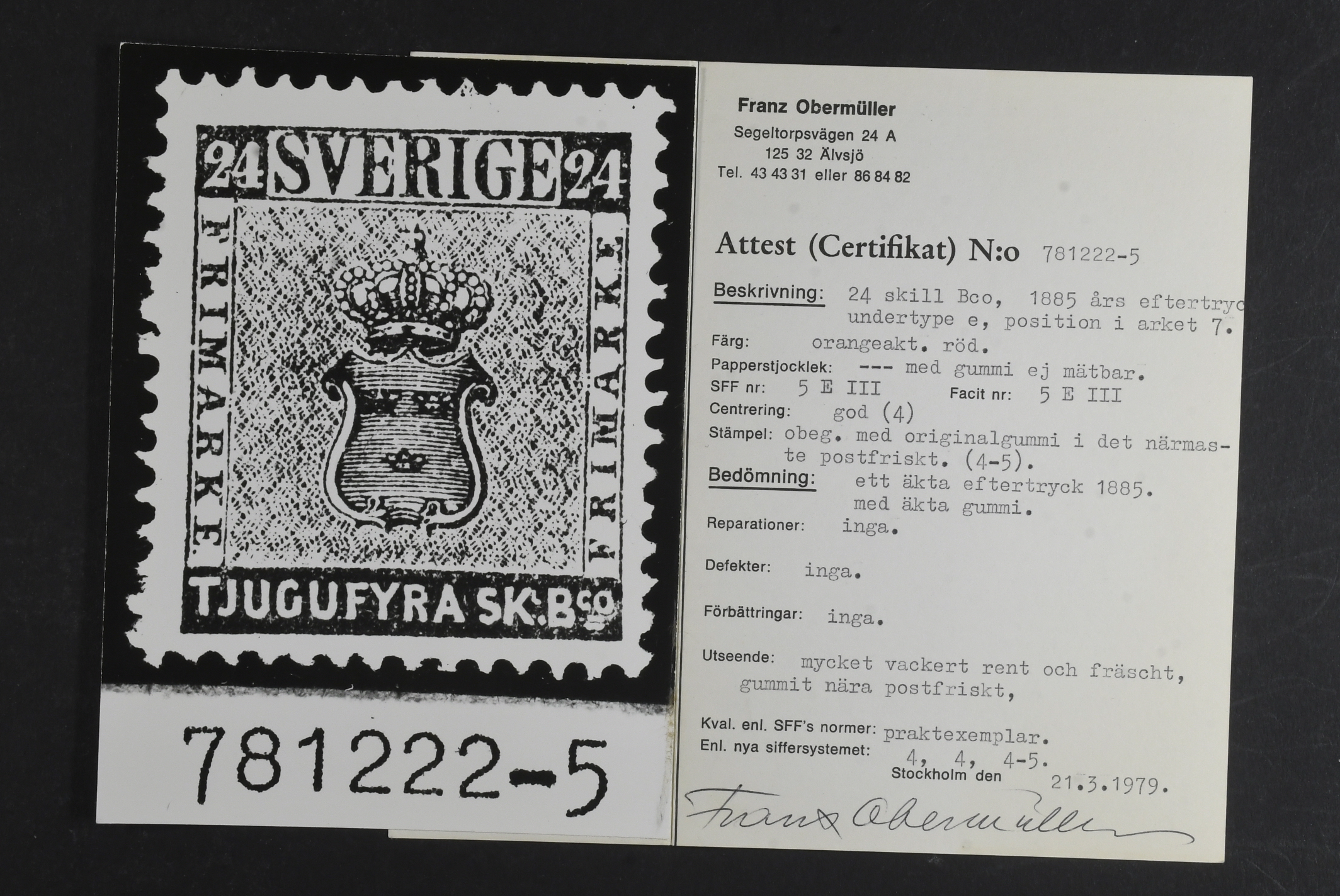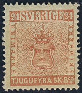 Sweden. Facit 5 E4 ★, 24 Skill red reprint 4. Certificate Franz Obermüller extra fine 4,4,4–5.