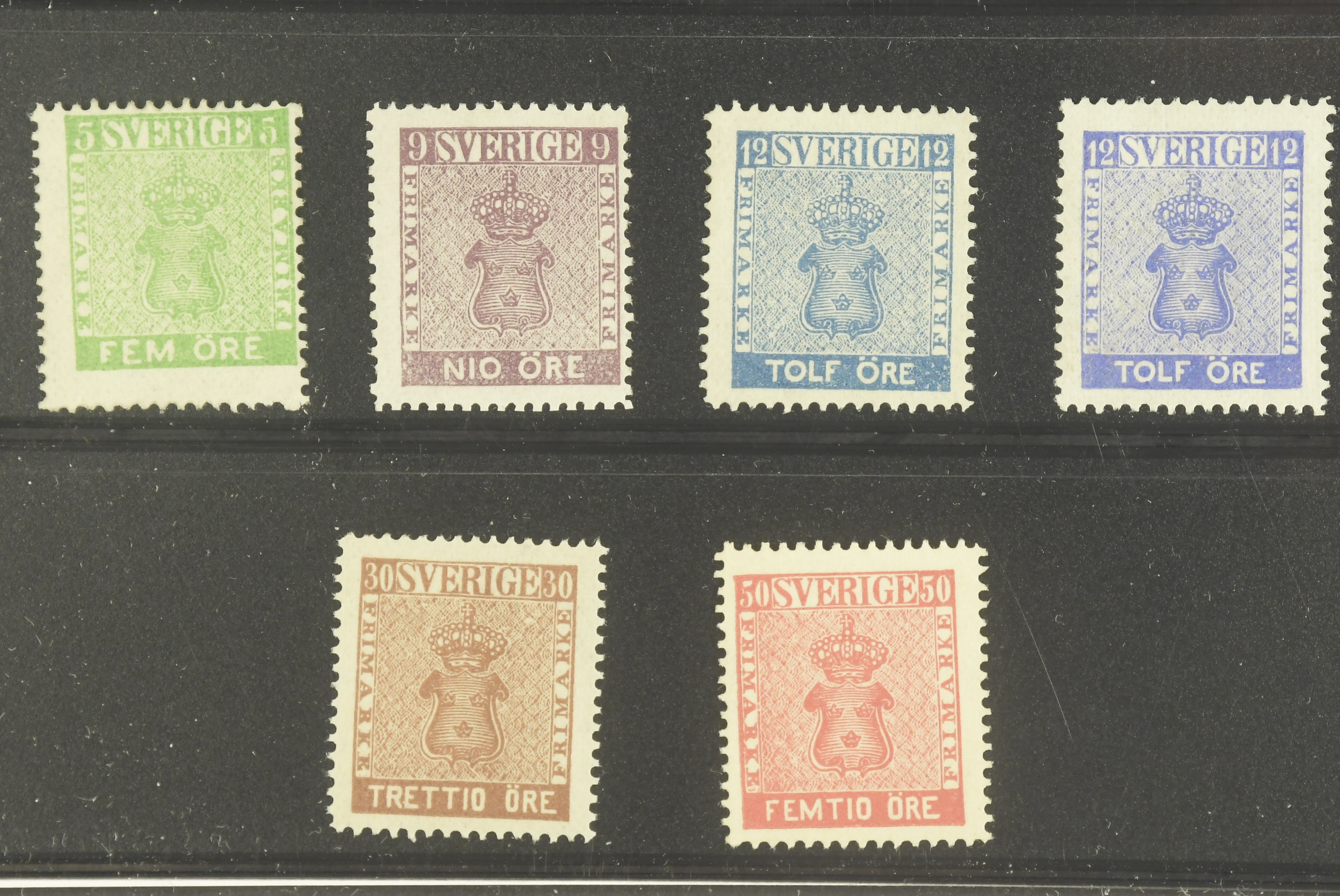 Sweden. Facit 7–12F ★★/★, 5–12 öre, SET (6) (no 24 öre, but one extra 12 öre) of 'PARIS FORGERIES'.